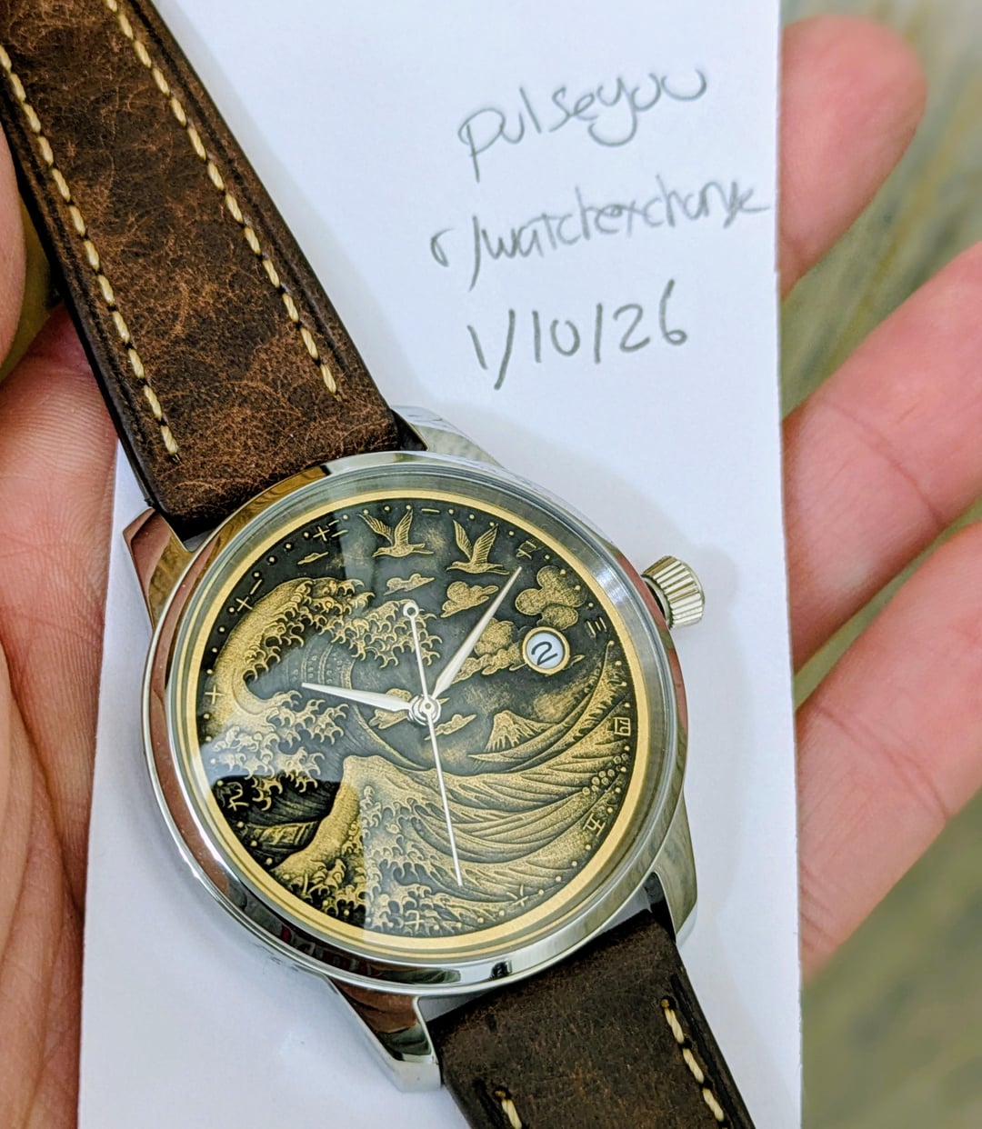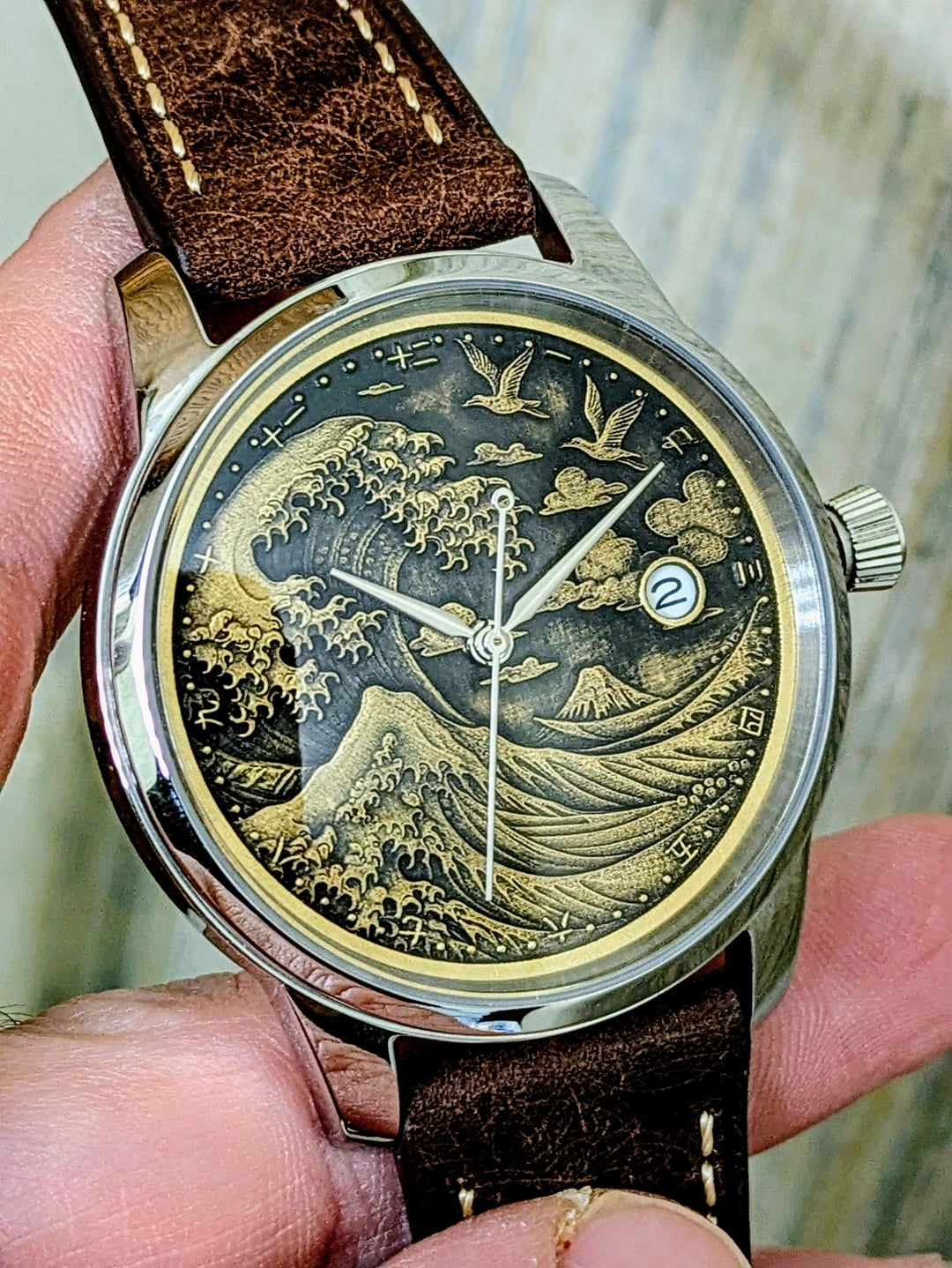 Good morning! For sale today we have a new CCW Model, the "Great Wave." This dial was designed and made by me on my 50w fiber laser. It has 256 layers to create a 3d effect on the dial, cut out of a 0.5mm sheet of jeweler's bronze, and then hand finished with a Brass Black, polish, and wax. The dial is a beautiful 35mm size and I have housed it in a 39mm dress watch case. Powering the watch is the NH35 automatic movement, an absolute workhorse. The watch features an open caseback with a gold adorned rotor. I have a brown, tan, black, or green leather straps available, as well as the Milanese bracelet. This watch can come in a stainless steel, two tone, or yellow gold case. **I have both the open heart, date, day/date, and non open heart versions available.** *All of my watches are completely customizable so if you would like to change anything about the watch please shoot me a message and would be happy to create something custom to fit your needs, or customize this dial further.* **Specs** Case Size: 39mm dress case w/ open caseback and 20mm lugs. Dial: Custom designed, lasered, and hand finished 35mm dial, 256 layers, for a video of this dial being made please see my IG linked below. Movement: NH35 Movement w/ 41+ hour power reserve, hacking, 24 Jewels, and date function. Open caseback with adorned rotor. 12.5mm Thickness Comes with a travel watch pouch for safekeeping :\] **Condition** Everything is brand new and ready to be shipped. Watch was custom-built by me to the highest quality. Message me if you have any questions. **Asking** $299 (leather strap) or $330 (milanese bracelet) shipped to CONUS. Will ship to other countries please contact me with location and I'll see what I can do. Payment via Venmo, Zelle, Cashapp, or Paypal+3%.