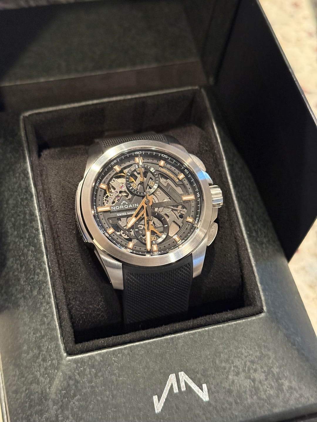 Hello r/watchexchange, I’m offering up for sale a Norqain Independence Skeleton Chronograph 42mm in excellent condition Complete with warranty activated 11/2024 Images/ Timestamp included in the post Price: $3800 (retail $7150) Payment: Zelle or Venmo Shipping: US only $75 Thank you for your interest