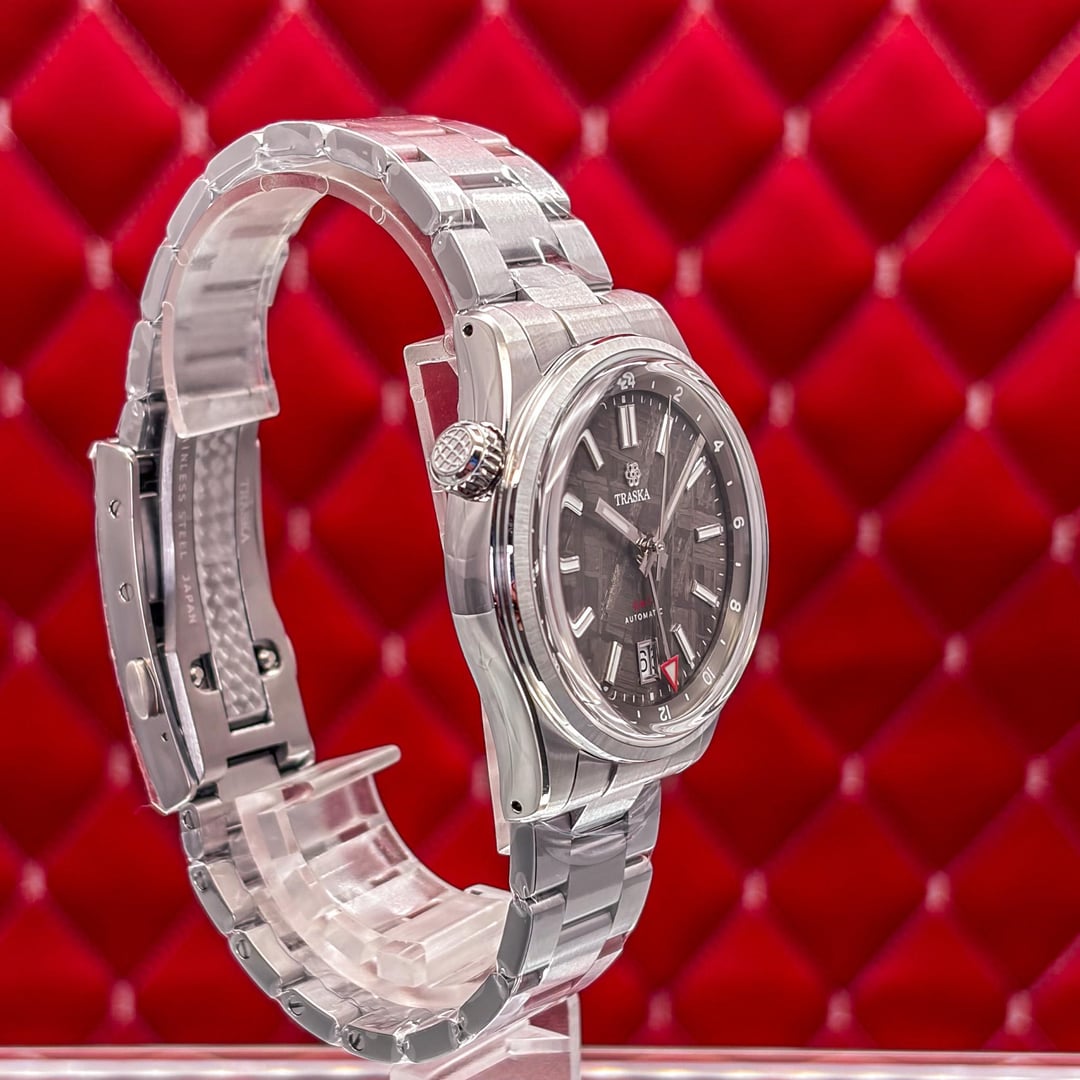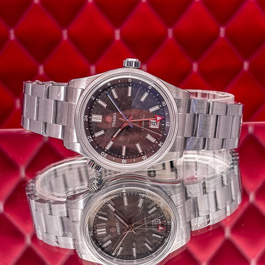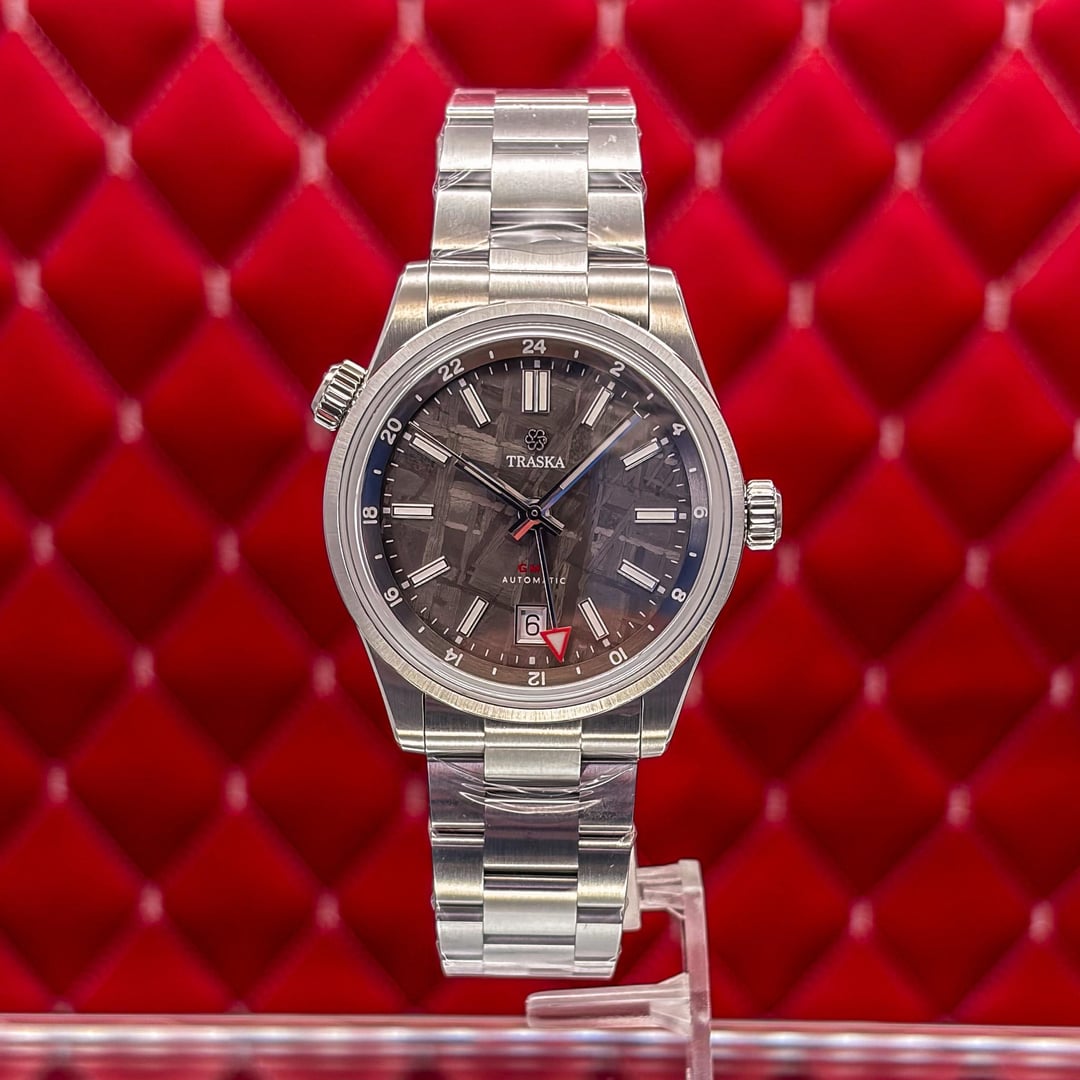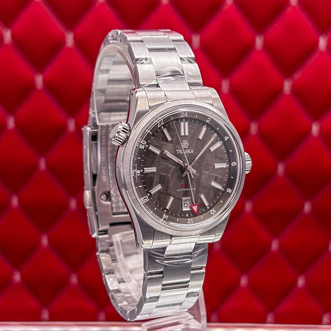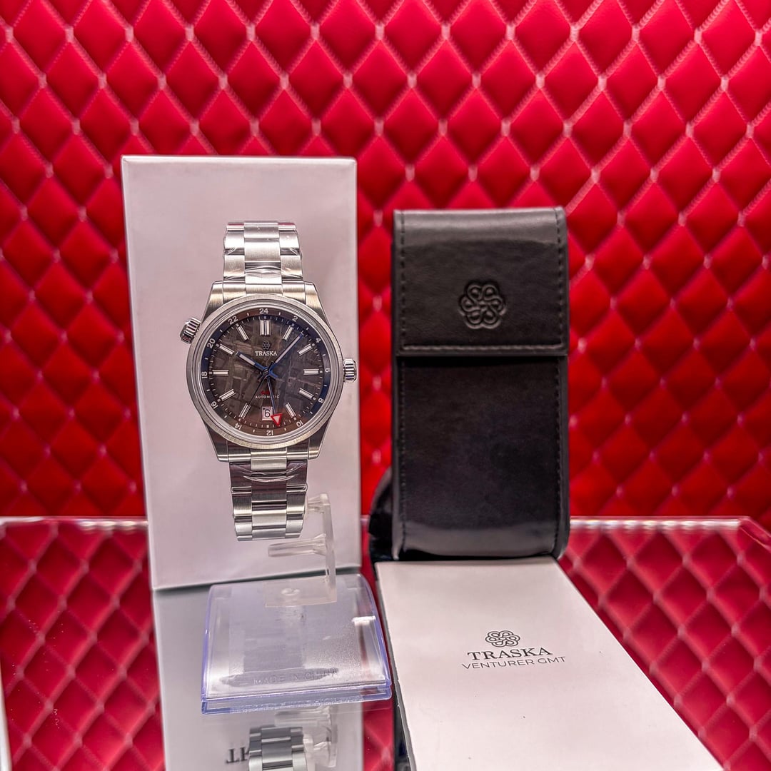 🏒🥅🚨 Traska Venturer GMT – Meteorite Dark – Limited Edition This timepiece is in very good condition. This Traska Venturer GMT Meteorite Dark is a sophisticated limited-edition traveler’s watch that pairs a 4.5 billion-year-old Muonionalusta meteorite dial with a rugged, hardened steel case. It features a "true" flyer GMT function powered by the regulated Miyota 9075 movement, allowing the local hour hand to be adjusted independently for seamless time zone changes. The entire watch is treated with a proprietary process that makes it nearly ten times more scratch-resistant than standard stainless steel, ensuring it maintains its refined aesthetic even with heavy use. This limited edition Traska Venturer GMT Meteorite Dark. This watch is highly sought after for its unique Muonionalusta meteorite dial, which has been electroplated to a dark anthracite finish that makes the natural Widmanstätten patterns truly pop. 💰 Price: 💲955 USD Condition & Photography Please review all photos for the most accurate representation of this watch's condition. Our macro photography is designed to capture every detail, including the smallest imperfections, ensuring you can buy with complete confidence. Shipping & Service We ship fully insured overnight via FedEx for your peace of mind. We are happy to arrange a video call to show the watch and answer any questions—just reach out anytime. We guarantee the authenticity and accuracy of all our timepieces. Your satisfaction is our highest priority, and we strive for a smooth, transparent, and 100% positive transaction. As a dedicated hockey coach and passionate timepiece collector (@pucks\_timepieces), I've spent years immersed in the world of horology. I now combine this passion with my hockey-playing daughters, and together we create the unique presentations you see here. Our photography is inspired by contemporary artists like KAWS, Banksy, Joan Cornellà, Death NYC, and Shepard Fairey. This artistic approach adds a distinctive, creative character to how each watch is presented. When you purchase from me, you can expect a seamless experience. I'm highly responsive and happy to provide extra photos or details to ensure you feel great about your purchase. Timestamps: [https://drive.google.com/file/d/19peey\_rYJCx8dJighrKy5URXQuICvoKF/view?usp=sharing](https://drive.google.com/file/d/19peey_rYJCx8dJighrKy5URXQuICvoKF/view?usp=sharing) & [https://drive.google.com/file/d/1BiAMFAXyYQq3MwJeGXZFlq4mv4cWzfQK/view?usp=sharing](https://drive.google.com/file/d/1BiAMFAXyYQq3MwJeGXZFlq4mv4cWzfQK/view?usp=sharing)