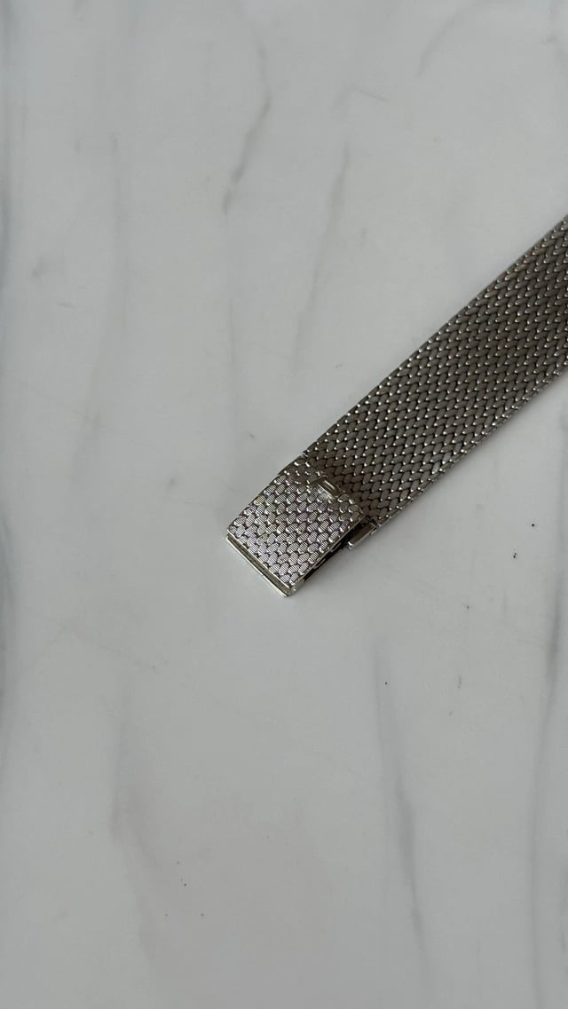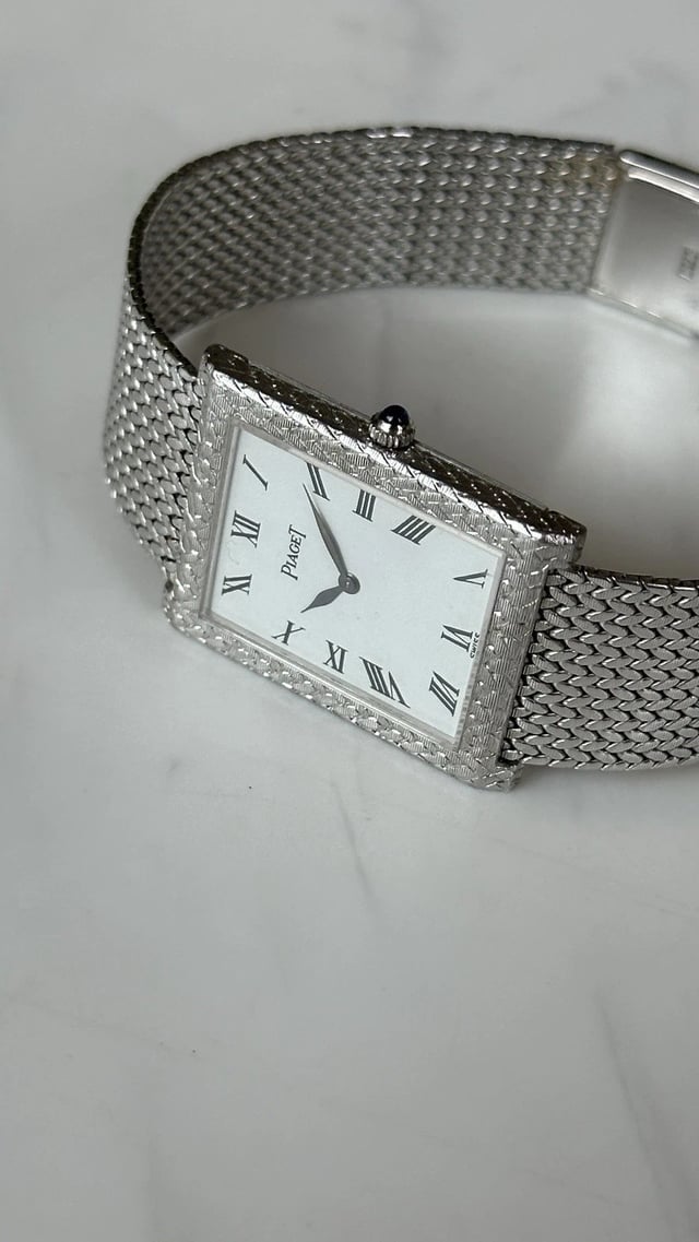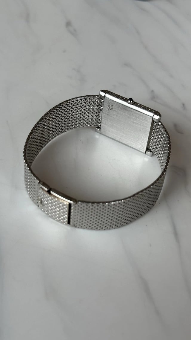 WTSa beautiful example of a Piaget tank style watch crafted In solid 18ct white gold with original and matching 18ct white gold bracelet. The case has a factory finish to the top and sides that matches the mesh bracelet and overall has no major scuffs or marks. The vivid white dial is flawless with printed Roman numerals and perfectly preserved sword hands. The bracelet has a luscious feel and is very comfortable on the wrist, and can accommodate wrists up to around 7.5 inche. The ‘P’ on the clasp is very prominent and the entire watch appears to be unpolished. The movement, the Piaget 9P2 is running well and keeping good time. Price : $3900. F2F deal with hand delivery around most of LA Thanks
