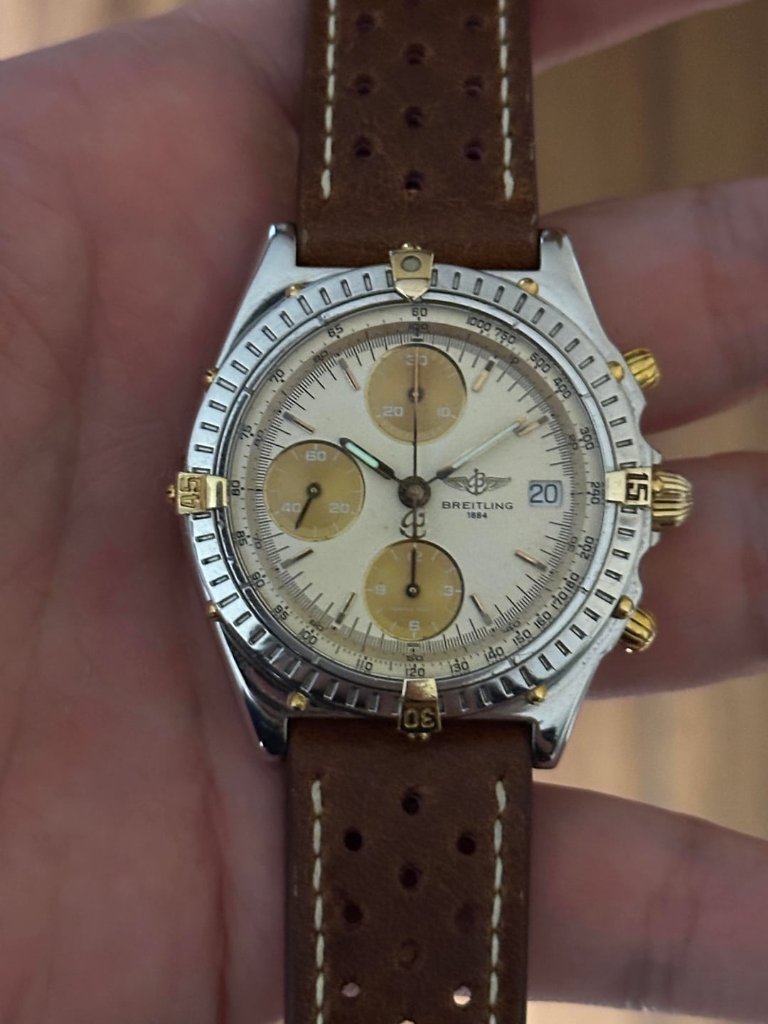 Up for sale is the 1990s Breitling Chronomat B13050 in great serviced condition. Images: https://drive.google.com/drive/folders/16t22dvgetYaCXBywtIc9HQJsjQuGI6bw Video: https://drive.google.com/file/d/1CWLBOPRAmt6UTJKDWoEy0SOwsJzOuJlg/view?usp=drivesdk Timestamp: https://drive.google.com/file/d/1eXqcqj3D5i7uj4REZNz_NTs7sHOMwdUA/view?usp=drivesdk The Breitling Chronomat is a cornerstone of modern Breitling and a symbol of the brand’s resurgence after the quartz crisis of the 1970s and 80s. Deeply rooted in aviation, engineering, and performance, the Chronomat embodies everything a high-end Swiss tool watch should be—functional, robust, and unmistakably bold. Reference B13050.1 belongs to what many collectors consider the golden age of the Chronomat. Produced in the mid-1990s, this era retained a purely mechanical identity and a highly wearable 39mm case, long before modern Chronomats grew in size. On the wrist, it strikes a rare balance between vintage proportions and confident presence. The instantly recognizable design is highlighted by the iconic rider-tab bezel, fitted with four solid 18k yellow gold blocks at 3-6-9-12. These serve both form and function—allowing easy bezel operation, protecting the sapphire crystal from impact, and offering excellent grip even when worn over gloves. It’s a clever and purposeful design that has become synonymous with Breitling. The ivory white dial features a classic tri-compax chronograph layout, true to the original Chronomat design. Clean sub-dials contrast beautifully against the dial, while the raised tachymeter and minute scales add subtle depth and visual interest. Luminous hands and markers ensure legibility in all conditions, staying true to the watch’s tool-watch DNA. Powering the watch is Breitling Caliber 13, a COSC-certified automatic chronograph based on the legendary Valjoux 7750. Known for its stability, durability, and ease of servicing, it offers a 12-hour chronograph, date at 3 o’clock, and dependable everyday performance. Water resistance is rated at 100 meters, making it perfectly suitable for regular wear. The watch is in excellent condition, with no scratches nor dents. The crystal is clear and clean with very clear unaffected AR coating, dial is flawless. It comes on custom leather straps with original Breitling buckle. The movement has recently been serviced and is keeping excellent time at +/-5s a day. It comes with standard watch box, no papers. Price: $1750 + $60 flat shipping (via DHL/UPS express - tariffs/duty fee covered). Payment via PayPal F&F or G&S (+4.6% fee paid by the buyer). Not accepting trades. Feel free to message me with any questions or if you’re interested. Have a great day! Check out my other watches on Instagram: @jasonswatchcorner
