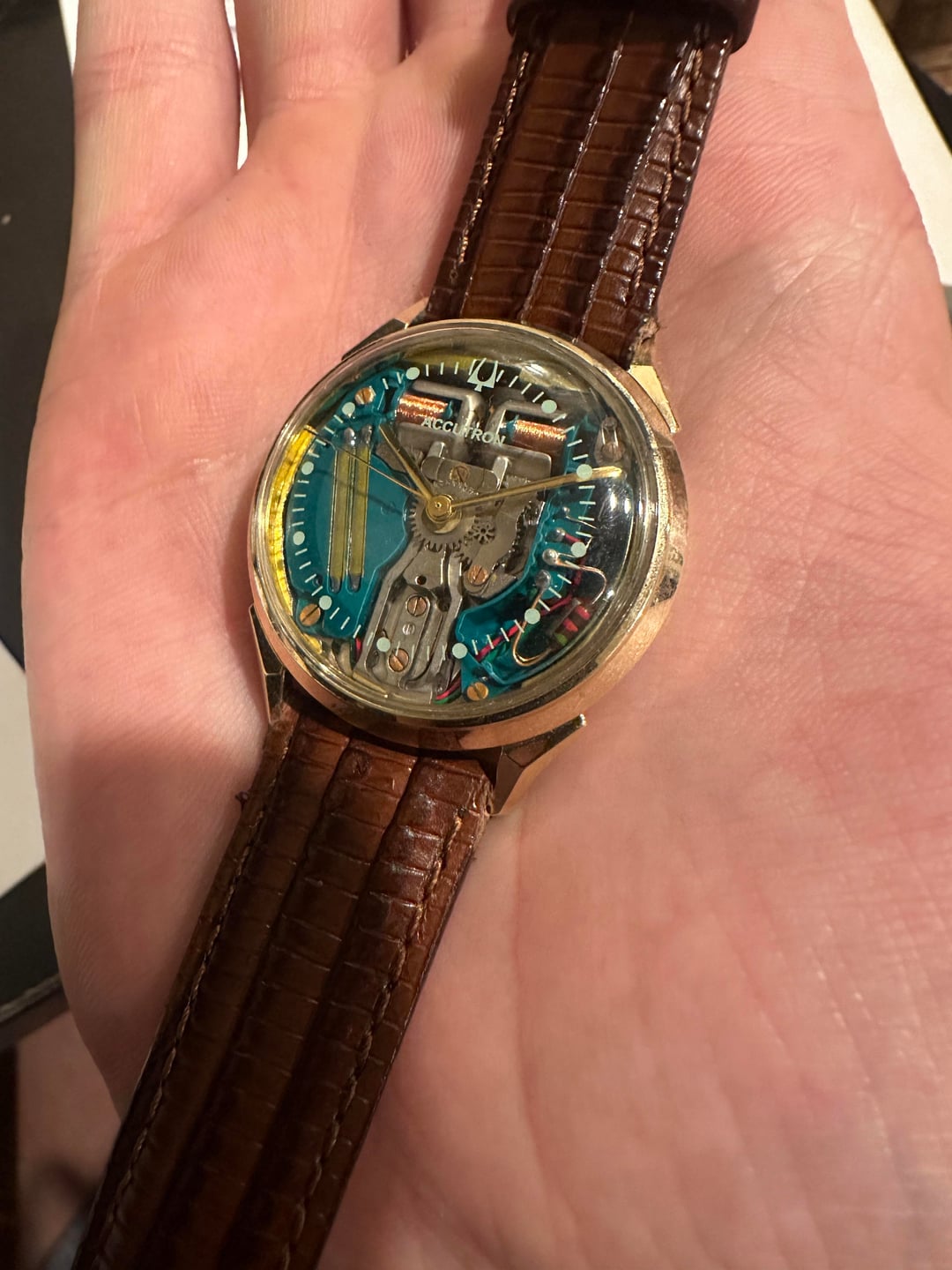 For sale is a vintage 1968 Bulova Accutron open-dial wristwatch, a striking example of mid-century horological innovation. This model features a transparent dial exposing the iconic Accutron tuning-fork movement, allowing the coils and electronics to be viewed in operation. The case is 10K gold filled with a stainless steel caseback, with an engraving for 25 years worked at Owens Illinois, who are still around today! This is one of the most visually interesting Accutron designs and remains highly collectible. The watch presents well with normal vintage wear consistent with age. Fitted with a genuine leather 18mm strap. A fantastic piece for collectors or anyone who appreciates early electronic watchmaking. Running well, service history is unknown. Comes with a leather strap and a spiedel bracelet. Asking $799 shipping from NYC - can also meet face to face. Happy to answer any questions, i accept Venmo, Zelle, cashapp or PayPal f&f.