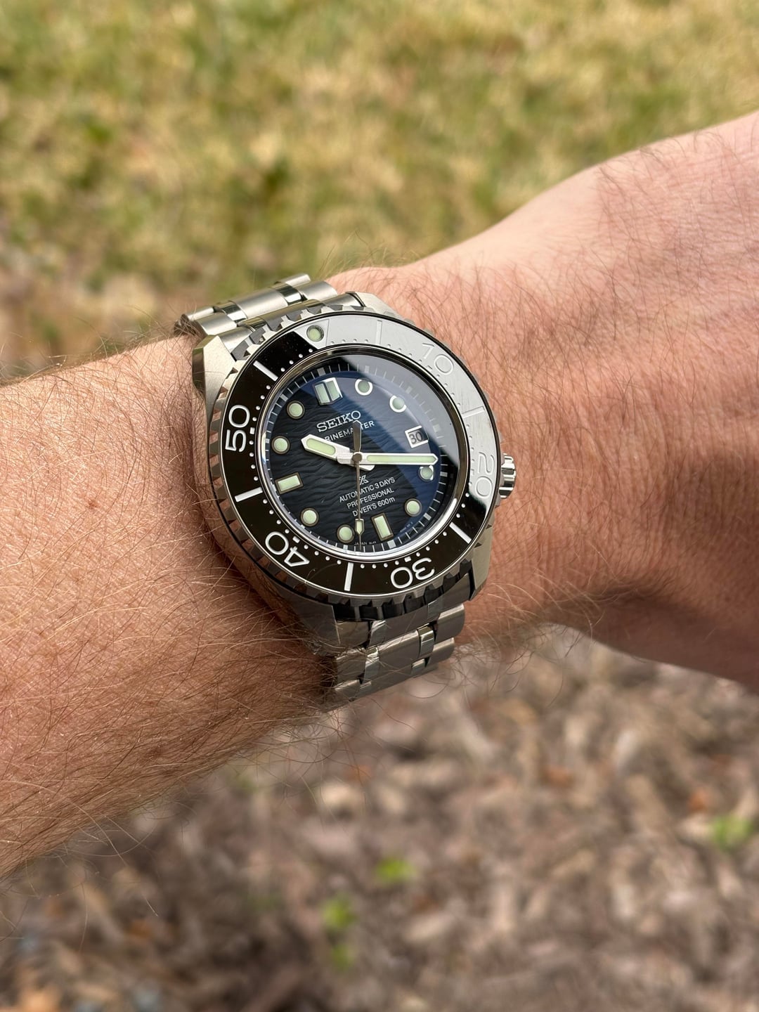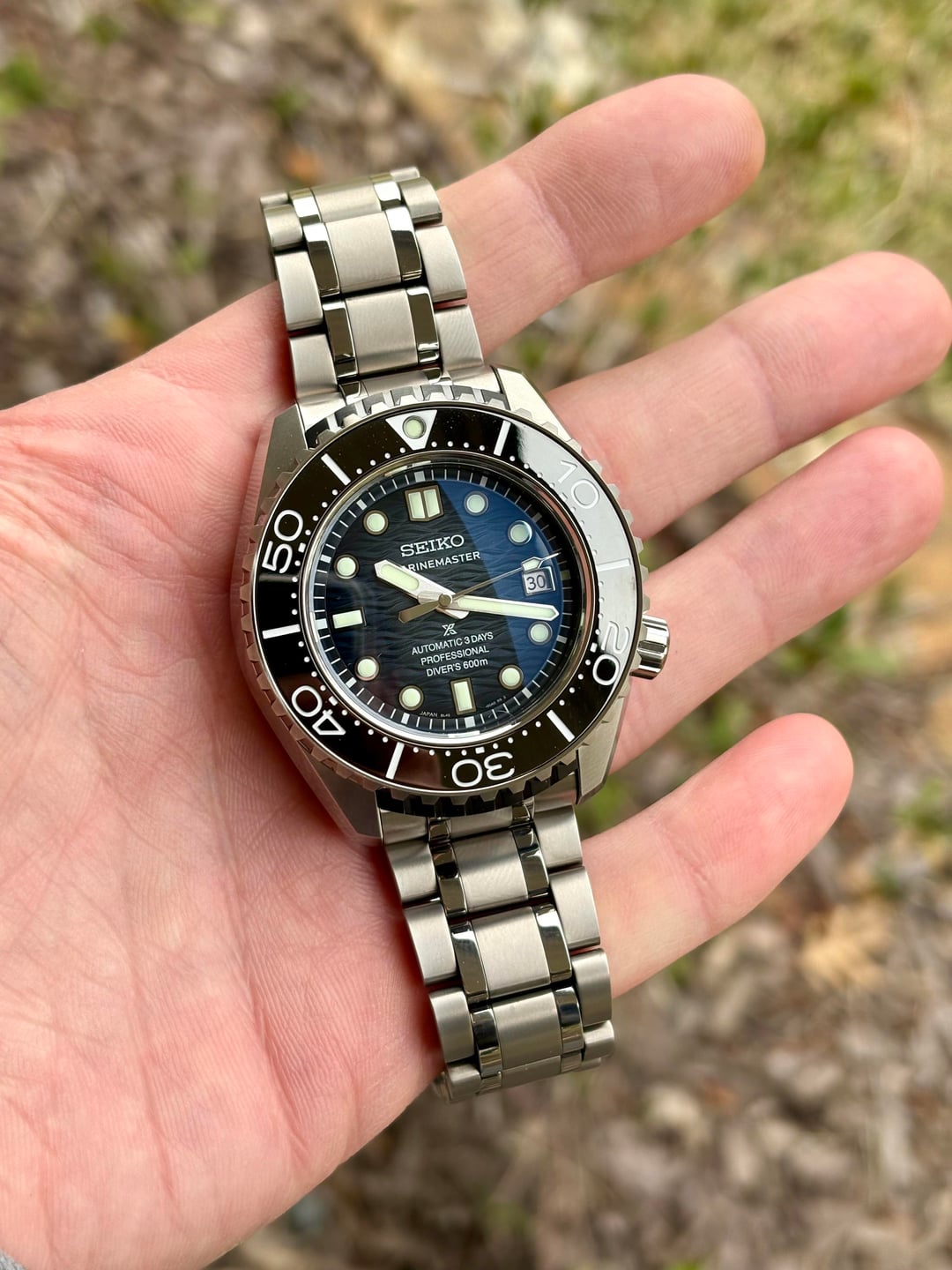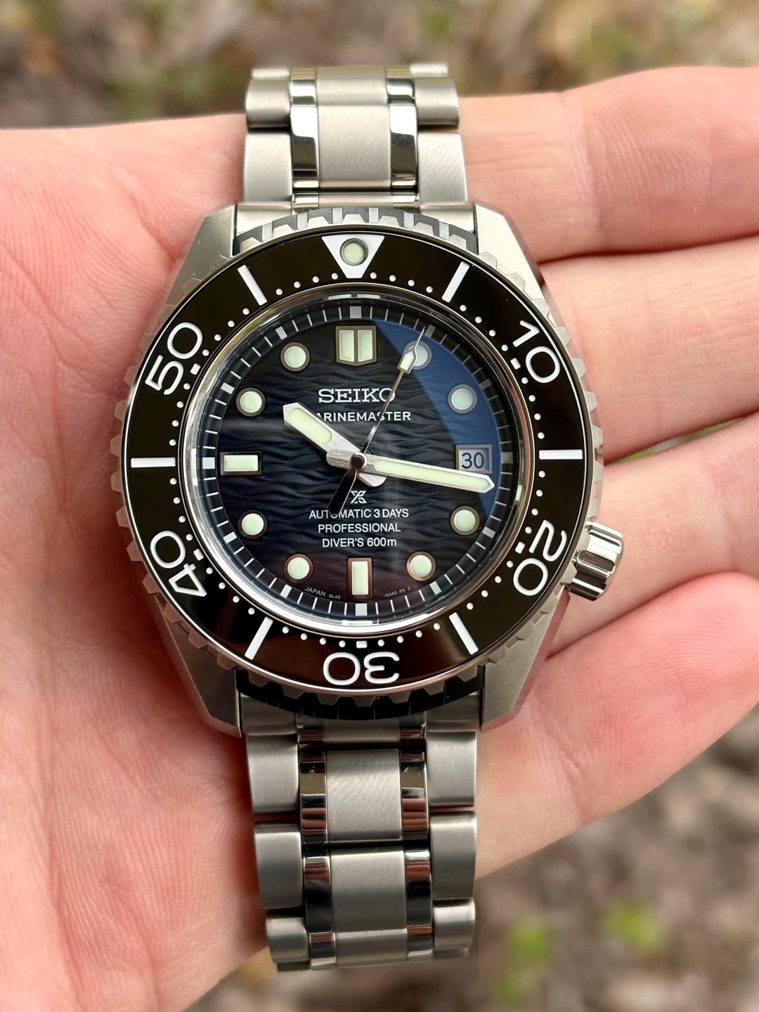 Seiko Prospex Marinemaster SLA081 – 60th Anniversary – Full Set – Mint For sale is a Seiko Prospex Marinemaster Professional 60th Anniversary, ref. SLA081. This is the 2025 600m saturation diver in titanium (one-piece case) with the new 8L45 automatic movement and textured blue dial. • Condition: Mint – no noticeable wear on case, bezel, crystal. Bracelet has the slightest little marks from being normal handling and being worn to work at my desk job for a day. Near mint. Caseback sticker is also still attached. • Movement: Seiko 8L45 automatic, 72h power reserve, running perfectly with all functions working as they should • Specs: 45.4mm diameter, 16mm thick, 600m WR, dual-curved sapphire, LumiBrite, screw-down crown, unidirectional bezel • Set: Comes with full box and papers – inner/outer boxes, warranty card, manuals, all original links • Notes: Limited edition Marinemaster produced to celebrate 60 years of Seiko dive watches 4950$ shipped located in Houston. Open to PP G&S for buyer with transaction history - buyer pays fee.