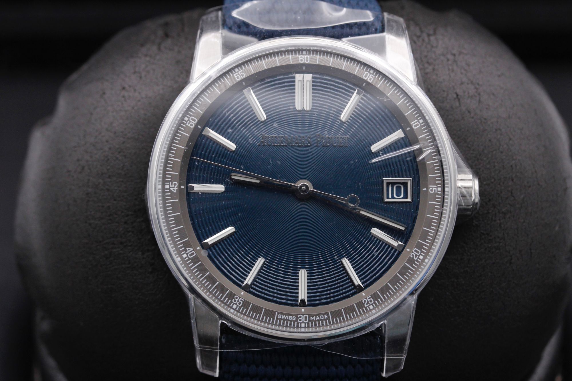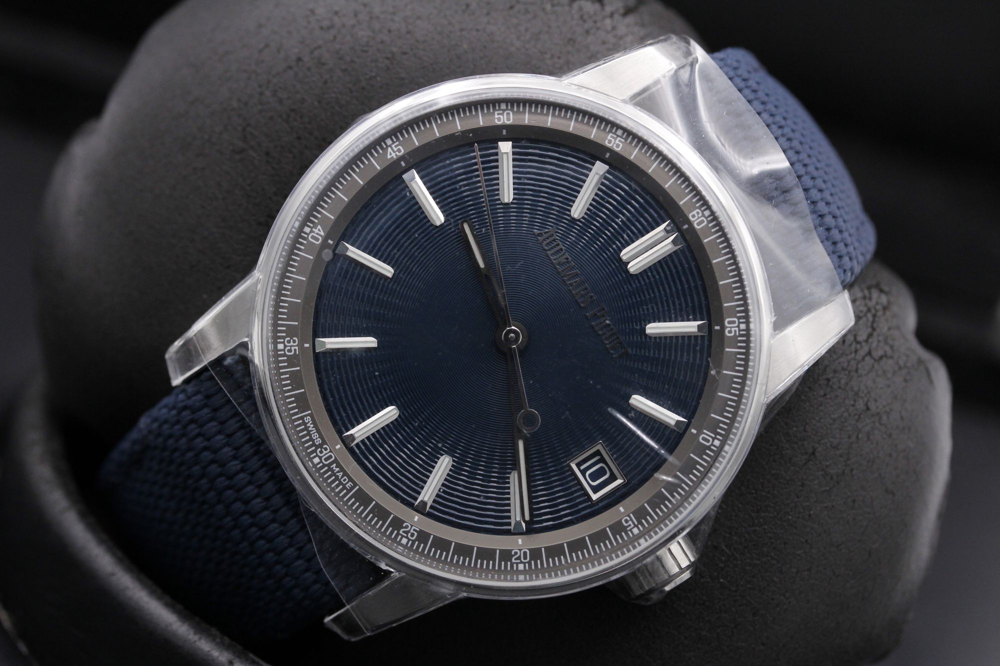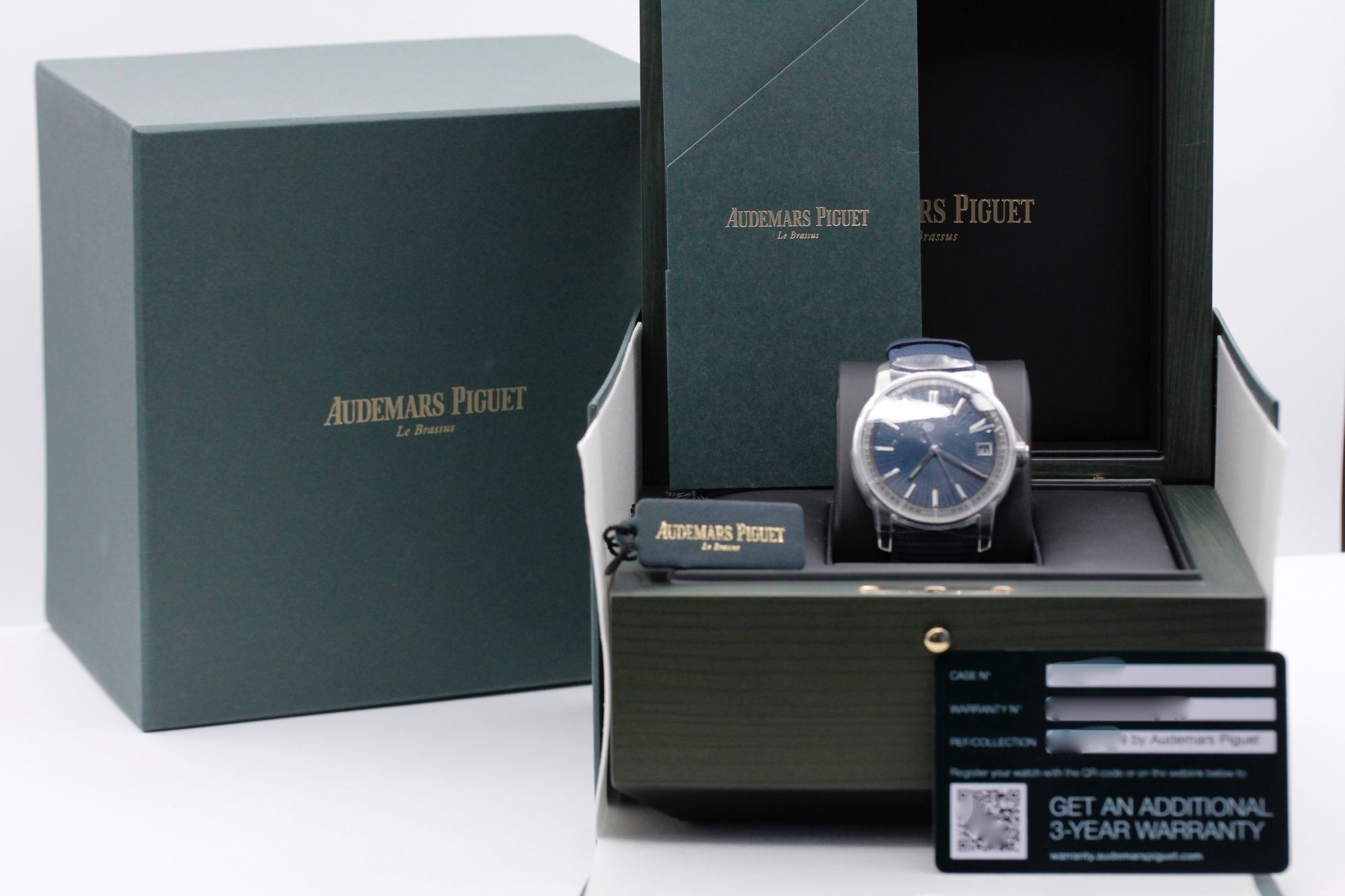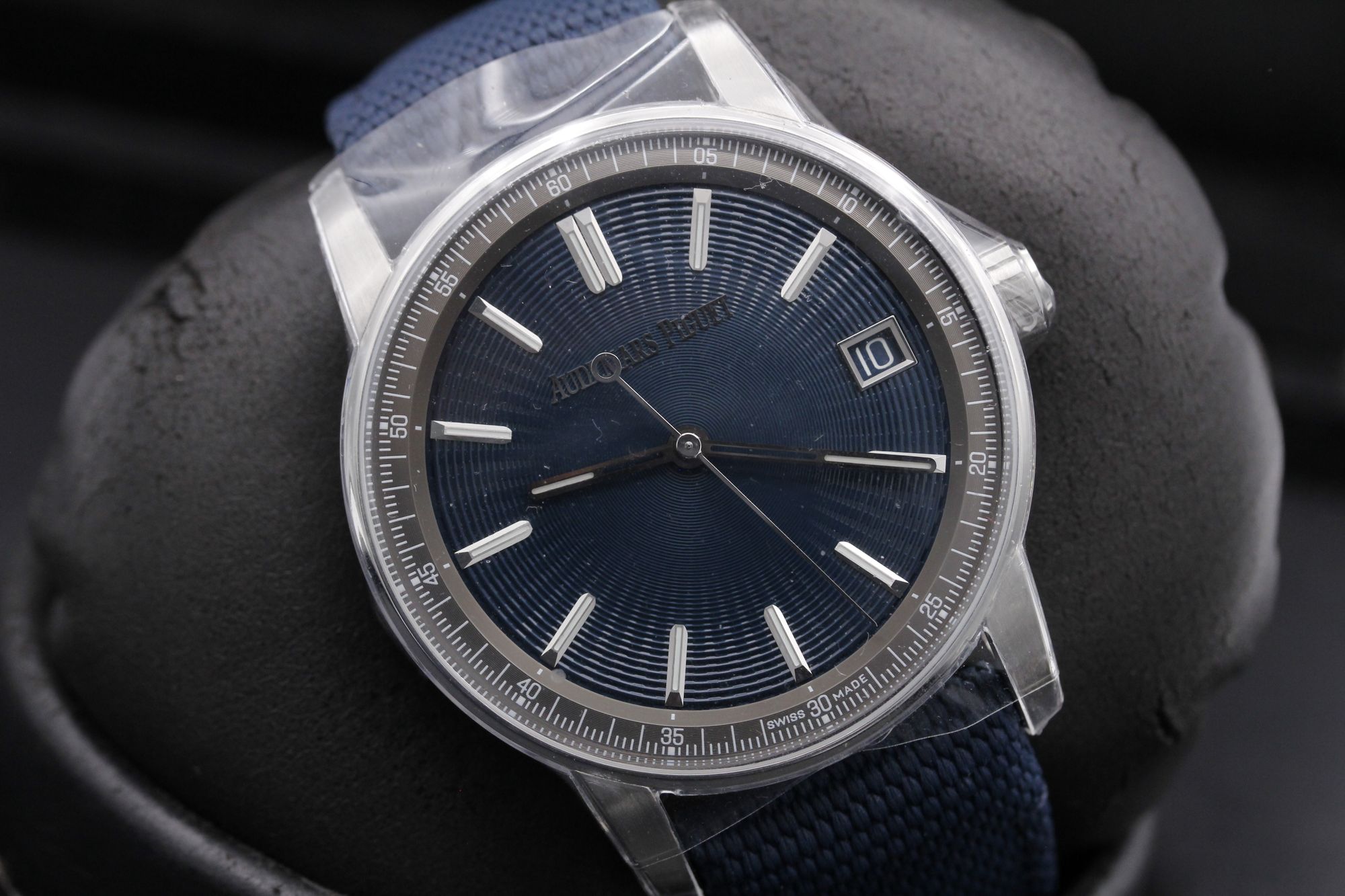 Brand: Audemars Piguet Model: CODE 11.59 Case Size: 41mm Condition: New Grade: New Bracelet Type: Blue Rubber Coated Canvas Material: Stainless Steel Dial: Blue Age: Modern Movement: Automatic Papers: Yes Box: Yes Reference: 15210ST.OO.A348KB.01 Additional Notes: Warranty Date - August 2023