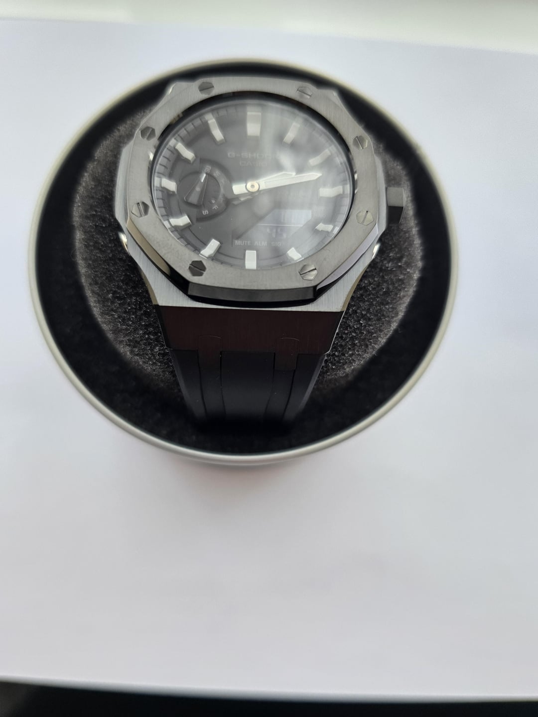 Brand new G shock CasiOak mod. Black case on black rubber strap with butterfly clasp. Comes with all original parts and packaging. £145 shipped. UK based but can ship to other countries. I can provide proof of previous telegram sales that I have made. Edit: Timestamp and username can be more clearly seen in the last picture)