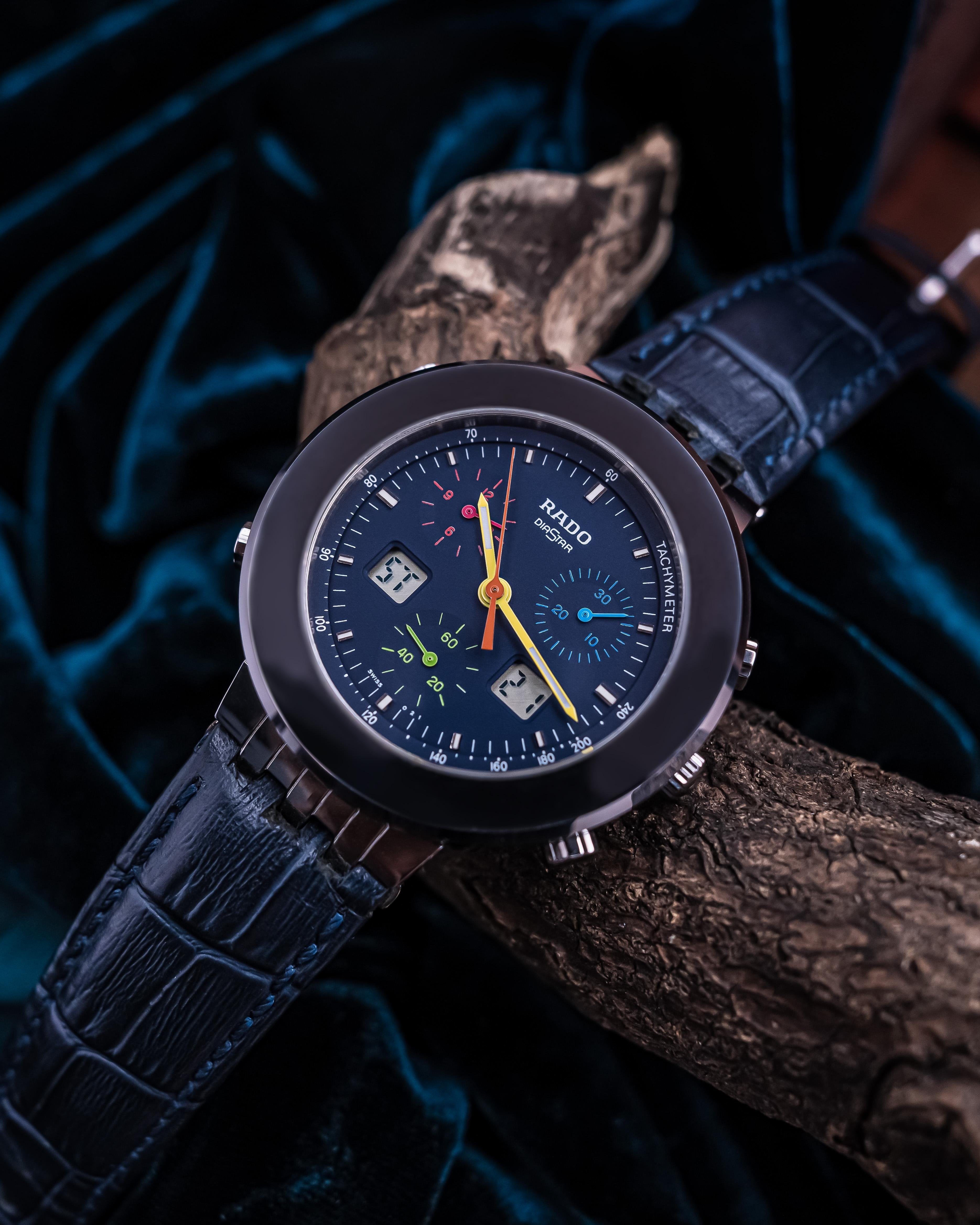 A Rado Diastar Ana digi chronograph watch with a stunning deep blue dial in great condition. Clean dial with straight raised indices. Retro colored hands. Robust case. Very solid build quality. As it says on back, it was the official watch for ATP Tour. Rado specializes in making scratchproof cases such as this. Signed crown. It has a lot of chronograph functions going on the watch. It’s rare to see a chronograph watch that syncs analog timing with a digital window, so it has a pretty complex chronograph movement. This model is seldom seen and a great collectible. Creative design makes it a conversation piece. Only Watch. Overall a great piece at a good price.