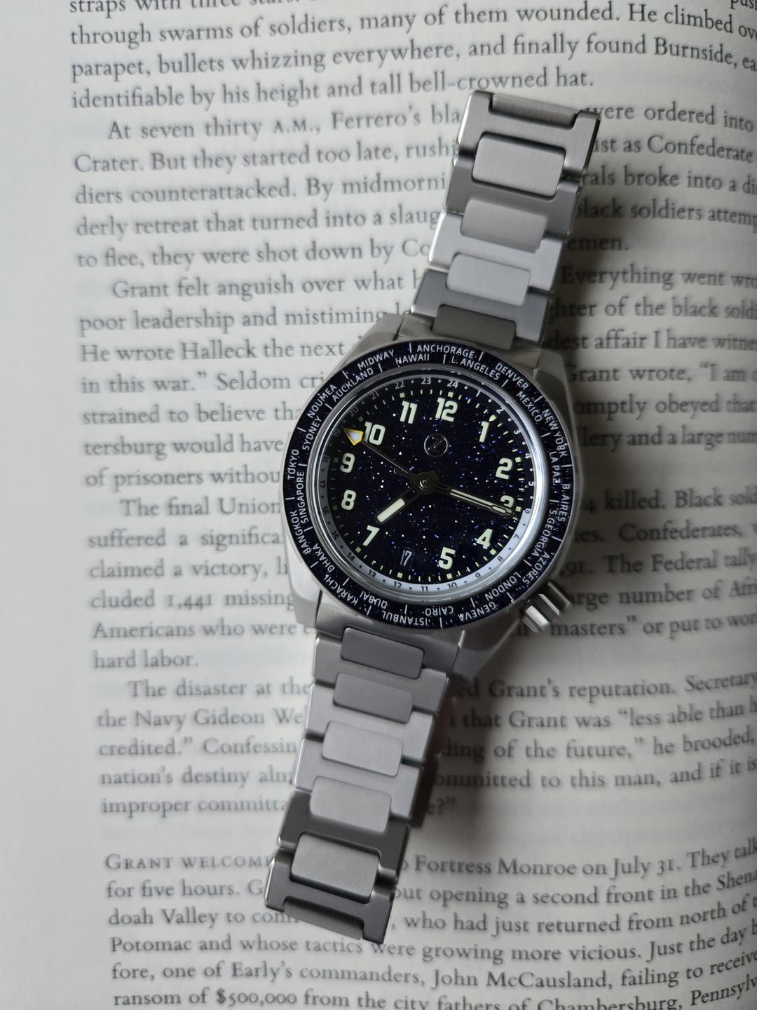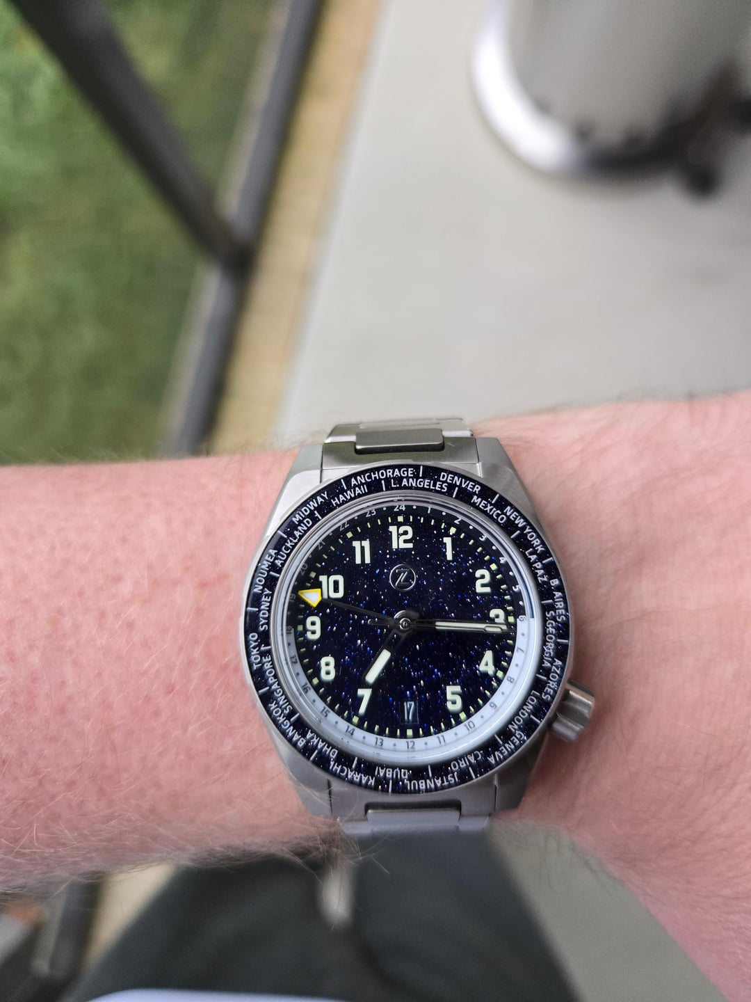 I’m selling a Zelos Thresher GMT world timer aventurine (titanium with hardness coating) with full kit. The watch is in excellent condition, no significant imperfections. These are sold out from Zelos. I bought this and another world timer at the same time and the other watch fits me better, so I’m letting this one go. The aventurine is not overbearing and is tasteful in my opinion. The watch wears beautifully and a touch smaller than its dimensions would suggest. Asking 600$ OBO shipped. Specs: Diameter – 41mm Lug to lug – 47mm Lug width – 20 mm Thickness – 11.5 mm case Movement – Miyota 9075 traveler’s (true) GMT Water resistance – 200m Here is a review of the aventurine version of the watch: [https://www.youtube.com/watch?v=pVgcb82KorQ&t=389s](https://www.youtube.com/watch?v=pVgcb82KorQ&t=389s)