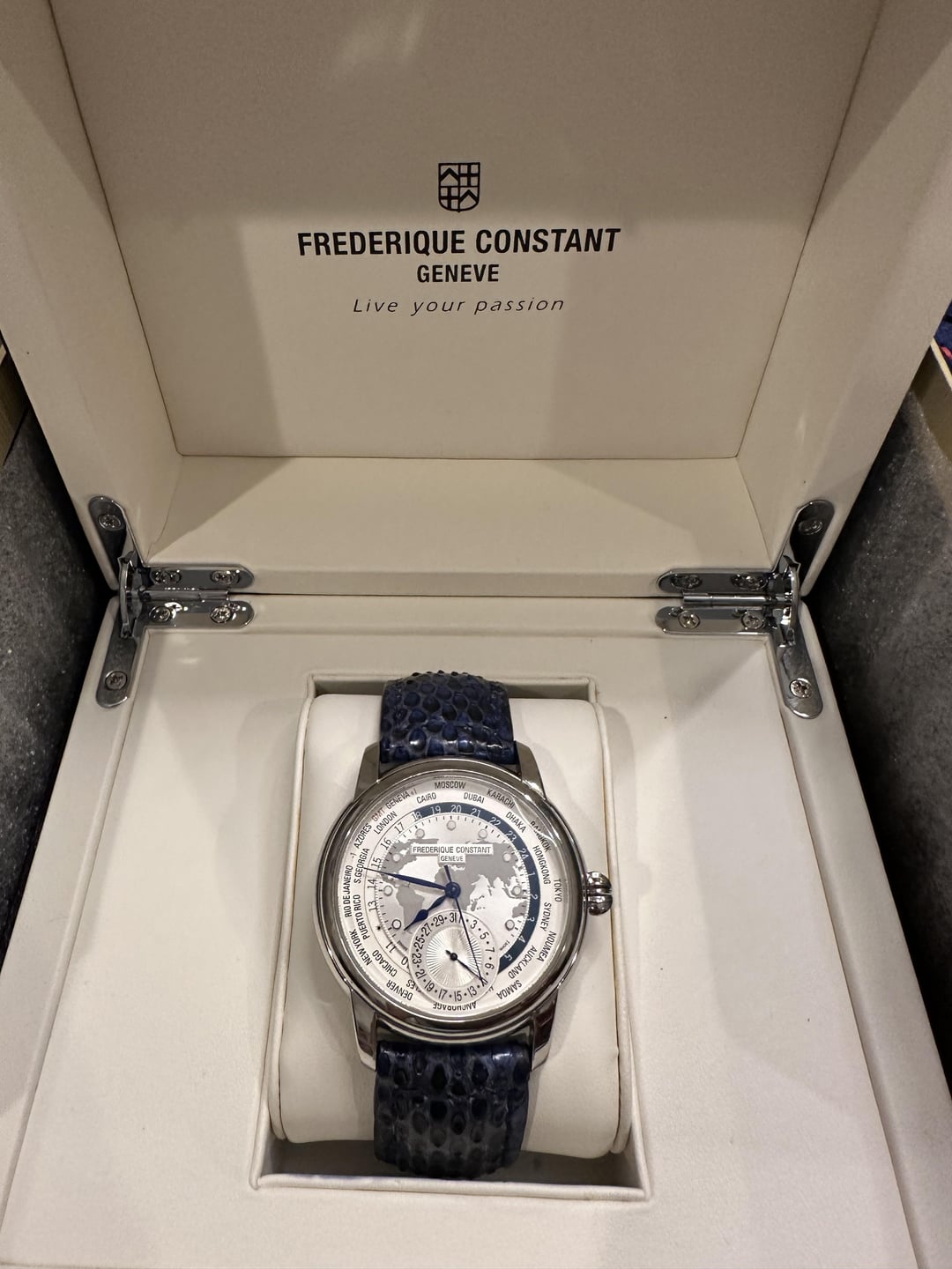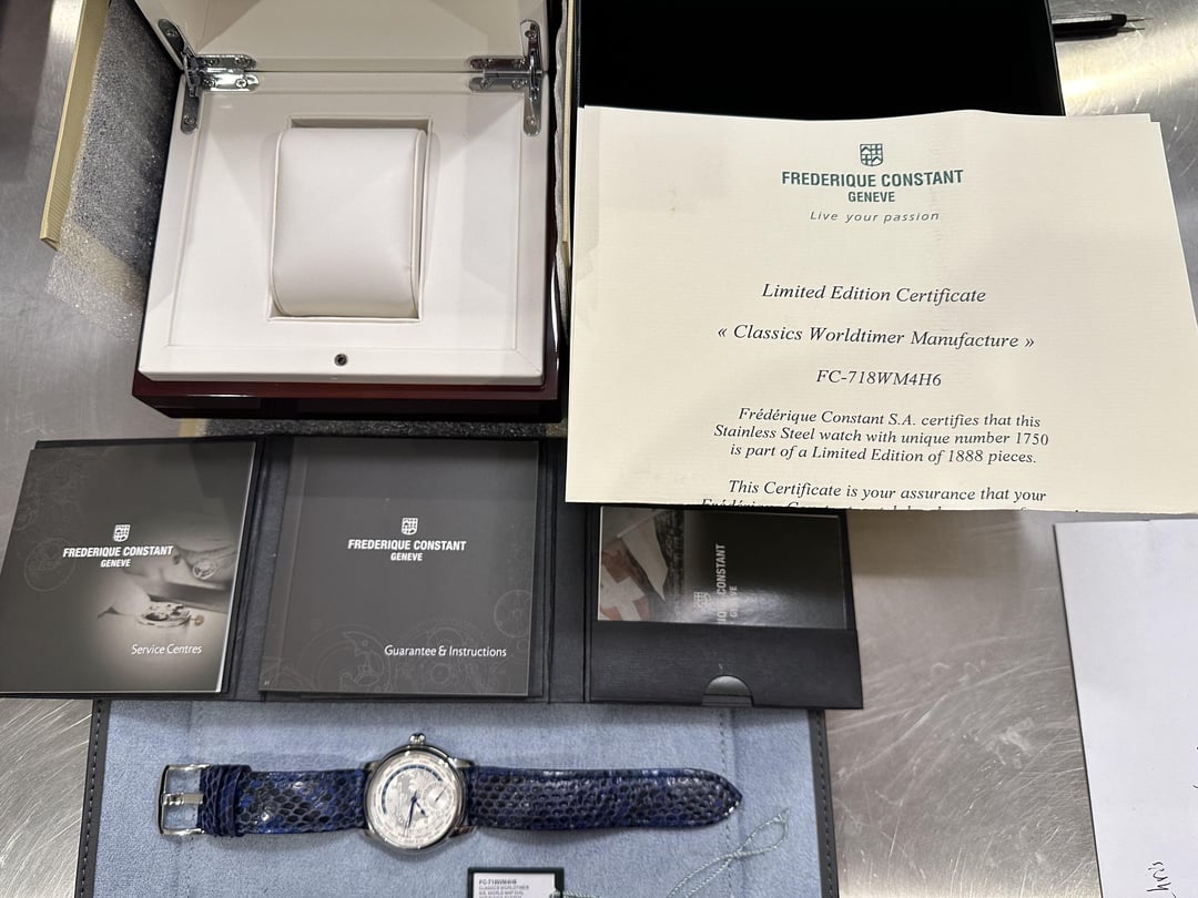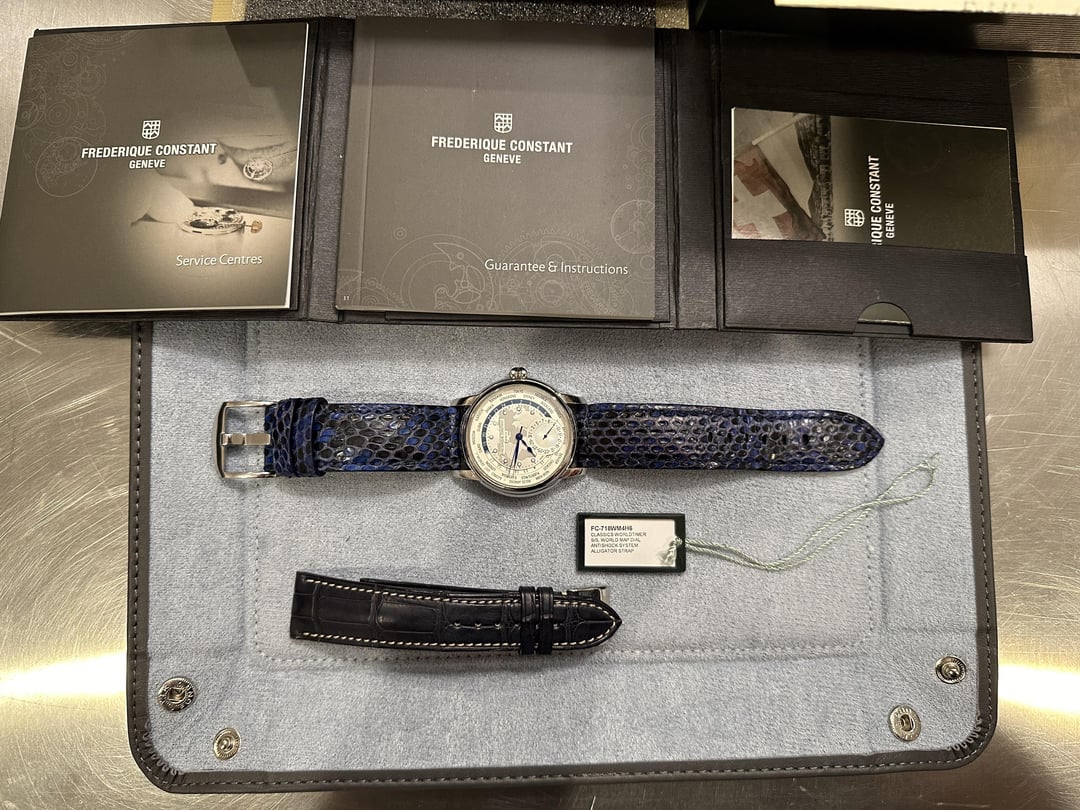 Frederique Constant Classic Worldtimer FC-718WM4H6 has 24 timezones with being able to see day and night for each timezone. This watch was part of a limited edition series and show cased their first in house movement at the time. The dial is a beautiful white and silver showing the map of the world with the day indicator being white and the night indicator being blue. The watch comes with the original navy blue alligator strap and a custom blue exotic strap. The watch has all the box, papers, hang tag, and book that it came with. Asking $2000 plus shipping. Zelle, Venmo, PP, wire, & crypto is accepted. Just ask to cover fees if needed. Tag/Timestamp: First pic in the album Feel free to reach if you have any questions.