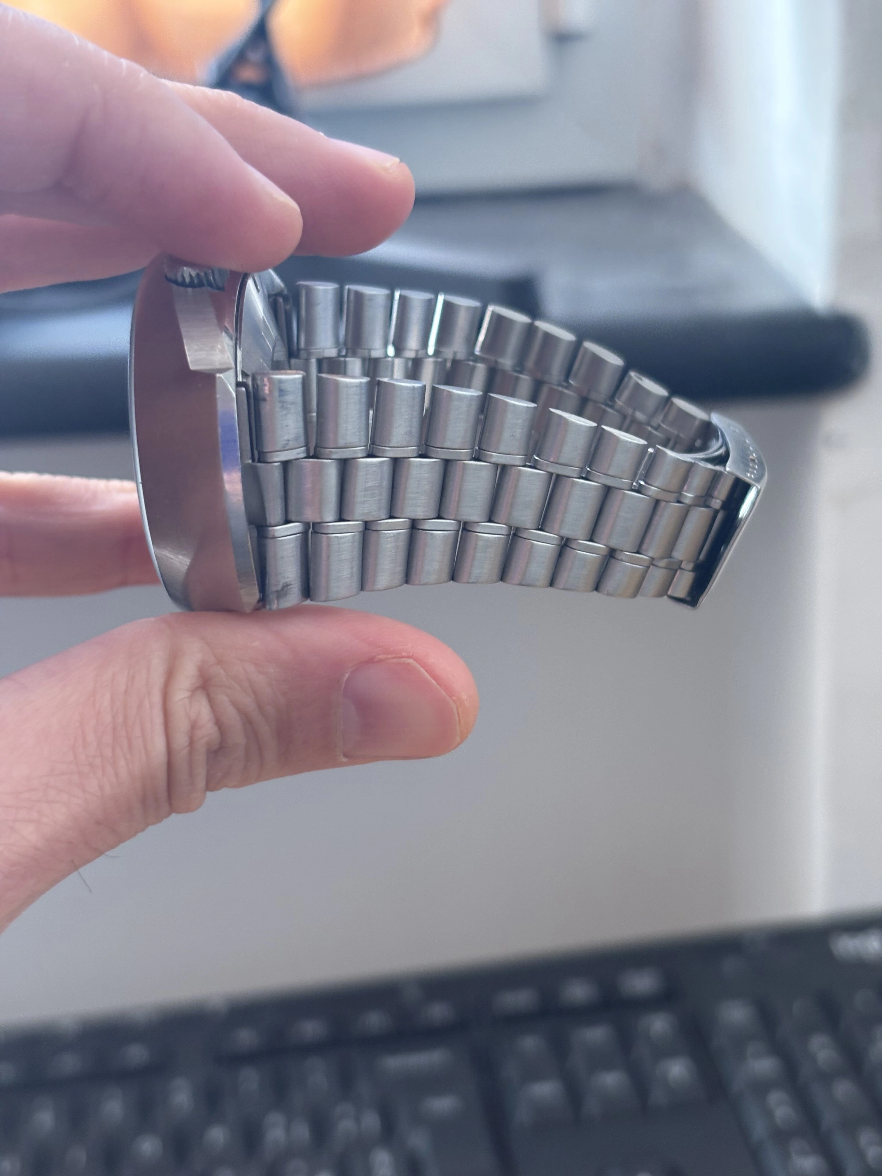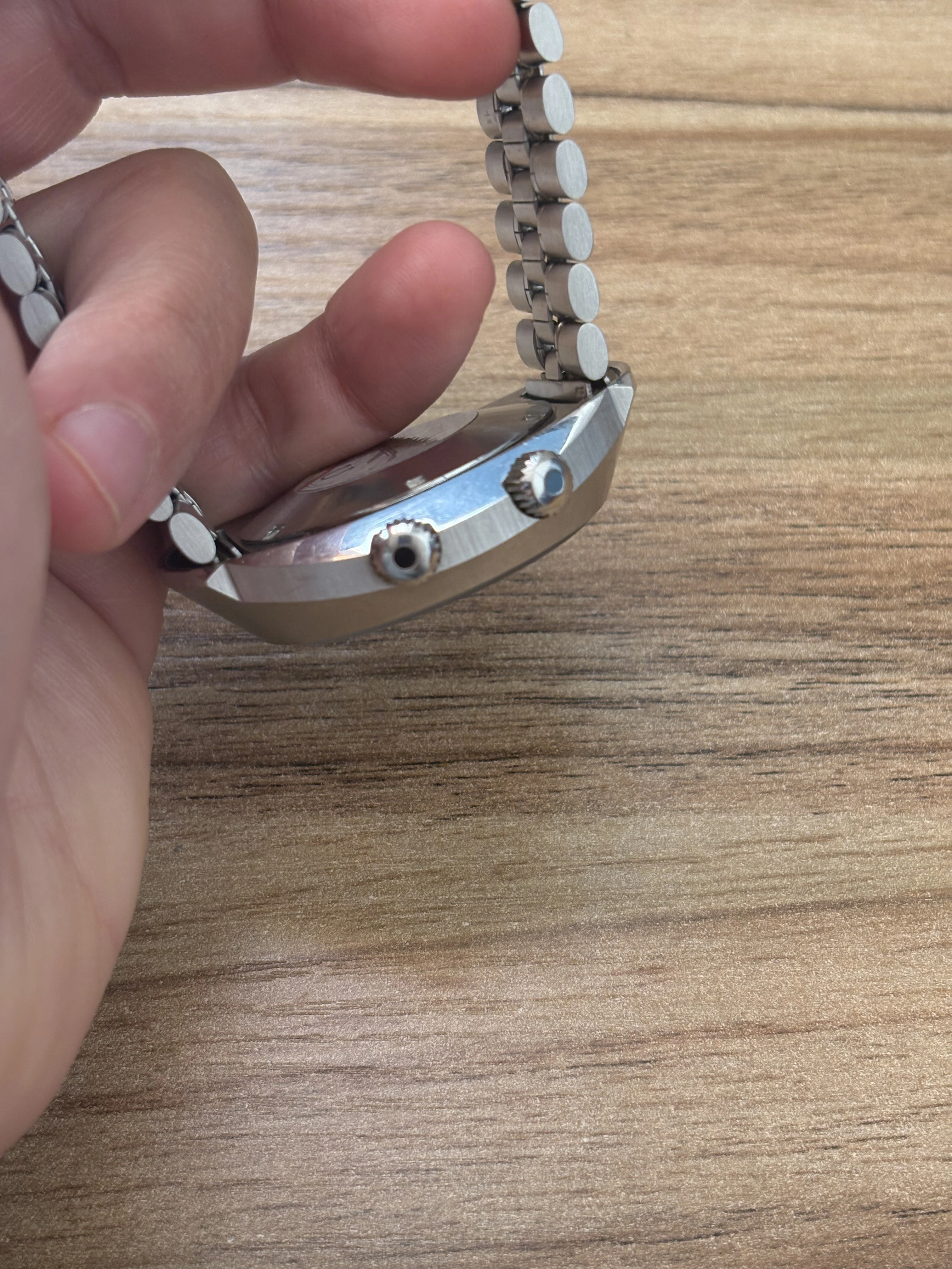Let us start from the case which is unpolished keeping the original sharp shape of the early examples, the caseback is perfect. Glass has no defects.
