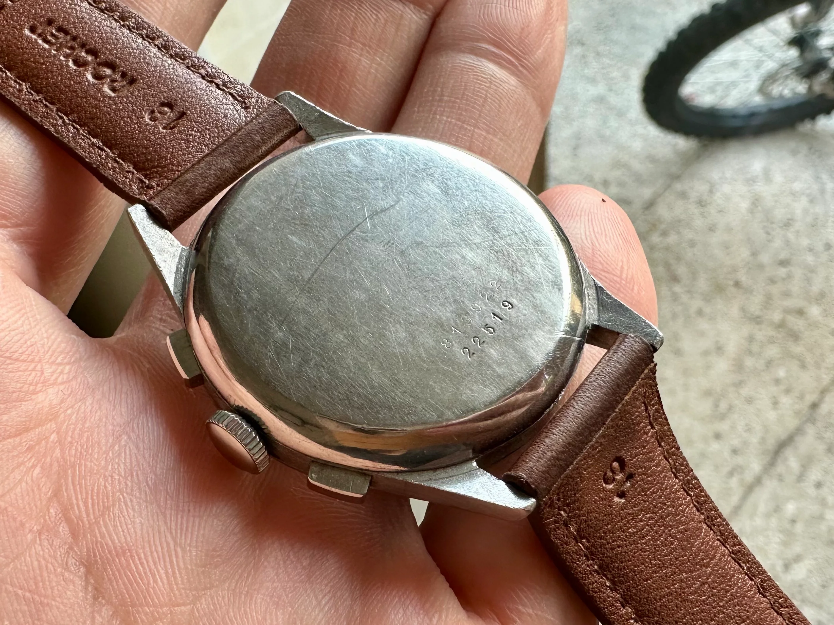 The watch is functional, with original pushers and crown. The only detail to note is the absence of the central chronograph hand, but with some patience, it may be possible to source the correct replacement.