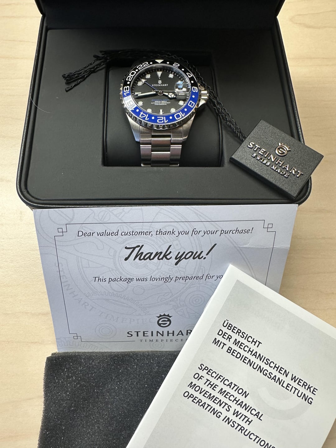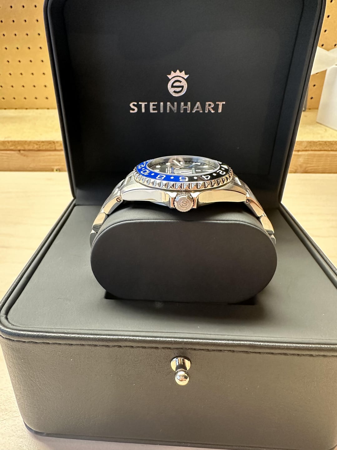 [WTS] Steinhart GMT - Box and Papers Condition - Excellent condition with light scratches from wear. Includes - Watch with additional links, instructions manual, and box $479 with free shipping in the US. This is my first sale so let me know how I can earn your trust and your business! PayPal, Zelle are my preferred forms of payment. Thank you!