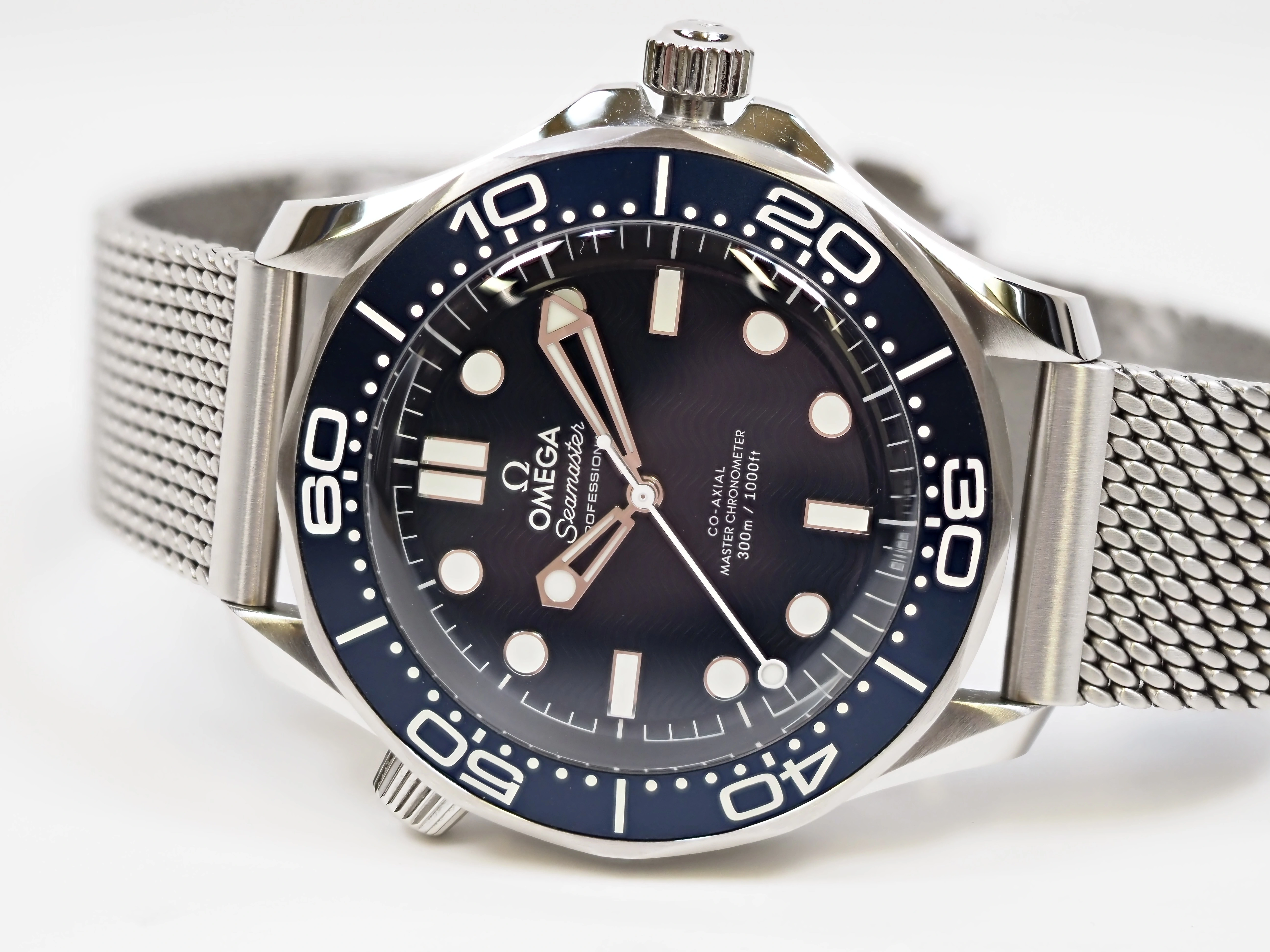 Dial: Blue oxalic anodised aluminium dial, with laser engraved waves, inspired by the Seamaster Diver 300M worn by James Bond in 1995’s GoldenEye