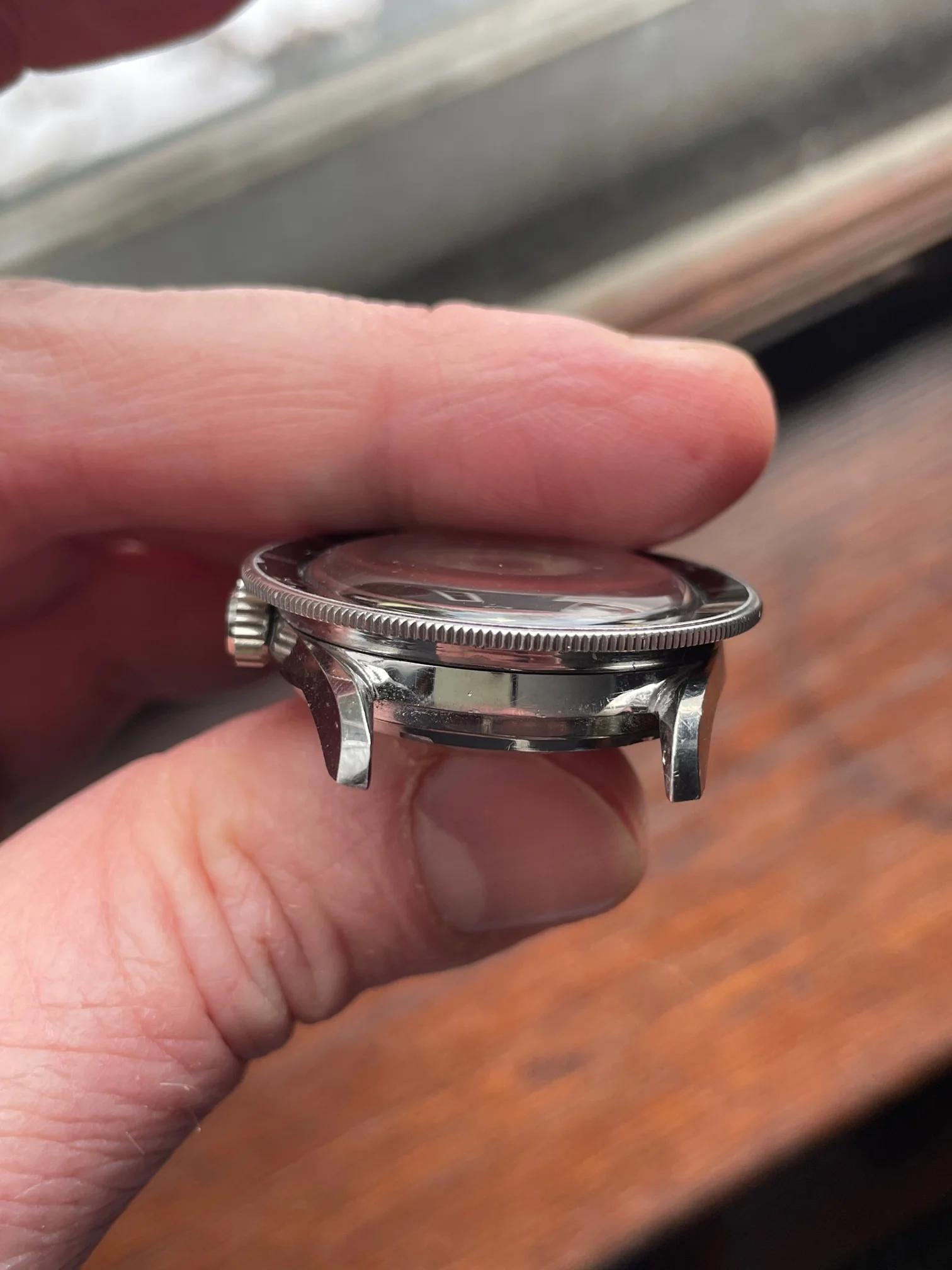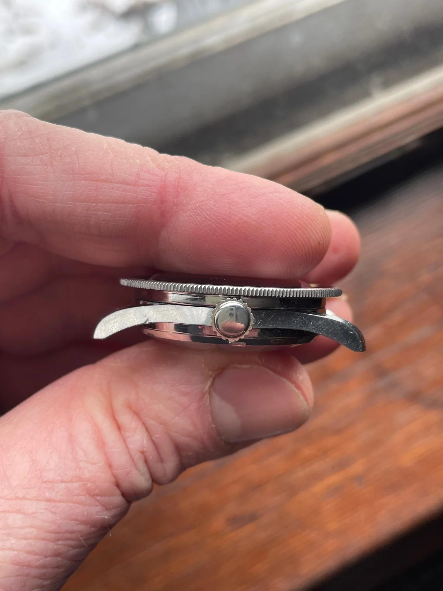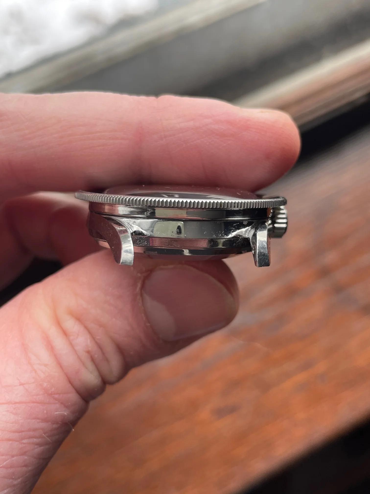 CASE: 39mm steel case still has sharp lines and doesn't appear to have been polished. The crown rotates bidirectionally, and has a few scuffs, but (imo) still looks presentable. The crystal and crown were replaced during service, the former because of a crack, the latter because the inner gasket was stripped and couldn't be replaced (it doesn't have o-ring gaskets, but instead a sheath). Both crystal and crown will be included with the watch.