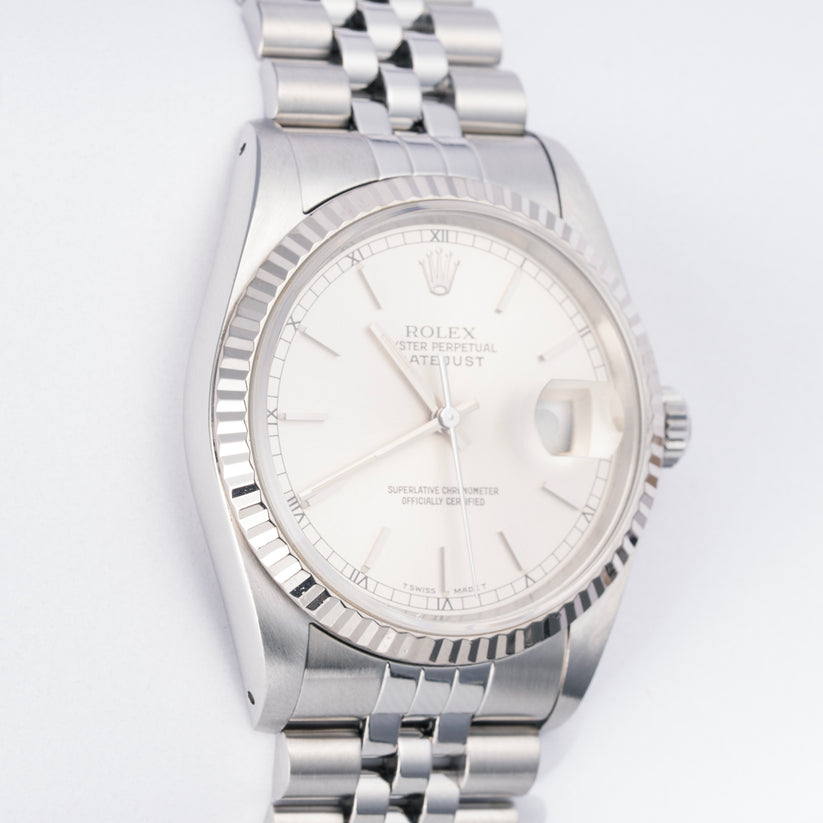 | Rolex Datejust Mens Stainless Steel 18K White Gold Jubilee White No Holes 16234 beckertime (23962) |