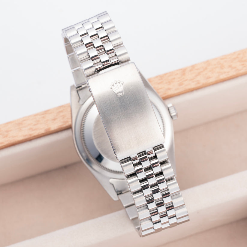 This reference 16234 is in excellent pre-owned condition, showing only minor signs of wear. The bracelet shows light to moderate stretch. The dial and hands are pristine. While the service history is not known, the watch is tested to run within factory specifications, winding is smooth, and the case has been pressure tested ensuring proper water resistance.