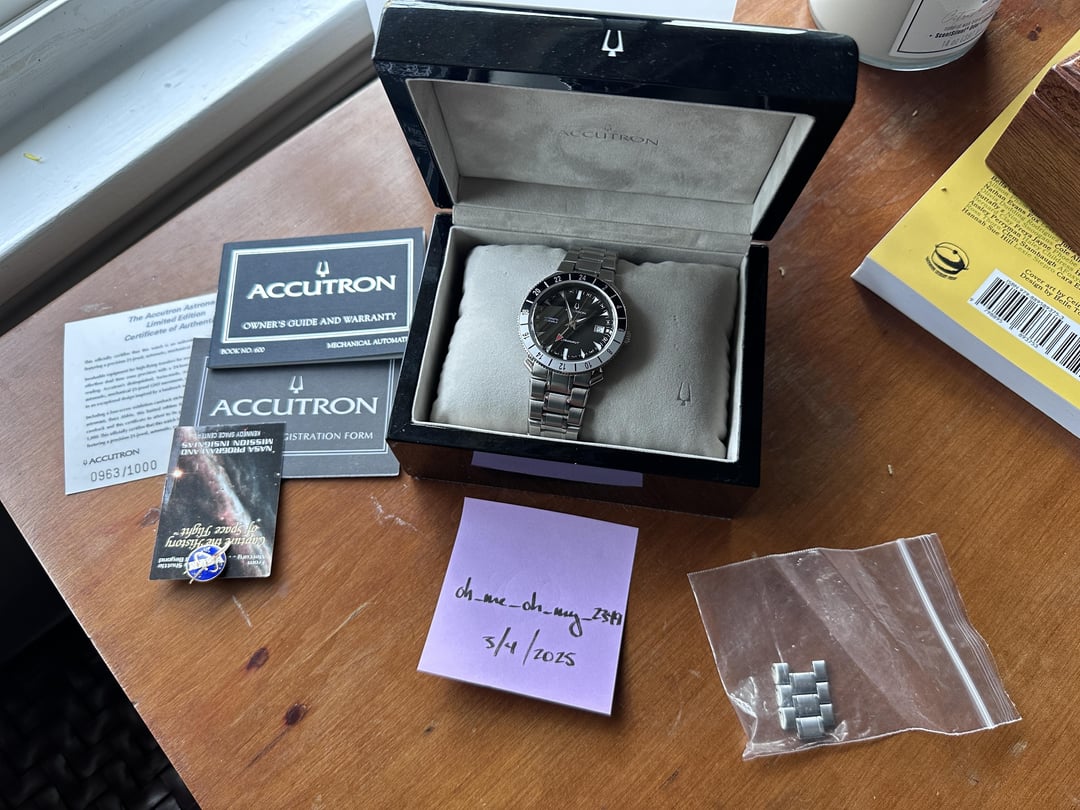 Up for grabs is my Accutron Astronaut GMT Buzz Aldrin Limited Edition. I acquired it in a partial trade on here a couple months back and did not bond with it. It’s in excellent condition with all the box candy and extra links. Model 28B088 (No. 963/1000) Movement is ETA 2893-2 Open to trades! I love anything from Oris, Damasko, Nomos, and Sinn. I’m also a fan of many of the micro brands so don’t be shy. Thanks for looking!