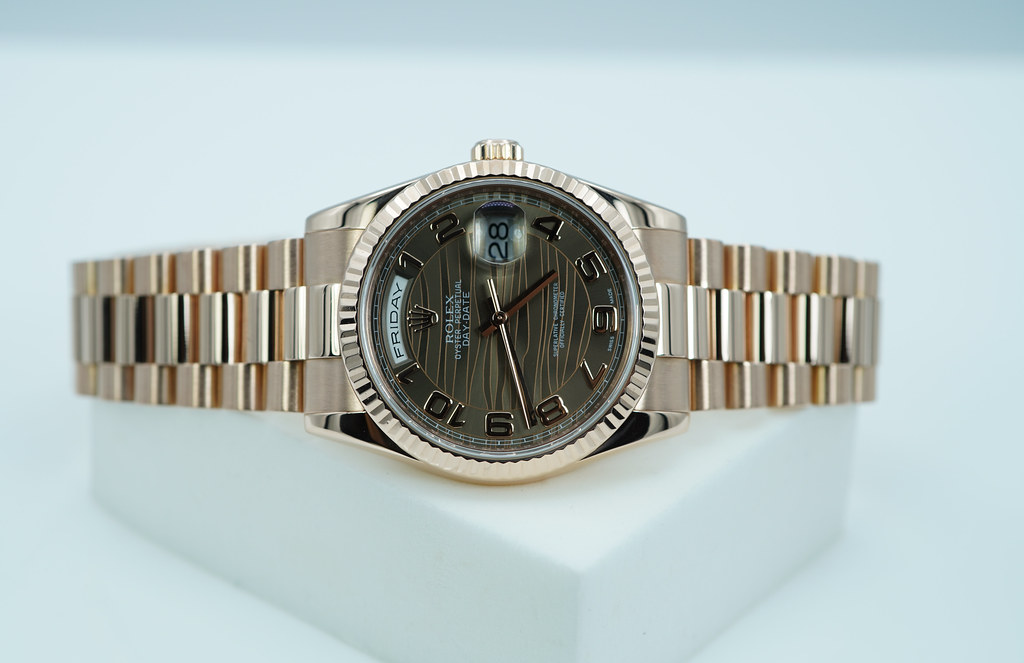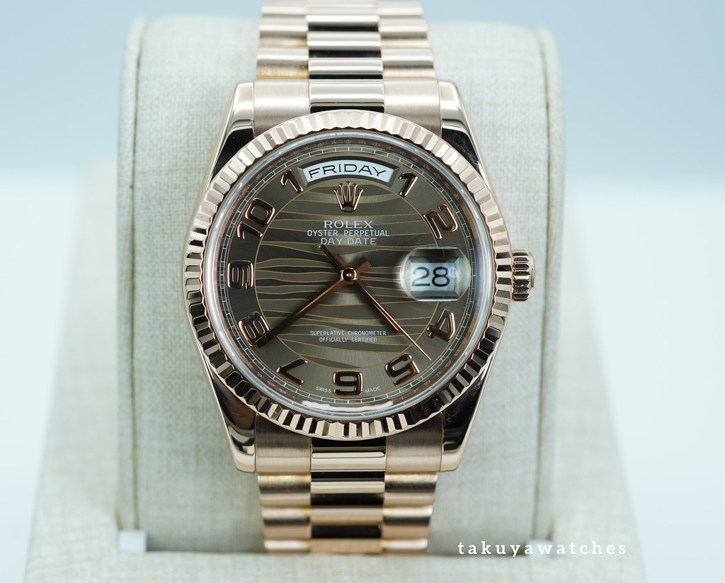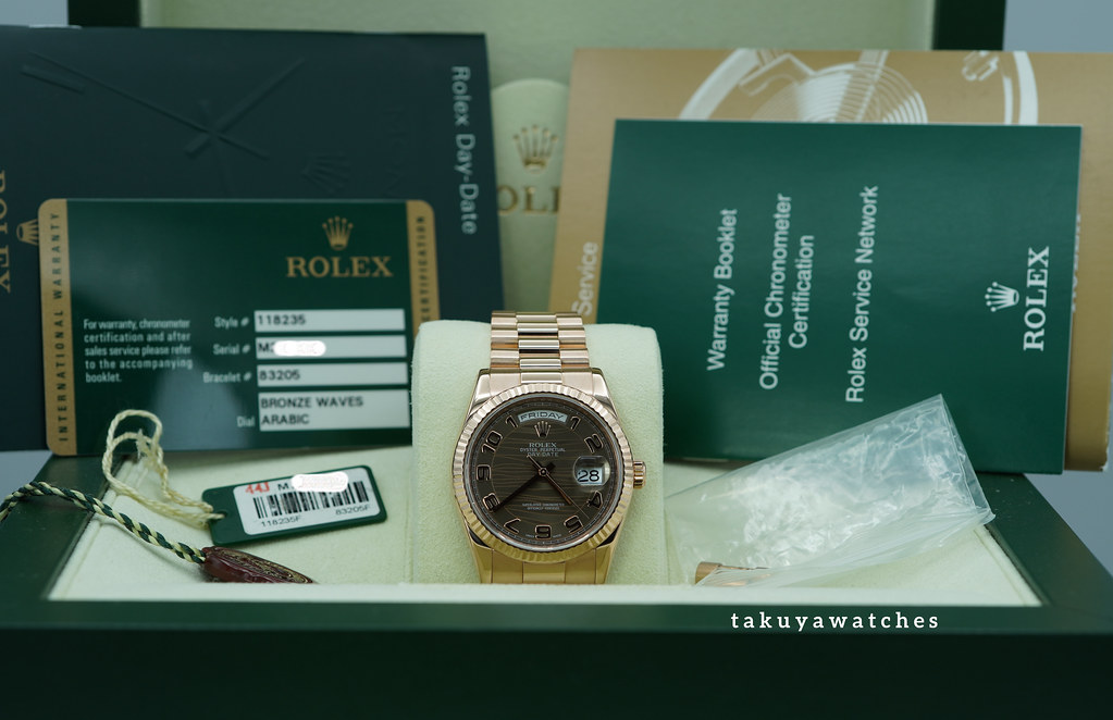 Hi, Selling A Great Condition & Very Beautiful 36mm Rolex 118235 18K Rose Gold Day Date with Bronze Waves Arabic Dial. Its on Rose Gold President Bracelet, and in M Serial. Purchased from Rolex USA Authorized Dealer in 02.2013. Watch currently running perfect with Non Issues. The bracelet has full 24 links and still tight. Full Set.