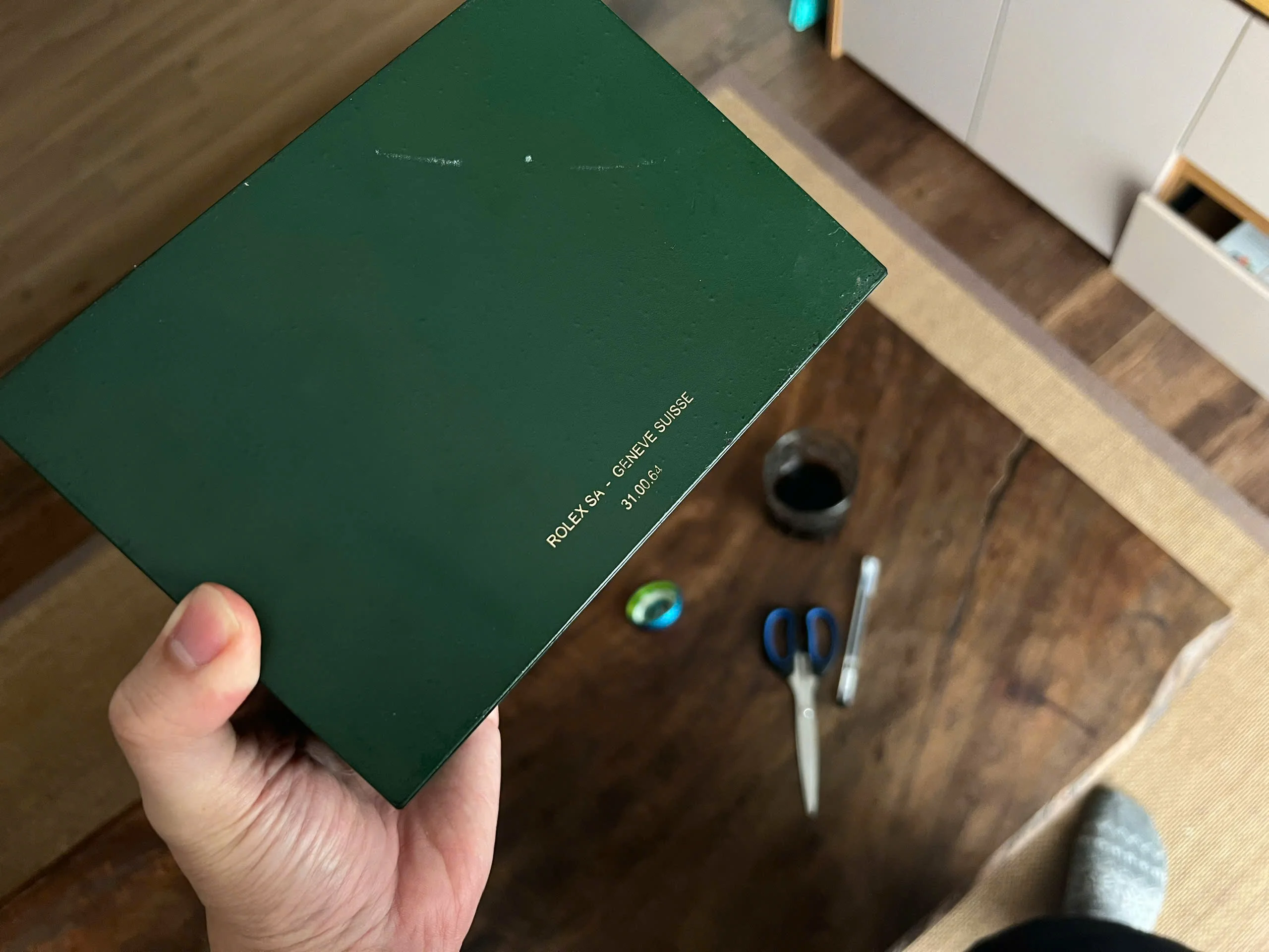 It includes the original Rolex green 31.00.64 box (pictures of the box), booklet, and hang tag, as well as the sale receipt (information can be shared with interested buyer—please ask). No card (only a picture of the card is available—please ask).