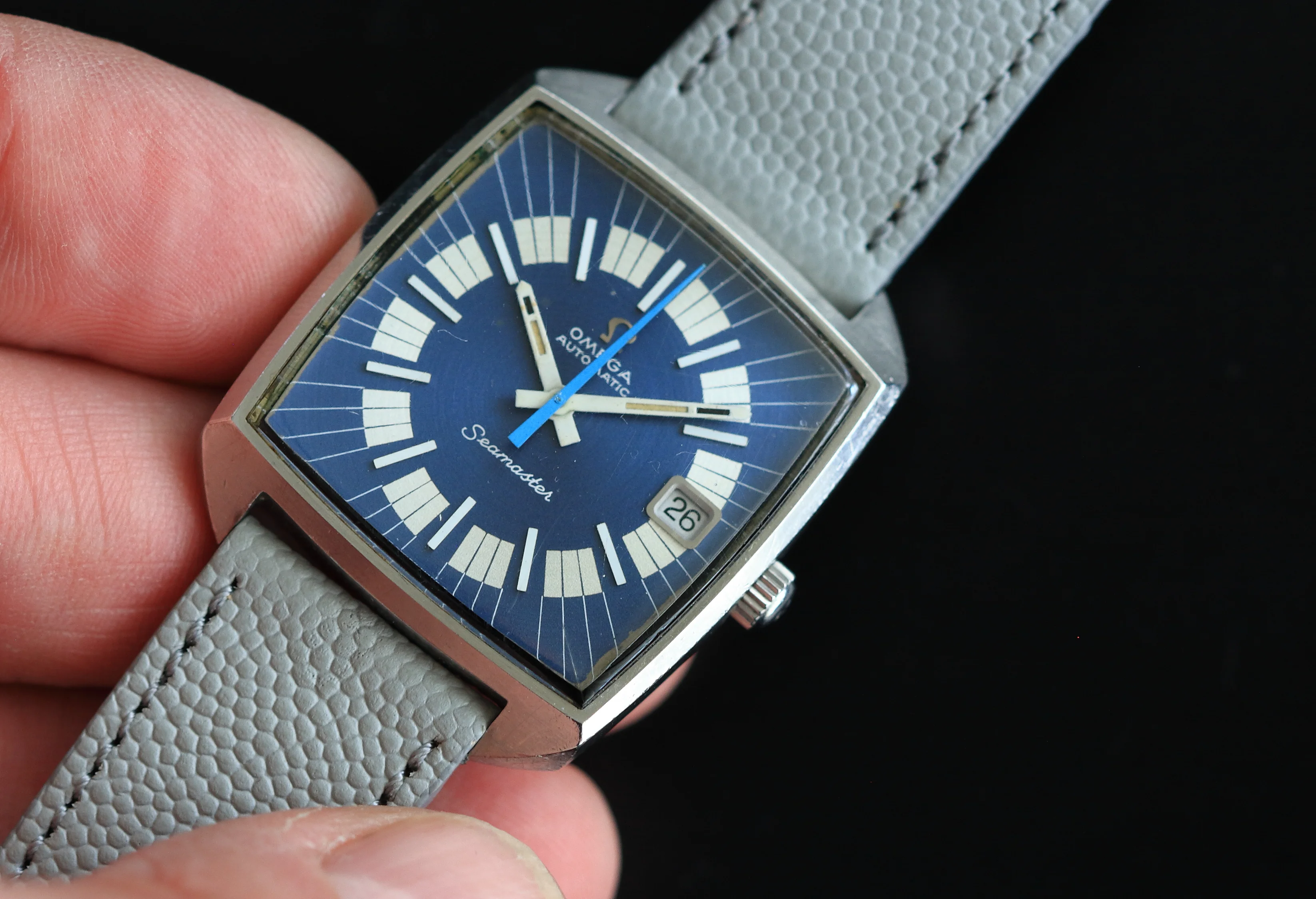 Today I’m selling this cool all steel late 1960’s early 1970’s Omega Seamaster Compressor ref 166.042 with calibre 565. The metallic bright blue ‘Dynamic’ style dial is really stunning and what attracted me to this piece when I purchased it. It’s one of those dials that changes hue depending how the light catches it and ranges from pale to dark blue. I have read that this dial style was used in the earlier years of this reference which would probably put it then somewhere between 1969 and 1971. White raised baton indices and stick hands with a contrasting white 5 minute chapter ring and turquoise blue seconds hand complete the sporty look.