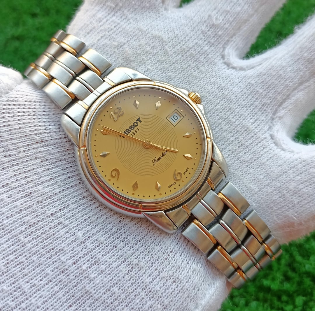 Tissot - Seastar Two Tone Watch. Ref-A665/765K. Description and Features: Overall this is in good Working condition. Specifications: Tissot ETA Quartz movement. Date, hours, minutes and sweep seconds. Gold bezel and Tissot-T crown. Mineral Crystal without any mark. Stainless Steel Two Tone Bracelet. Please see the pictures carefully. SPECIFICATIONS: Movement: Quartz, Case Diameter, 35 mm, Thickness 6 mm, Lug Width 18 mm, Lug to Lug 37 mm, Watch only. Please comment before messaging. Batteries are not allowed to be sent with the watches as per shipping policy. Payment Method: PayPal F&F, Crypto, Payoneer & Binance. Shipping From FedEx Express Shipping. Price $150 Shipped. After payment confirmation the scheduled shipping time will be 2-3 working days.