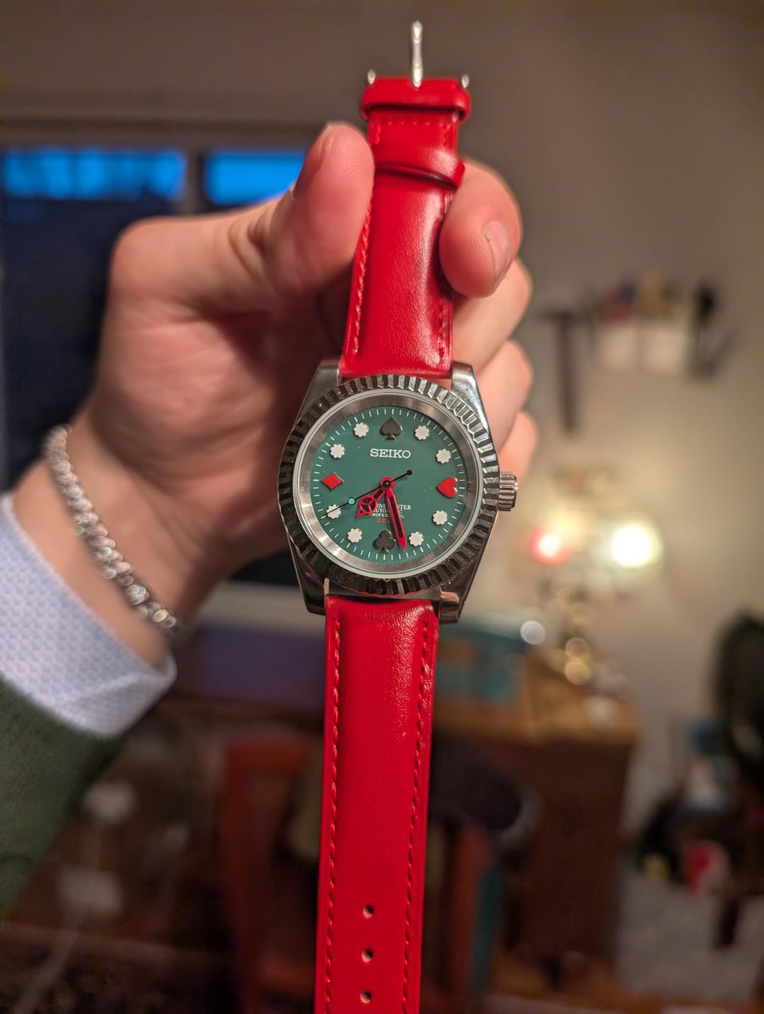 Hello! Selling this mod build done by myself. The movement is an NH35, everything brand new, never worn. The watch is poker themed with a bright red strap. The watch is 38mm and lugs are 20mm. No box Shipping from Mtl canada to US & Canada $160 US / $225 CAD + shipping (except pick ups in mtl) Payment via paypal or interact for canadians No tariffs ;) Cheers!