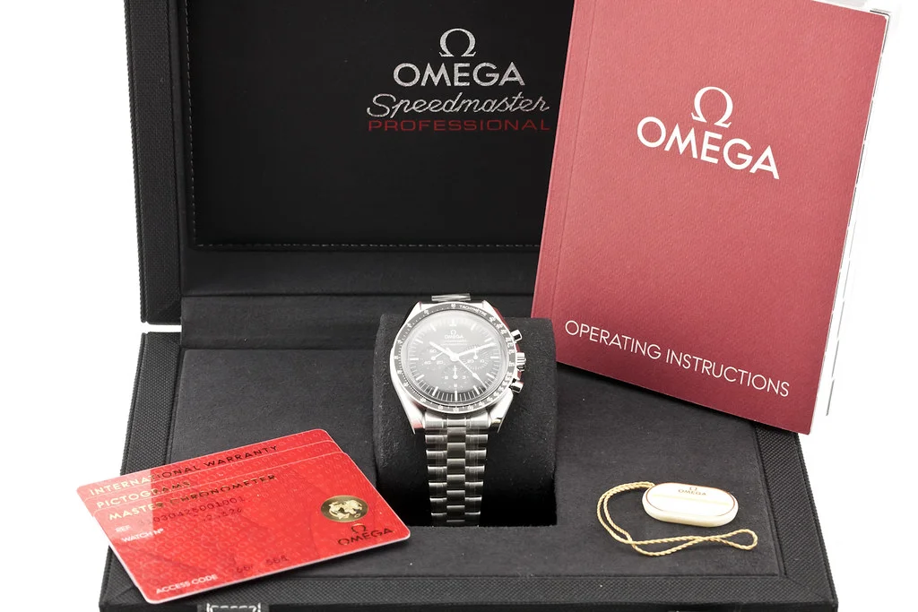 Up for sale is a brand new Omega Speedmaster Moonwatch Professional Hesalite with Adjustable Clasp, reference # 310.30.42.50.01.001. It comes complete with all boxes, papers, booklets, hang tag and 2025 Omega Warranty Card.