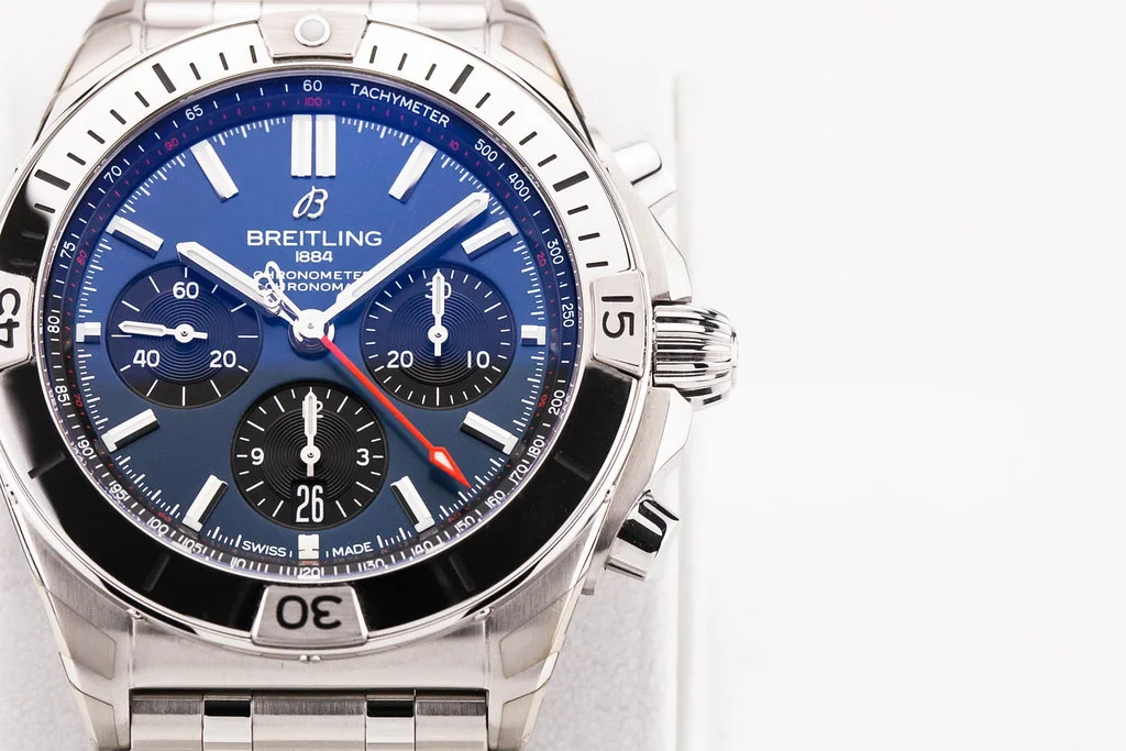 Up for sale is a brand new Breitling Chronomat B01 42 Blue Dial on Bracelet, reference # AB0134101C1A1. It comes complete with all boxes, papers, booklets, hang tag and Breitling Warranty Card dated February 2025.