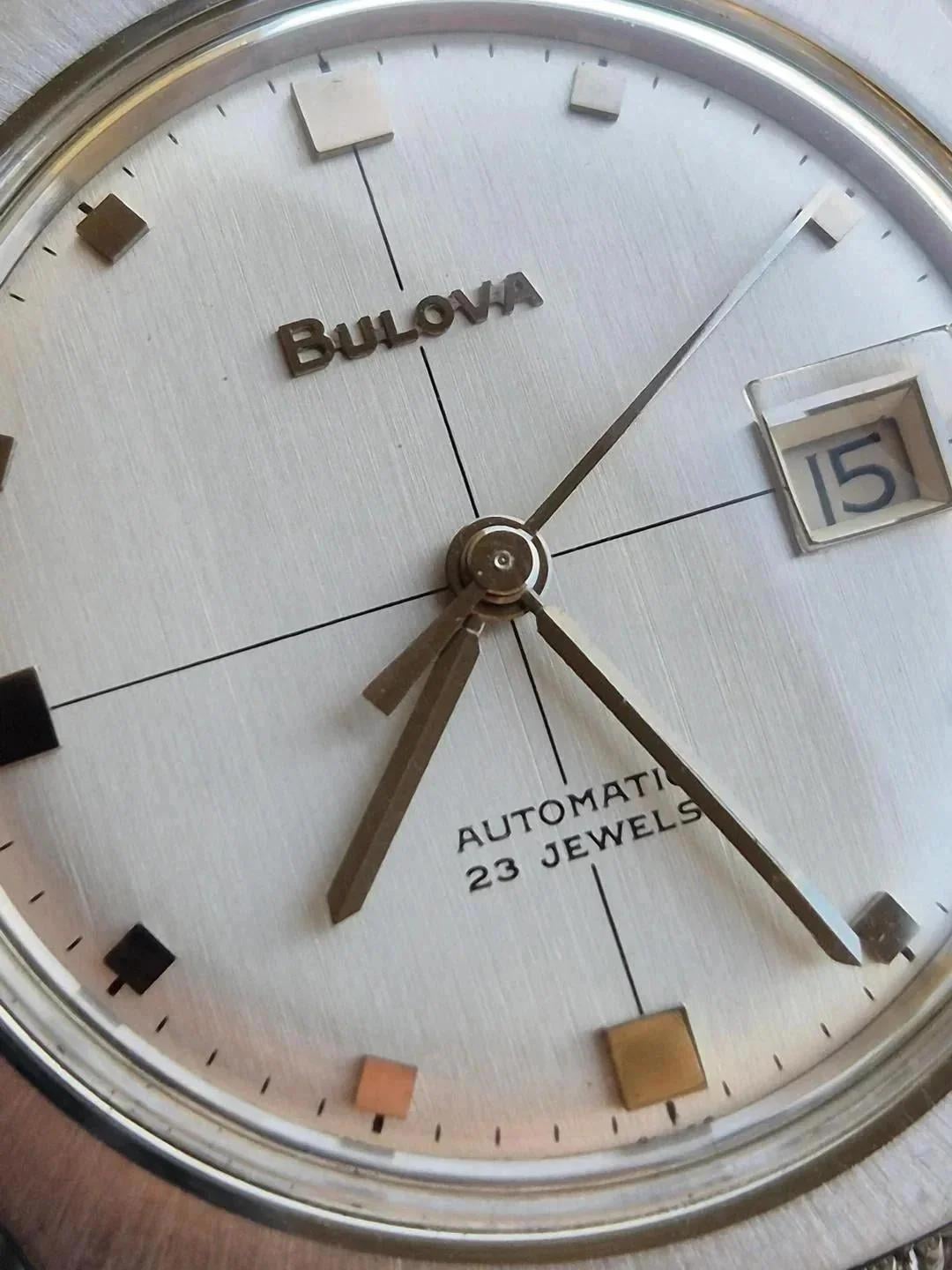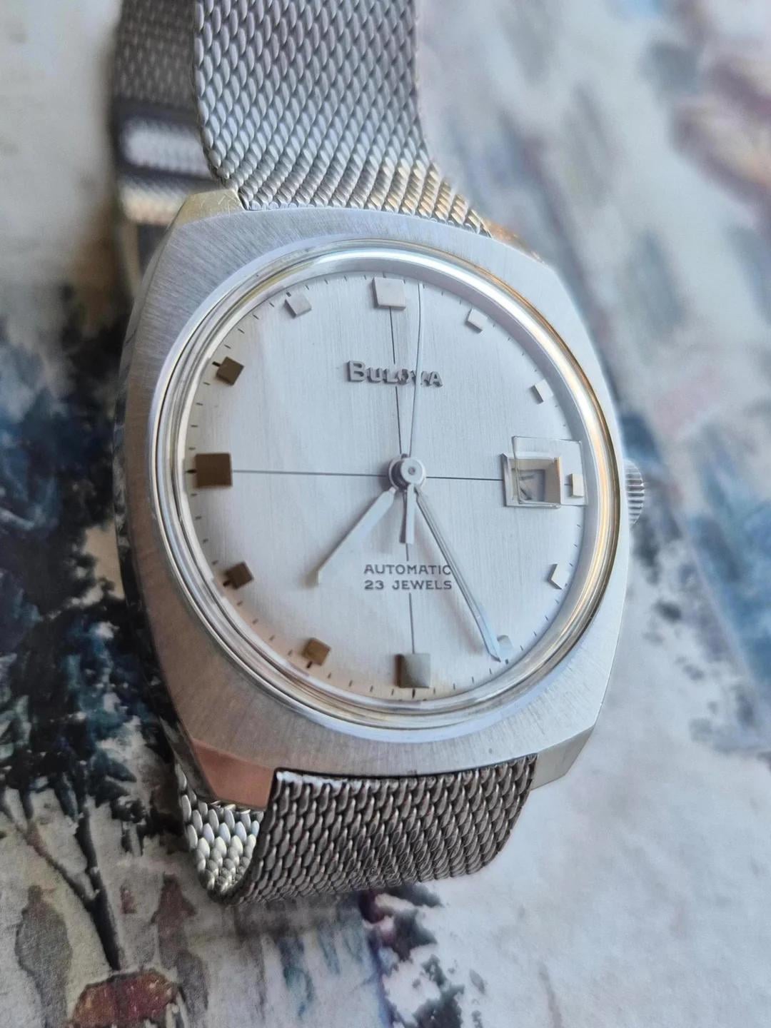 For sale **Vintage Bulova** 23 jewels with cross hair dial Condition is very nice, there are signs of use but factory brushing is still clear. Glass clear from scratches, dial have nice cross hair and I dont see any patina on it Case size 34mm, (36mm with crown), lugs are 18mm and L2L 39mm – because shape of case it wears bigger then it is. Bulova mesh included, good condition with logo on buckle Inside is Bulova automatic cal 11 in good shape – **Full service made 01.2025** Pictures: [https://imgur.com/a/O5SryNA](https://imgur.com/a/O5SryNA) Timestamp: [https://i.imgur.com/hzAWlC4.jpeg](https://i.imgur.com/hzAWlC4.jpeg) Price: **400$** Paypal (FF or G&S +5%) / Revolut / Wise, shipment included in price, worldwide (from EU )
