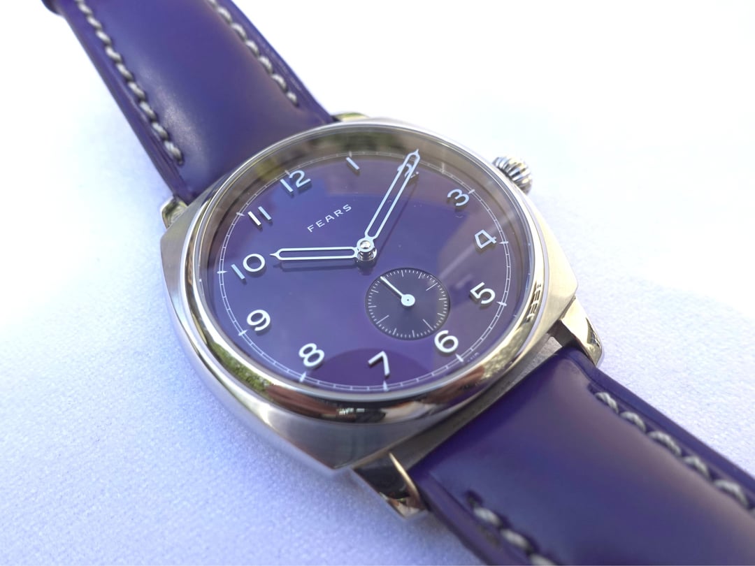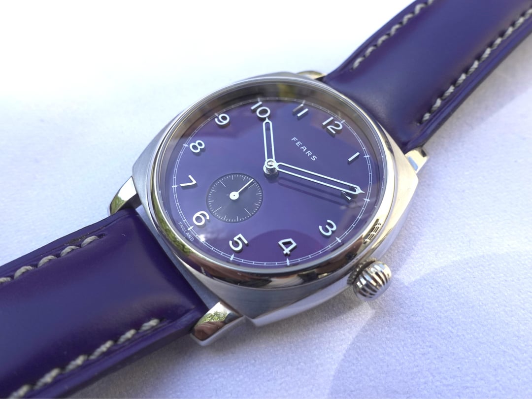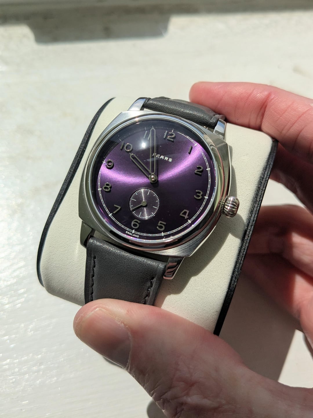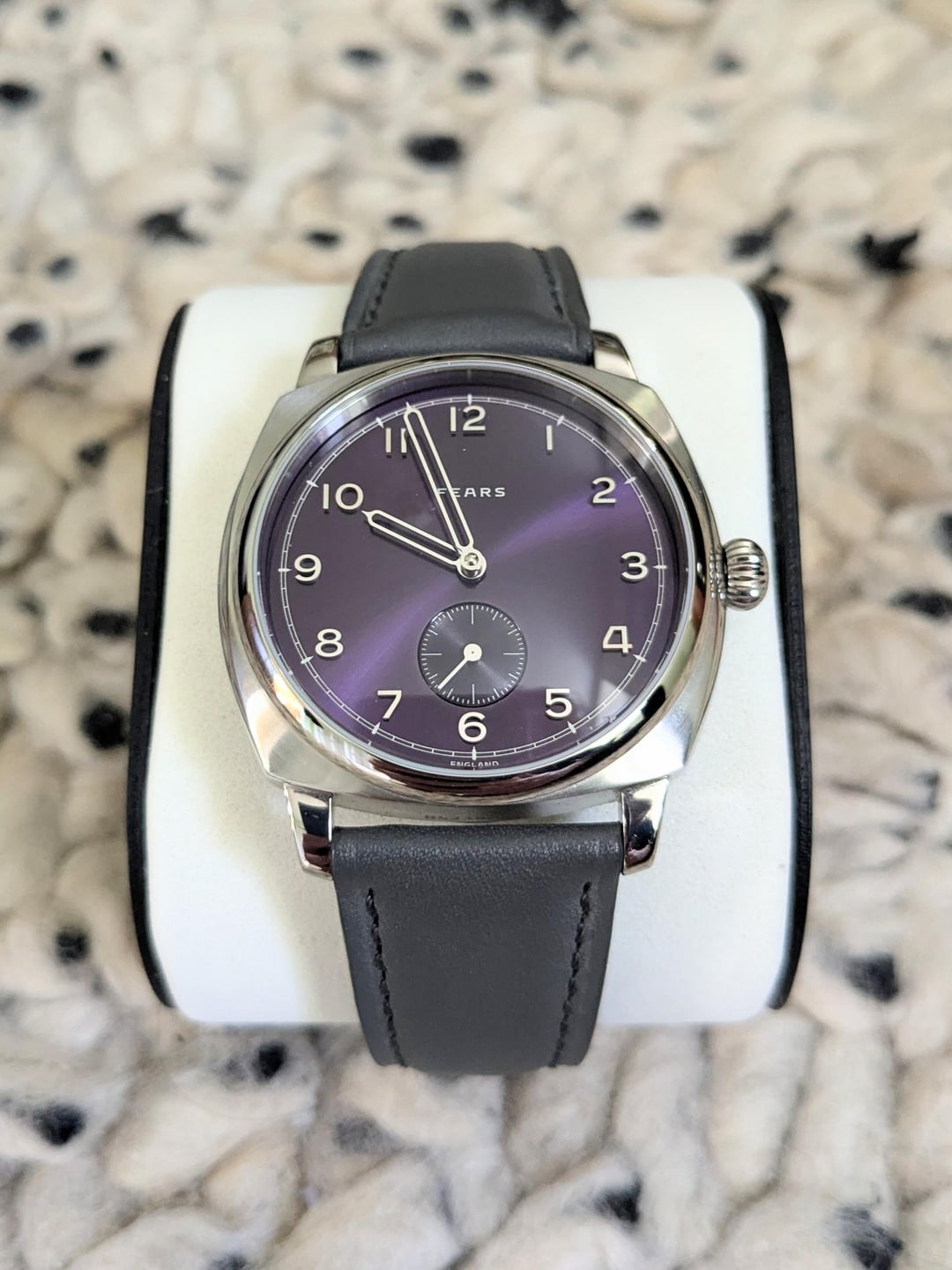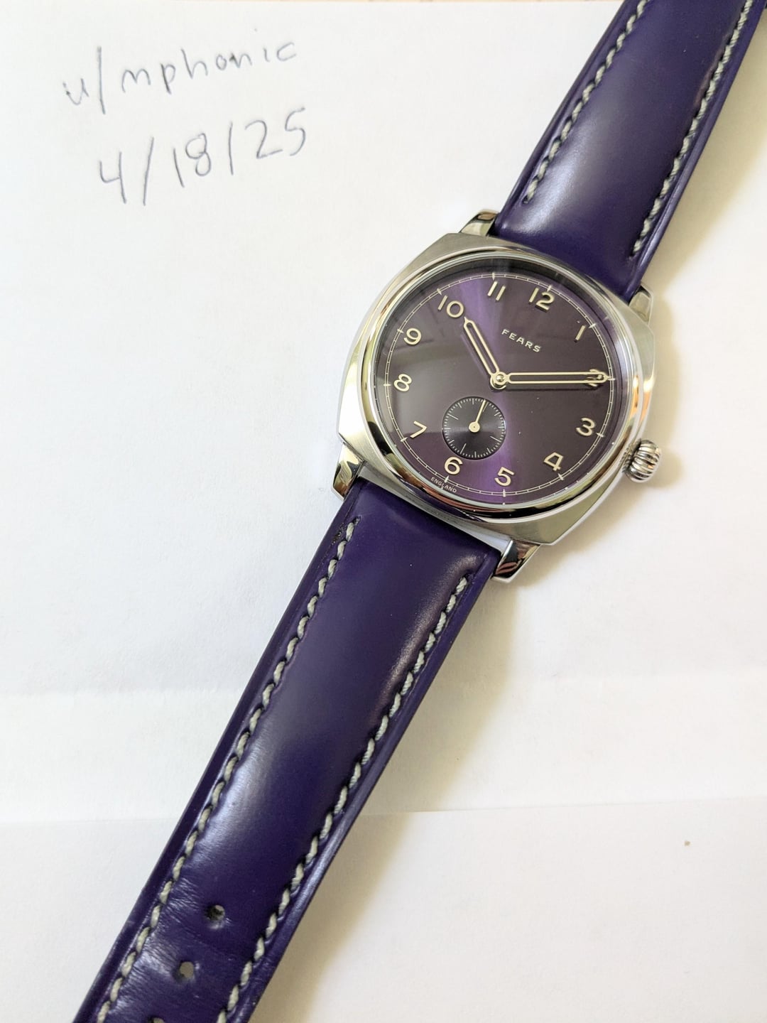 For sale is this Fears Brunswick Platinum Jubilee Limited Edition with a stunning royal purple dial to commemorate Queen Elizabeth's 70-year tenure. 70 pieces total were produced. If you're not familiar with Fears, it is a family-owned watchmaker in Bristol, England, founded in 1846, crushed by the quartz crisis, and restarted in 2016 by the great-great-great-grandson, a watchmaker himself, of the founder. See [https://www.fearswatches.com/en-us/pages/heritage](https://www.fearswatches.com/en-us/pages/heritage) The Brunswick line is their manual wind, 38mm cushion case model, and it is beautifully designed. I'm a big fan. There's an elegant curve from the edges of the case to the top of the crystal that makes the watch wear especially slim while lending it some dynamism as it sits perfectly on the wrist. If you were looking for a modern cushion-case design that isn't Panerai, I would recommend this above everything else out there (I know that Farer makes some nice ones at a different price point, and I like those, too, but this is next level). The dial is especially striking: a vibrant, rich purple with a classy sunburst. I struggled a great deal to photograph it, and I know that I haven't done it justice. See the original listing for some pro shots [https://www.fearswatches.com/products/brunswickjubilee?\_pos=1&\_sid=eb7825330&\_ss=r](https://www.fearswatches.com/products/brunswickjubilee?_pos=1&_sid=eb7825330&_ss=r) The watch is in excellent condition. I cannot spot any marks, and it is running great. It comes with two straps, purple and grey, both of which are short length and have had only light use. Specs: 38x38mm Stainless Steel Case 42mm Lug to Lug 11.25mm Thin (to top of domed sapphire) 20mm Lug Width Generously Domed Sapphire Crystal Movement: ETA 7001, Handwound Album: [https://photos.google.com/share/AF1QipNQAbIjAk3woVvR2KJsarlczjJw15Bh3ecL86JHL-GEODThJp4wSsxAlQ62cqJgeA?key=NHhwb3RkR0c5VzA3bUgyQ0JqekRub3NIbkNqaGt3](https://photos.google.com/share/AF1QipNQAbIjAk3woVvR2KJsarlczjJw15Bh3ecL86JHL-GEODThJp4wSsxAlQ62cqJgeA?key=NHhwb3RkR0c5VzA3bUgyQ0JqekRub3NIbkNqaGt3) Timestamp: [https://photos.google.com/share/AF1QipNe9akHwWjFjA\_CaKnMMOdWfZa0ajXea3zi-HoqHKGRy0--kXVAG1hZzzdrSi8fXw?key=eXlLUU9Xbm9leFFGRmhTMWZ2VUVLVVNiMXlLcHRB](https://photos.google.com/share/AF1QipNe9akHwWjFjA_CaKnMMOdWfZa0ajXea3zi-HoqHKGRy0--kXVAG1hZzzdrSi8fXw?key=eXlLUU9Xbm9leFFGRmhTMWZ2VUVLVVNiMXlLcHRB) Asking $3,300 shipped, CONUS. Zelle preferred. Venmo or PayPal GS under discretion. No trades at this time. Reasonable offers entertained.