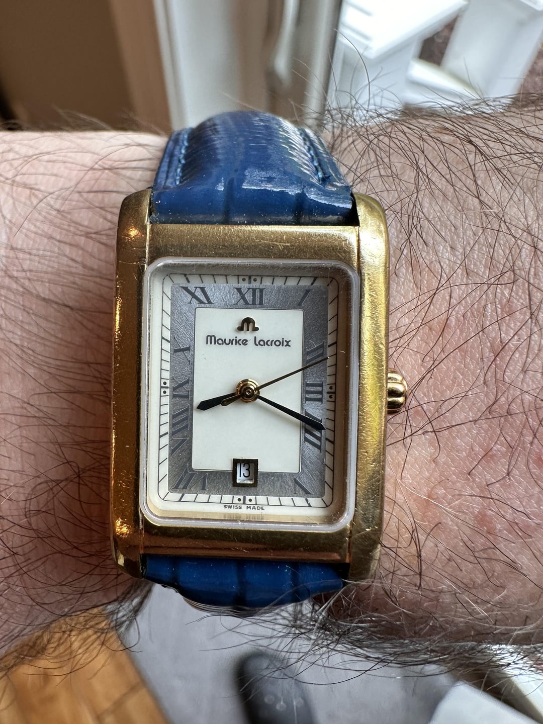 **Method of payment:** Paypal preferred **Open to reasonable offers!** Watches are presented left to right as in the first picture. **Maurice Lacroix "Miros" Tank (quartz, reference 79755):** **~~$150~~** **$99 shipped CONUS** I bought this watch from the EU via Chrono24. Somewhat of a catch and release since the tank size is a bit too small for me. Quartz movement. Good condition. Case dimensions are 33mm x 22mm, and around 6mm thick. Quartz movement. Day/date function, keeping good time. Comes with blue strap.