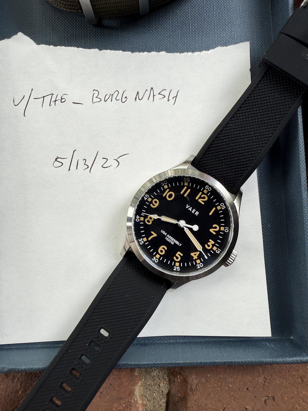 Up for sale is my Vaer C5 Korean Field 40mm USA Solar, a rugged and reliable field watch that combines classic military aesthetics with modern solar-powered technology. This watch pays homage to the timepieces worn by Allied soldiers during the Korean War, featuring a deep-etched caseback of the Korean Peninsula as a tribute to their service. Specifications: • Case: 40mm diameter, 48mm lug-to-lug, 10.4mm thickness, 316L stainless steel • Crystal: Single-domed sapphire with anti-reflective coating • Movement: Japanese Epson VS42 solar-powered quartz; 6-month power reserve from 6 hours of light • Water Resistance: 10 ATM (100 meters) • Dial: Matte black with Old Radium lume; 24-hour markers • Strap: 20mm quick-release nylon strap (Khaki) • Weight: 64 grams • Assembly: Assembled in the USA Condition: The watch is in excellent like new condition with minimal signs of wear. The sapphire crystal is flawless, and the case shows only minor surface marks consistent with gentle use. The strap is clean and has plenty of life left. Included: • Original Vaer packaging • Quick-release nylon strap (black) and Vaer NATO Strap (Green) • No card or Manual, they are MIA Price: $250 USD shipped within the CONUS via USPS Priority Mail. Payment through PayPal Goods & Services (add 3% for fees) or Friends & Family at your discretion. No trades at this time. Feel free to reach out for additional photos or questions.