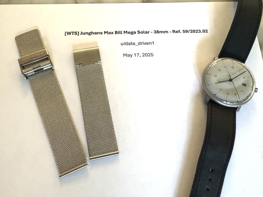 Selling my Junghans Max Bill Mega Solar. I got this in a multi-watch trade a week or so ago and love it - but trying to pare down my collection a bit. This model is the radio-controlled solar model in the classic Max Bill design from Junghans. It features a lightweight titanium case and sapphire crystal and really cool solar-charging tech through the dial. **Specs:** * Case: Titanium, matte finish * Diameter: 38mm * Thickness: 9mm * Lug width: 20mm * Movement: J101.85 radio-controlled solar quartz * Water resistance: 5 bar * Dial: Matte grey with printed numerals * Strap: Original Junghans leather strap with signed buckle plus the Milanese mesh bracelet with signed buckle * Solar-powered movement with radio-controlled time sync * Perpetual calendar * Full write-up from Junghans here: [https://www.junghans.de/en/collection/watches/junghans-max-bill/max-bill-mega-solar/59202302](https://www.junghans.de/en/collection/watches/junghans-max-bill/max-bill-mega-solar/59202302) **Condition:** Watch is in pristine condition. No signs of wear that I can see with the naked eye. Everything functioning perfectly. **Includes:** * Full box and papers - dated March 2024 * Original Junghans leather & Milanese mesh straps with buckles **Price:** $985 shipped CONUS via USPS Priority. (MSRP is $1450) Payment via Zelle or PPFF. Feel free to reach out with any questions. Thanks for looking!