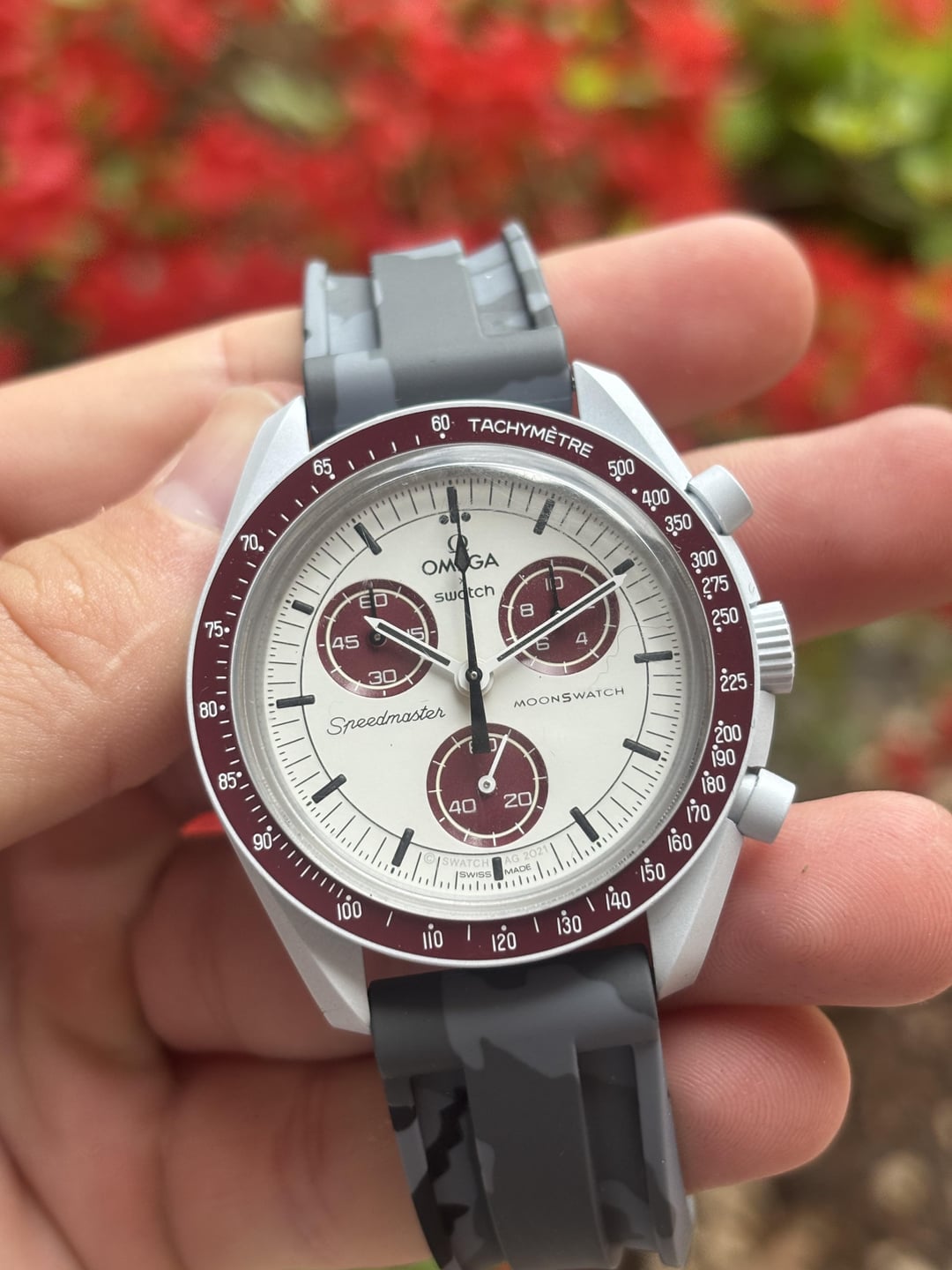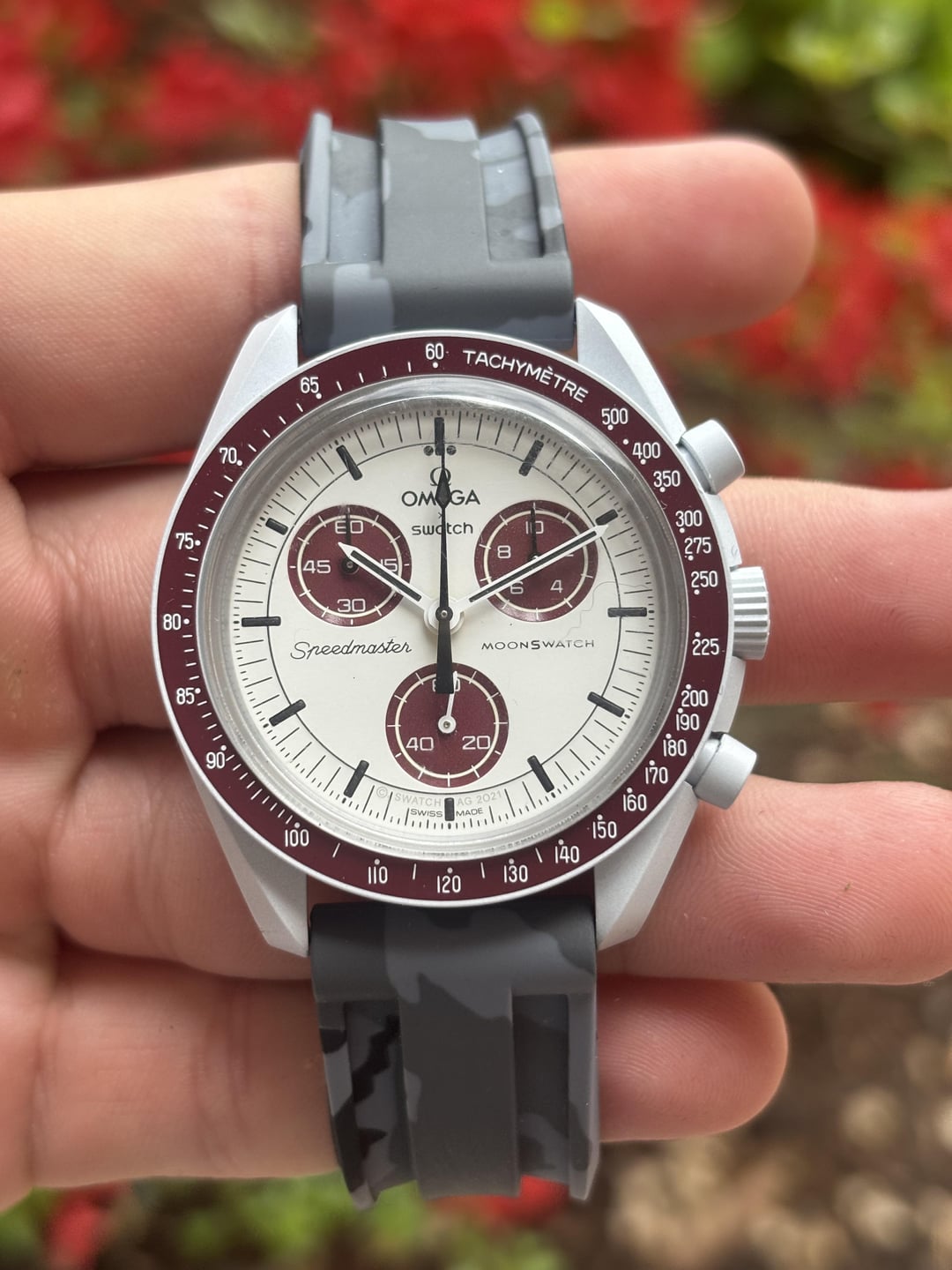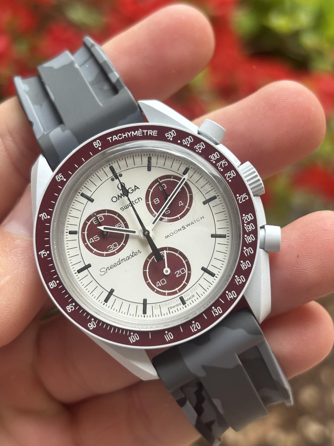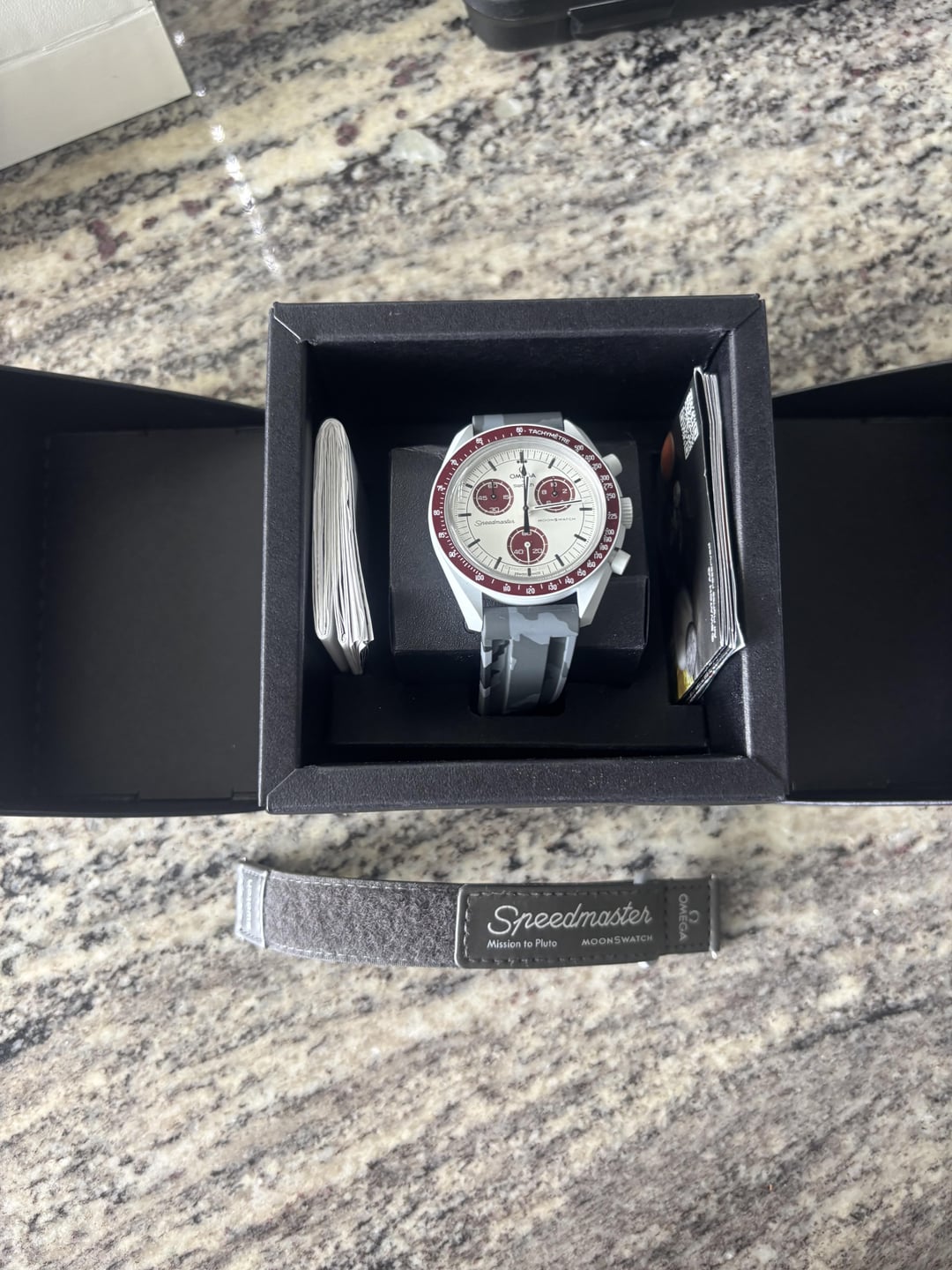 [WTS] Omega x Swatch MoonSwatch – Mission to Pluto 🚀 • Price: $210 • Condition: Pre-owned; full set with box and papers. • Details: 42mm Bioceramic case, quartz chronograph movement, 3-bar water resistance, cream dial with burgundy subdials and bezel, gray Velcro strap.  • Payment: PayPal FF, Wire, Venmo, Cashapp • Location: East Lansing, MI • Shipping: CONUS shipping included; international shipping available at buyer’s expense • Trades: Not accepted at this time • Financing available Let me know if you need further information or have any questions!