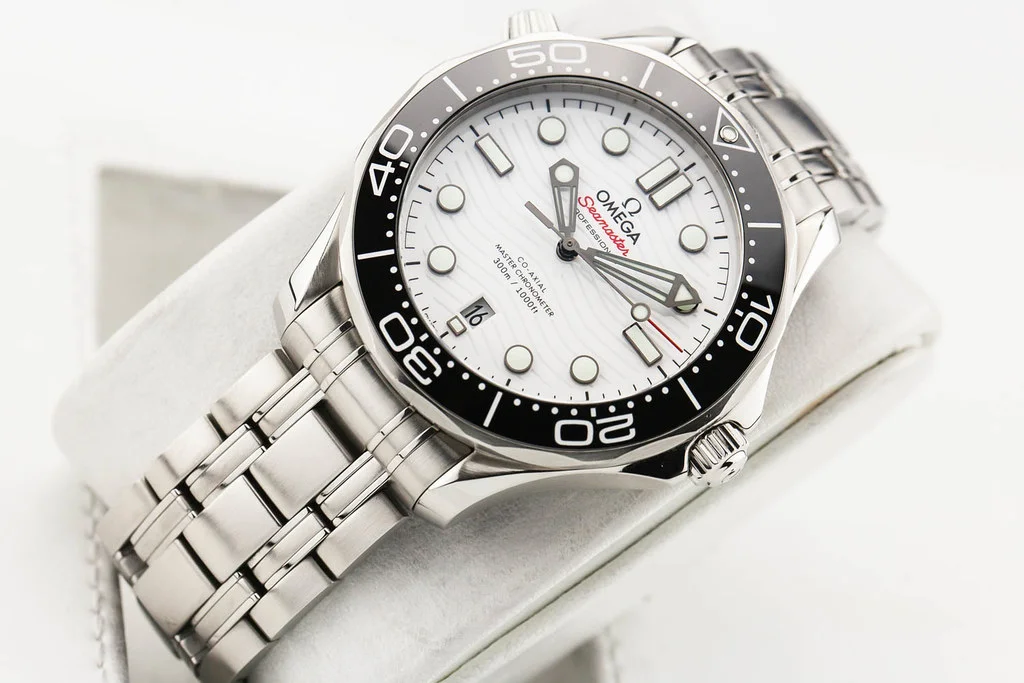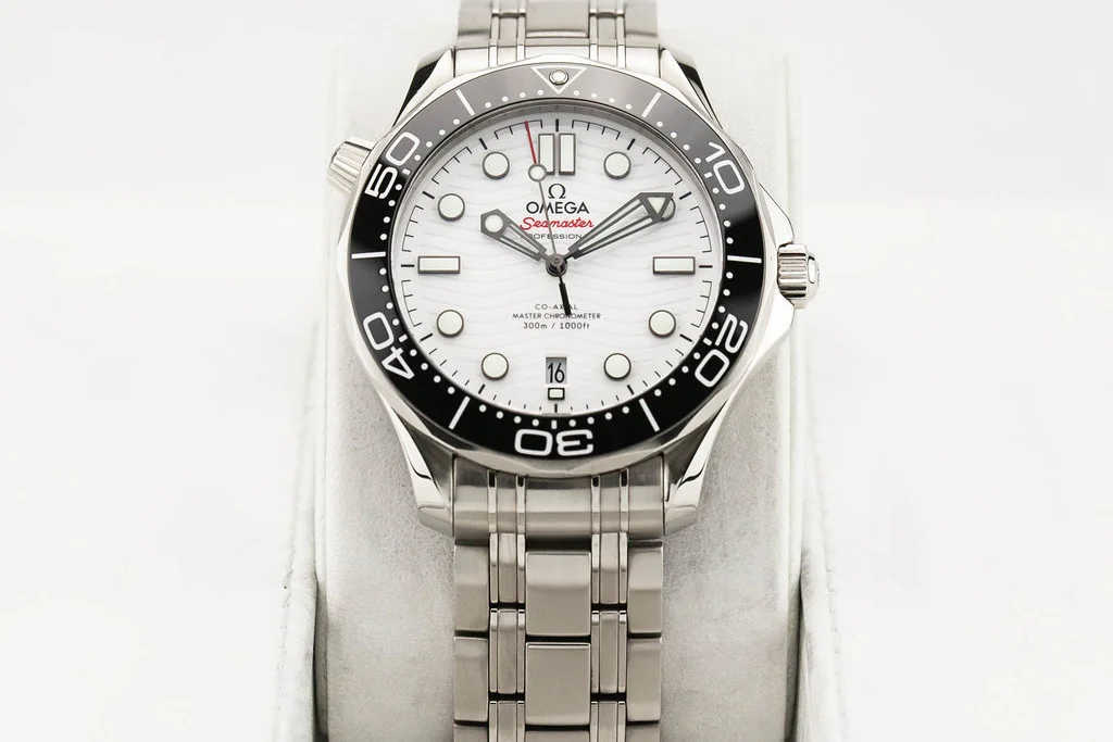 Up for sale is an excellent condition Omega Seamaster 300 42mm 8800, White Dial / Black Bezel on Bracelet, reference # 210.30.42.20.04.001 It comes complete with all boxes, papers, booklets, hang tag and Omega Warranty Card dated February 2020.