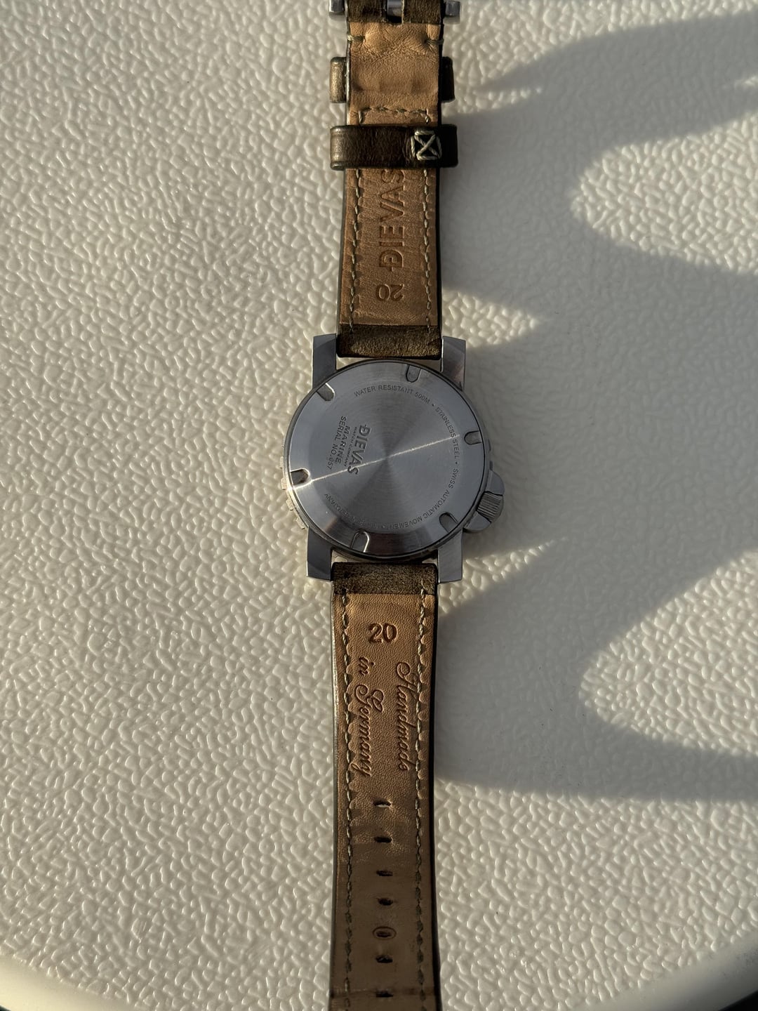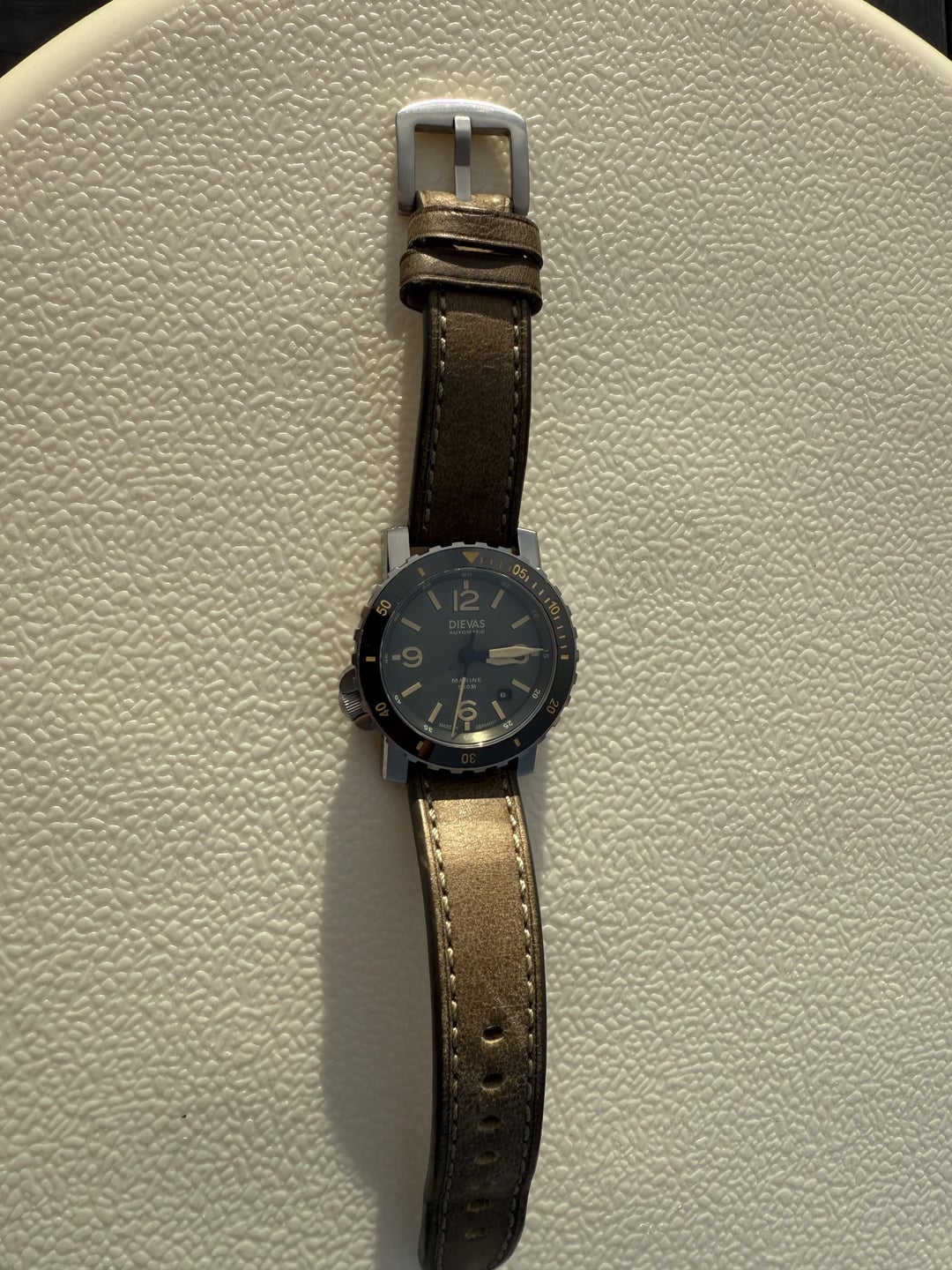 For sale is good condition Dievas Marine 500 Mojave. It has stylish dial design and quality case construction. This model has been discontinued for a while, so not easy to find. Specs: ETA2824-2 automatic movement, High grade 316L stainless steel case, ceramic bezel, flat sapphire crystal with AR coating, 8-o'clock screw-down crown (the watch is designed to be worn on the right hand), SuperLuminova dial treatment, 500 meter water resistance, OEM leather strap (buckle is aftermarket). It comes with the box and papers (stamped by AD from Singapore). Price is $495 shipped to USA. I am open to shipping abroad if you cover the extra cost. In terms of trades, I would be interested in trading up to Longines, Oris, Sinn, Laco, Stowa, Damasko. Thanks! Timestamp: [https://imgur.com/qDLQEoq](https://imgur.com/qDLQEoq)