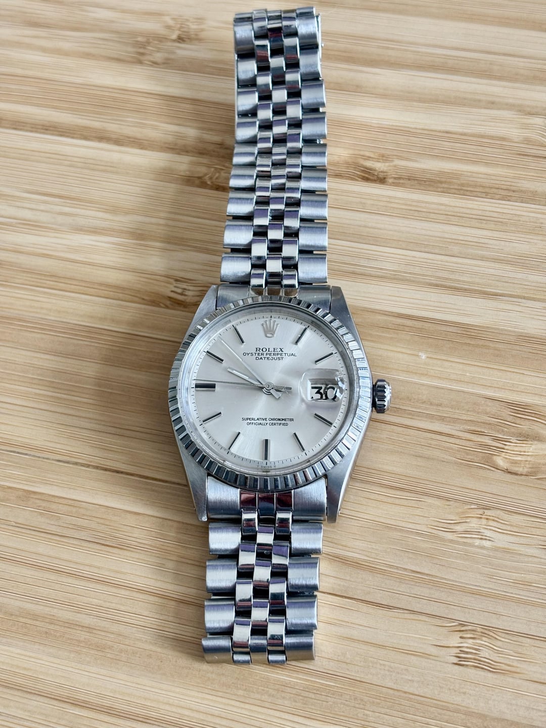 **Timestamp:** [https://imgur.com/a/R7OhQ7v](https://imgur.com/a/R7OhQ7v) This vintage Rolex Datejust ref. 1603 from 1962 is a standout example of one of Rolex's most iconic and long-lasting collections. It features a discontinued engine-turned bezel, more tapered lugs, acrylic crystal, and a fascinating silver "Pie Pan" dial with sloped edges, older-style indices, older-style hands, and Tritium. The 36mm stainless steel case is paired with a 5-piece Jubilee fold-over bracelet with oysterclasp. This is a standout example of Rolex's enduring design language, blending vintage charm with everyday wearability. The watch was purchased from Bob's Watches (very reputable dealer) and comes with a Certificate of Authenticity produced by WCSA. The watch is in good vintage condition, with some minor hairlines on the crystal, but nothing distracting. There is one speck on the dial, and the "30" on the date window contains a scratch that adds a ton of character to it (visible in the pictures). The watch has been sized to a 6.3" wrist, but comes with the extra jubilee links that would accommodate up to a 7.25" wrist. No box or papers, but comes with a clean certificate of authenticity as mentioned above. **Movement:** 1570 and keeping good time. **Price:** $5375 shipped (CONUS, fully insured via FedEx/UPS) **Payment:** Zelle, bank wire, or PayPal F&F for established members Feel free to DM with questions or for more pics. Thanks for looking!