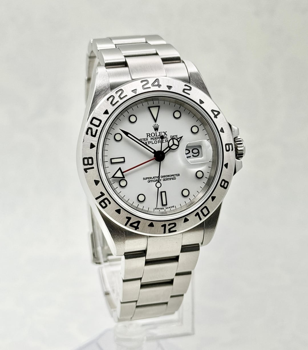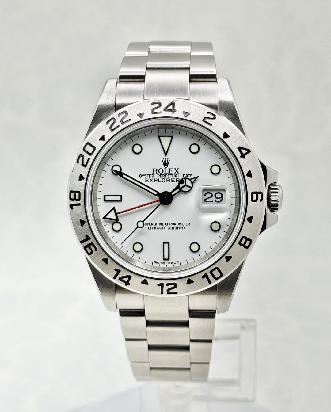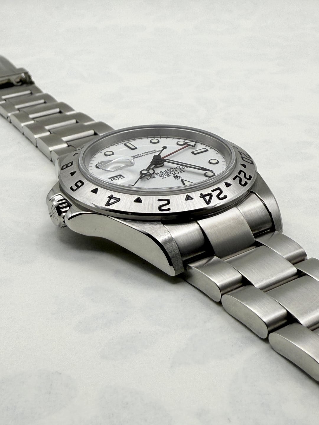 **\[WTS\] Rolex Explorer II "Polar" - 16570 - 2005 - Serviced** [MORE PICS](https://www.grailtimeco.com/2005-rolex-explorer-ii-polar-f-serial/) [TIMESTAMP](https://imgur.com/Au46vh1) [TIMEGRAPHER STATS](https://imgur.com/lvZT8xf) [INSTAGRAM](https://instagram.com/grailtimeco) **As White As Polar Snow** When you hear a Rolex watch referred to as “The Polar Explorer”, the reference 16570 with a white dial is what they are talking about. The Explorer II was developed in the 1970s for cave explorers. Featuring a fixed 24-hour bezel and coordinating red arrow GMT hand on the dial to allow cavers to distinguish between day and night hours. For most wearers , the GMT complication is best served to track a second time zone. This 2005 Explorer II is in superb all round unpolished condition with the case showing the factory cut chamfers and no scratches on the case or bracelet. The case back sticker is still present showing just how lightly this watch has been worn. Very unusual to find an Explorer II in this condition. Watch has received a full movement service and pressure test. Features a no holes case, solid end links and a bracelet fitting just over a 7.75" wrist. Watch comes as full set with 2005 warranty papers, serial tag, swing tag, booklets, inner and outer box plus Grail Time Co watch roll. **$8,950** shipped Fedex next day, fully insured, to the USA or arrange pick up from Hoboken, NJ. Can ship internationally if you provide the label. Wire payment, zelle or paypal friends and family. Please feel free to contact via Reddit DM with any questions. **As per sub rule, please comment “PM” before sending a PM or DM.** Thanks Plenty of references available from Reddit Watch Exchange and Rolex Forums and on my Website. **Grail Time Co LLC**