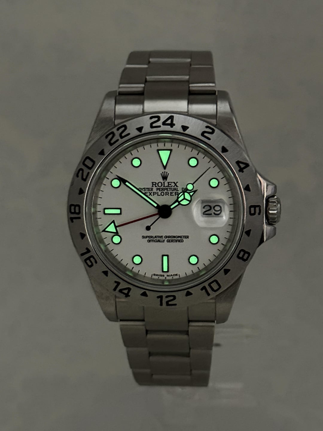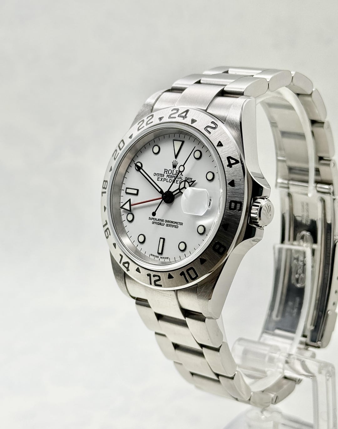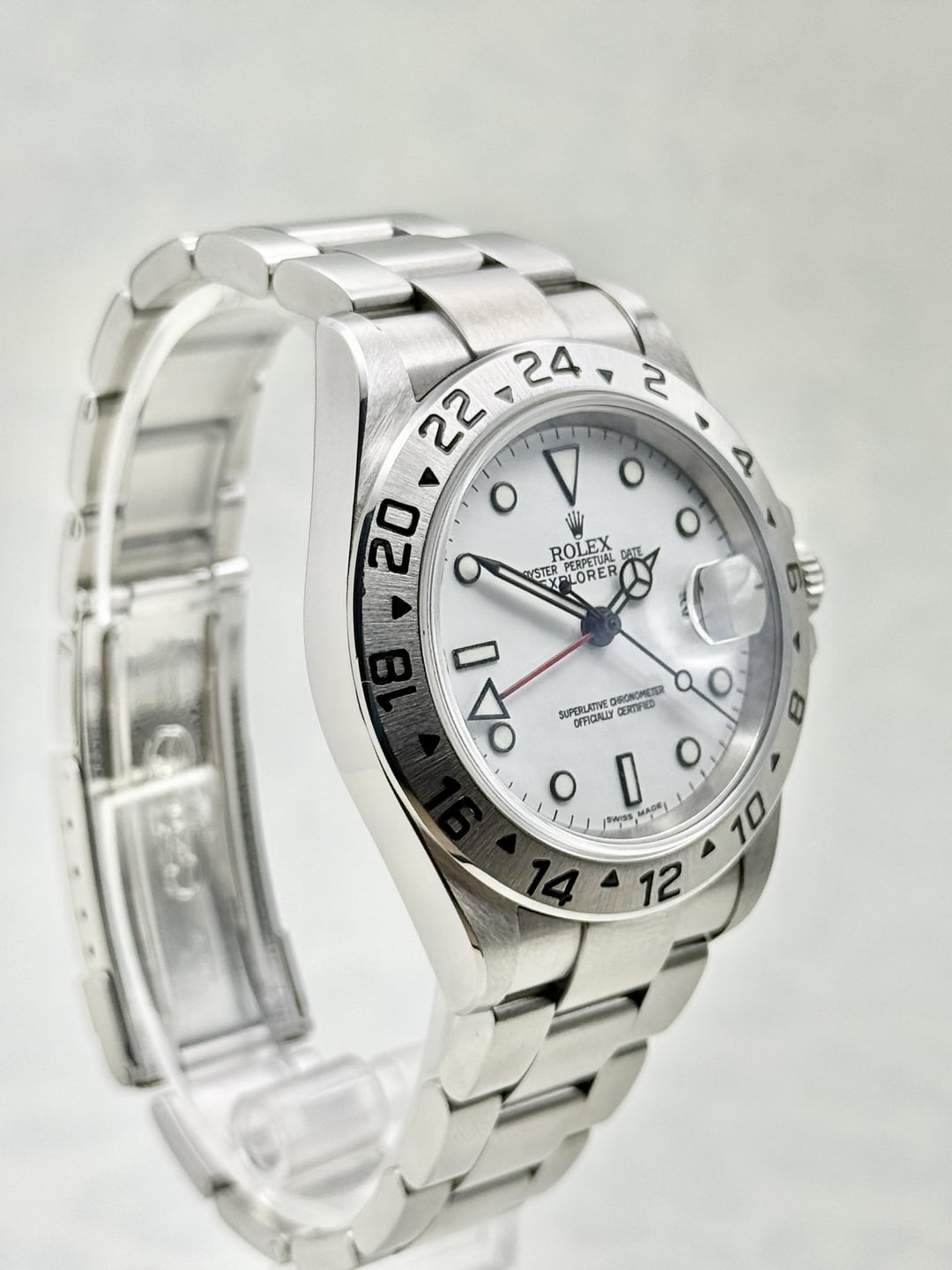 **\[WTS\] Rolex Explorer II "Polar" - 16570 - 2005 - Serviced** [MORE PICS](https://www.grailtimeco.com/2005-rolex-explorer-ii-polar-f-serial/) [TIMESTAMP](https://imgur.com/Au46vh1) [TIMEGRAPHER STATS](https://imgur.com/lvZT8xf) [INSTAGRAM](https://instagram.com/grailtimeco) **As White As Polar Snow** When you hear a Rolex watch referred to as “The Polar Explorer”, the reference 16570 with a white dial is what they are talking about. The Explorer II was developed in the 1970s for cave explorers. Featuring a fixed 24-hour bezel and coordinating red arrow GMT hand on the dial to allow cavers to distinguish between day and night hours. For most wearers , the GMT complication is best served to track a second time zone. This 2005 Explorer II is in superb all round unpolished condition with the case showing the factory cut chamfers and no scratches on the case or bracelet. The case back sticker is still present showing just how lightly this watch has been worn. Very unusual to find an Explorer II in this condition. Watch has received a full movement service and pressure test. Features a no holes case, solid end links and a bracelet fitting just over a 7.75" wrist. Watch comes as full set with 2005 warranty papers, serial tag, swing tag, booklets, inner and outer box plus Grail Time Co watch roll. **$8,950** shipped Fedex next day, fully insured, to the USA or arrange pick up from Hoboken, NJ. Can ship internationally if you provide the label. Wire payment, zelle or paypal friends and family. Please feel free to contact via Reddit DM with any questions. **As per sub rule, please comment “PM” before sending a PM or DM.** Thanks Plenty of references available from Reddit Watch Exchange and Rolex Forums and on my Website. **Grail Time Co LLC**