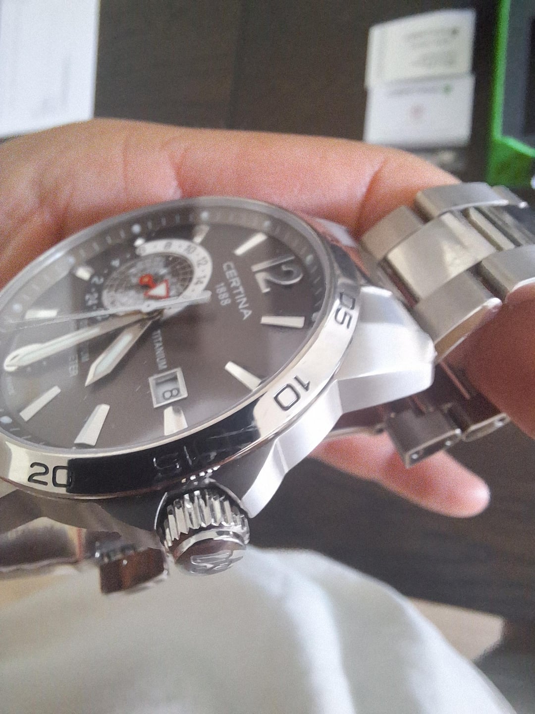 Certina DS Podium GMT COSC certified HAQ, Titanium Item No. C034.455.44.087.00 $180 Beautiful grey/brown diall that is tough to do justice in photos. Catch & release for me, only selling as it is slightly too large for me. Currently sized to my 6.25" wrist, but includes extra links + full kit. Great conditon. Only minor cosmetic callouts that I tried to capture: two very light scratches on the bezel by the crown and some minor desk rash. CONUS only. PayPal (f&f preferred, or g&s fees on buyer), Venmo, or Zelle. Happy to provide additional info, pictures, video, etc. Thank you for looking! [Link to additional specs](https://watchbase.com/certina/ds-podium/c034-455-44-087-00) [Link to retail listing](https://www.jomashop.com/certina-watch-c034-455-44-087-00.html)