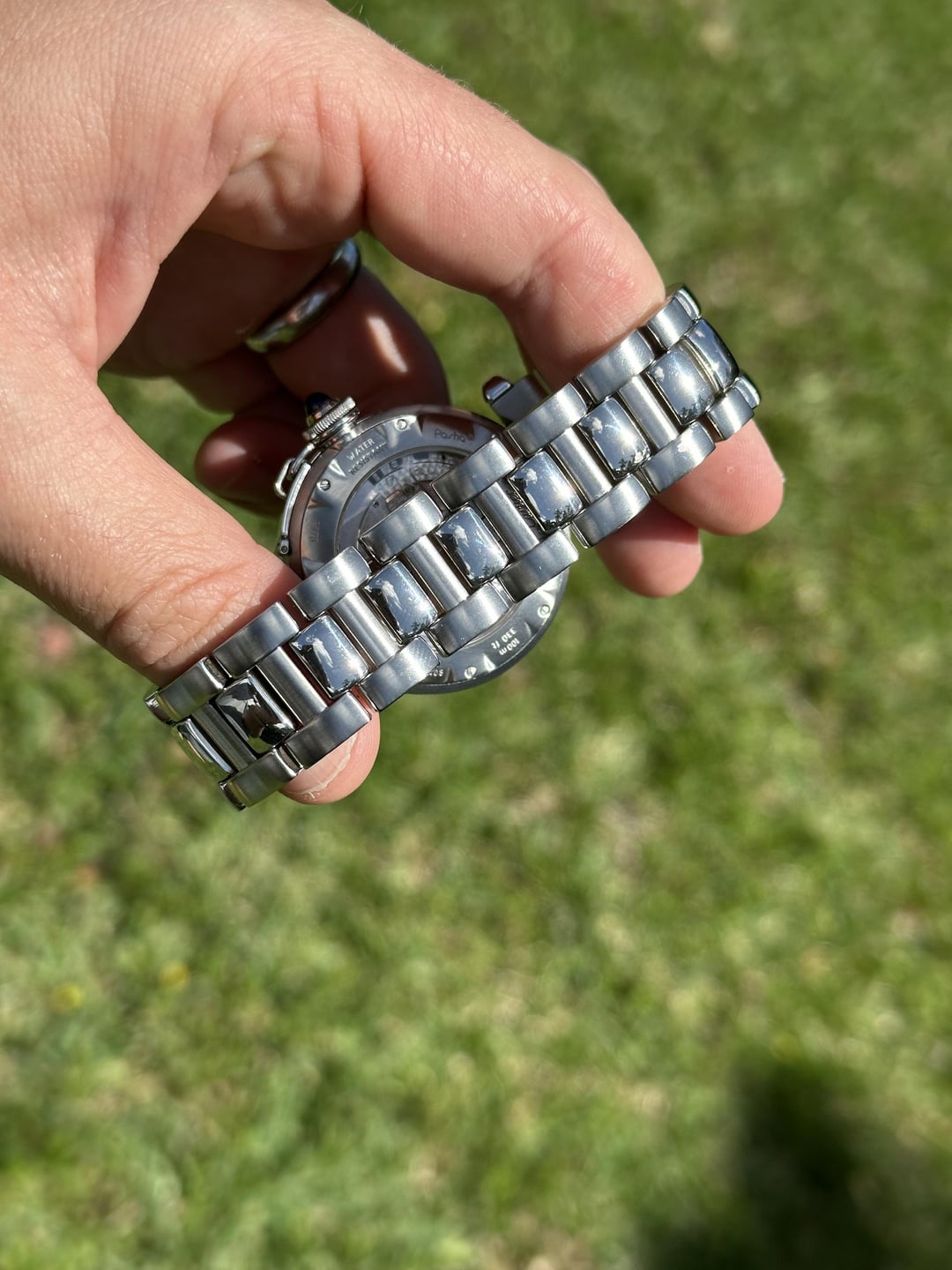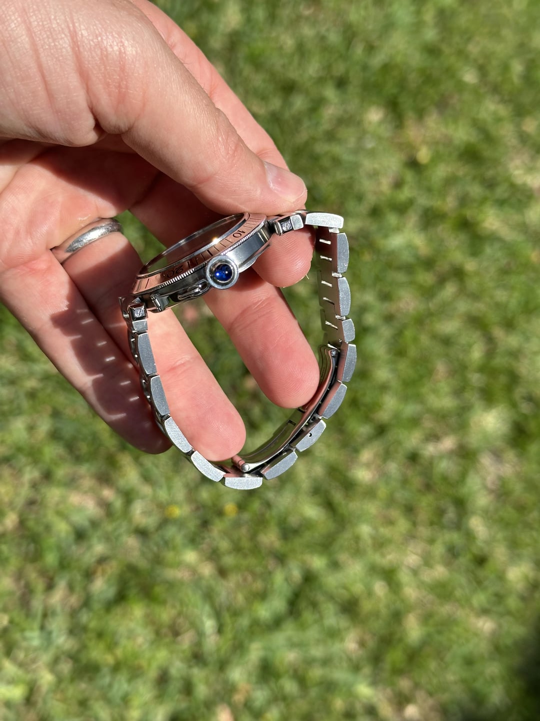 The legend behind the Cartier Pasha is that in the 1930s, the Pasha of Marrakech, Morocco, sought a watch with waterproof resistance beyond that available at the time, and in response Cartier designed the Pasha, most uniquely distinguishable for its large waterproof crown cover chained to the side of the watch. Originally a custom watch, Cartier put variants of the model into production, running from 1985 through to today. Up for sale is one of those such models--a Cartier Pasha Reference 2738, dating back to the 2000s. This Pasha measures in with a robust 38mm diameter stainless steel case. The watch comes on its original Cartier bracelet. It features a guilloche finish silver dial in the front, with its automatic and Cartier-decorated automatic movement visible through a display caseback once the watch is flipped. The Pasha is a true Cartier sport watch, while at the same time never abandoning Cartier's commitment to design. This watch features tritium on the indices that has darkened and no longer glows due to its age. The blued steel sword hands for the watch originally had tritium lume, but I asked my watchmaker to skeletonize the hands. I think it makes for a nice compliment to the display case back. The movement in this watch is an automatic Cartier Caliber 191, which is currently running at approximately +5 seconds per day. **Price:** $2,350 **Timestamp:** in photos **Videos:** I can send a video of the watch through my instagram, @WarmDials **Payment and Shipping:** to be agreed upon by the buyer and myself, taking the buyer's purchase history into consideration. **Trades:** I am potentially open to trades. If you intend to propose a trade, please include in your message the proposed value of the watch you are intending to trade I'm located in the United States and frequent user in this community. I have bought and sold often, and I'm happy to answer any questions you may have / provide more photos or a video. You can find me on instagram at @WarmDials. Don't hesitate to reach out if you have any questions or want to chat
