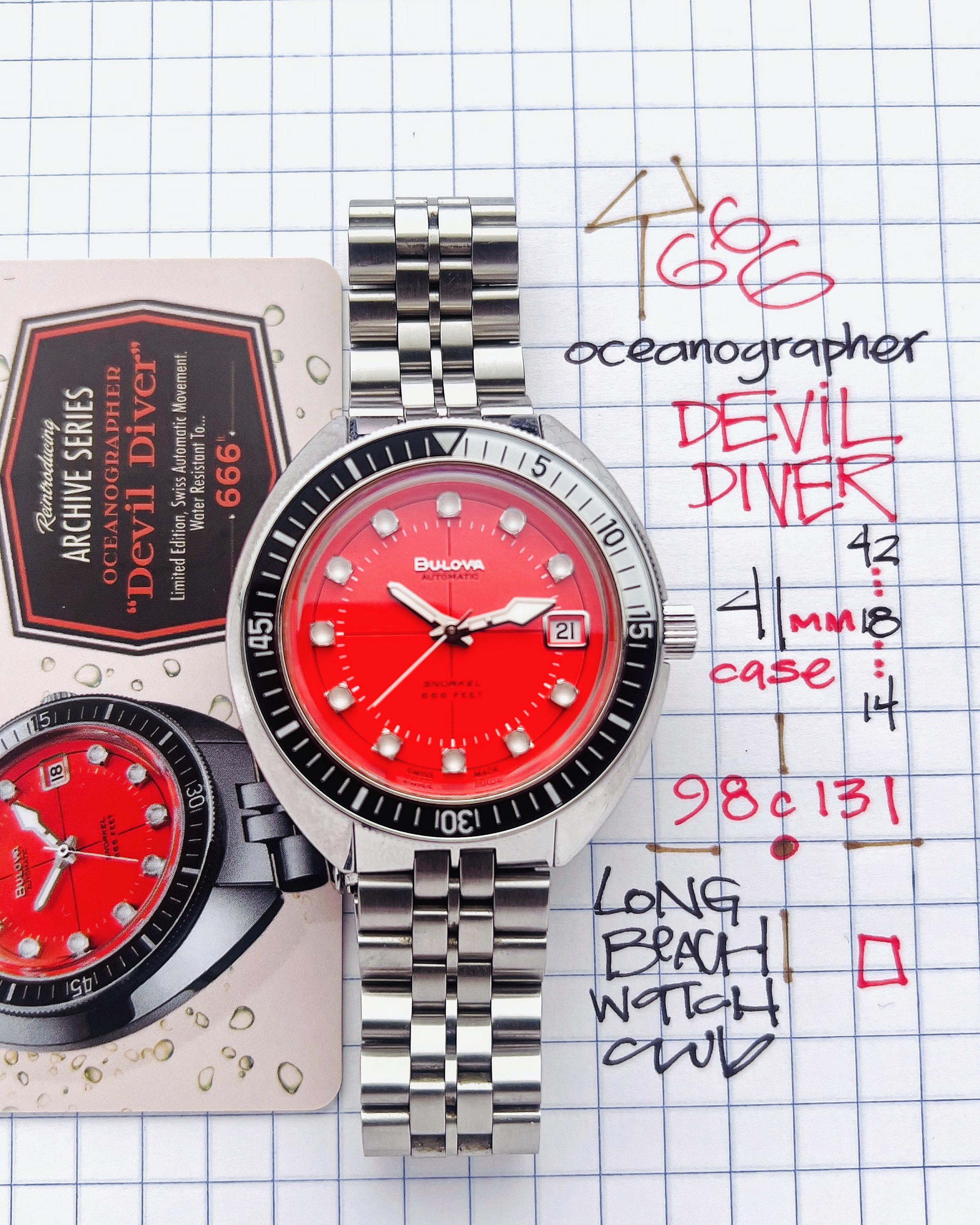 Bulova Devil Diver 666 A faithful modern reproduction of the 1970s original, this snorkel diver reference 98c132 was limited to 666 pieces. Overall this one is used but clean with no damage and minimal signs of use on clasp Kit, video, lume, pix: https://imgur.com/a/XTyHCzQ Timestamp: https://imgur.com/a/nmLxh6V * full set box and papers * will consider trades that make sense but please consider time, shipping, and trade value—not market. - local special: can possibly accommodate at ButterScotch in Downtown Long Beach by appointment - All sales final unless the watch is misrepresented or lost in transit (always fully insured) - Link to [feedback here](https://www.reddit.com/r/WatchExchangeFeedback/search?q=soycowboy&restrict_sr=1&sort=new) & [watchcharts here](https://watchcharts.com/repcheck/user/soycowboy?source=reddit&type=feedback) Asking a *negotiable* **$1050** via bank wire, Zelle, venmo, or possibly PayPal Friends & Family with super strong references or if I know you. Price includes fully insured Fedex shipping in the USA— hand delivery in most of the Los Angeles or Orange County areas with drinks or coffee on me ;). Cheers, Stephen