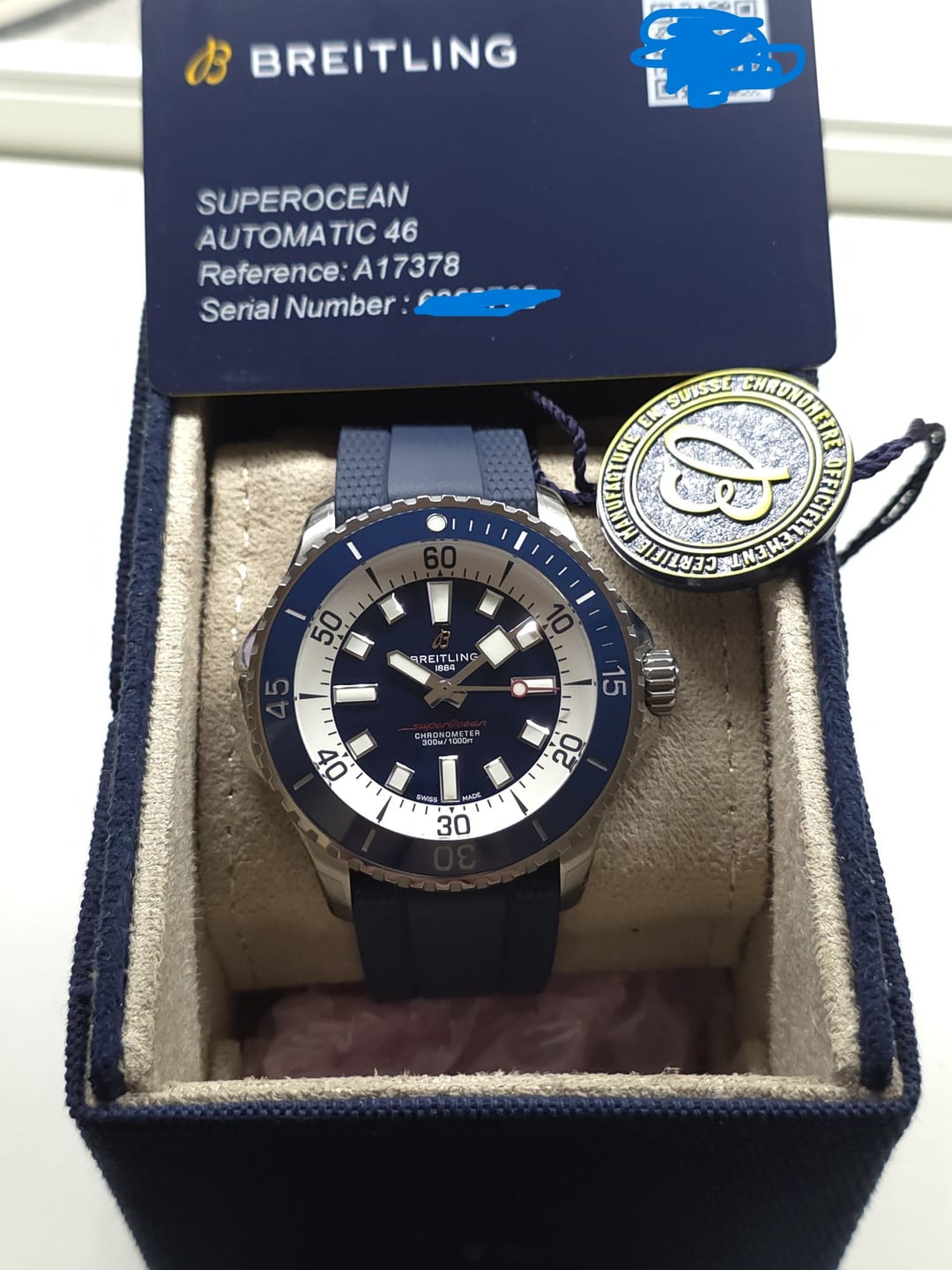 Breitling Superocean 46 Blue Ref:A17378 This watch is in superb shape with stickers still on the case. It will come complete with travel case, warranty card, and hang tag shown. Price = $3699 shipped Pics & Timestamp = [https://imgur.com/a/5RoZXpV](https://imgur.com/a/5RoZXpV) IG = watchfornia Cheers, Adam