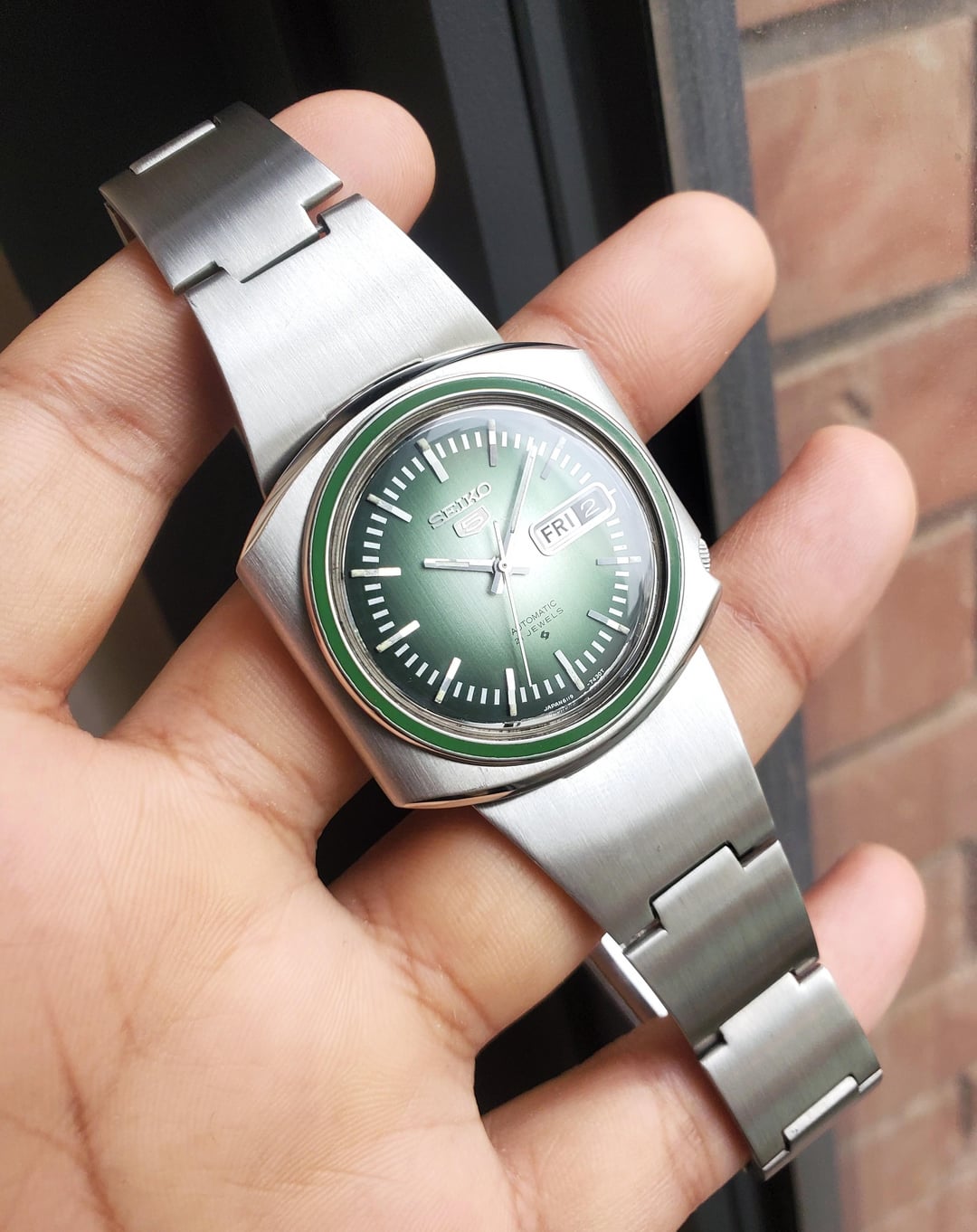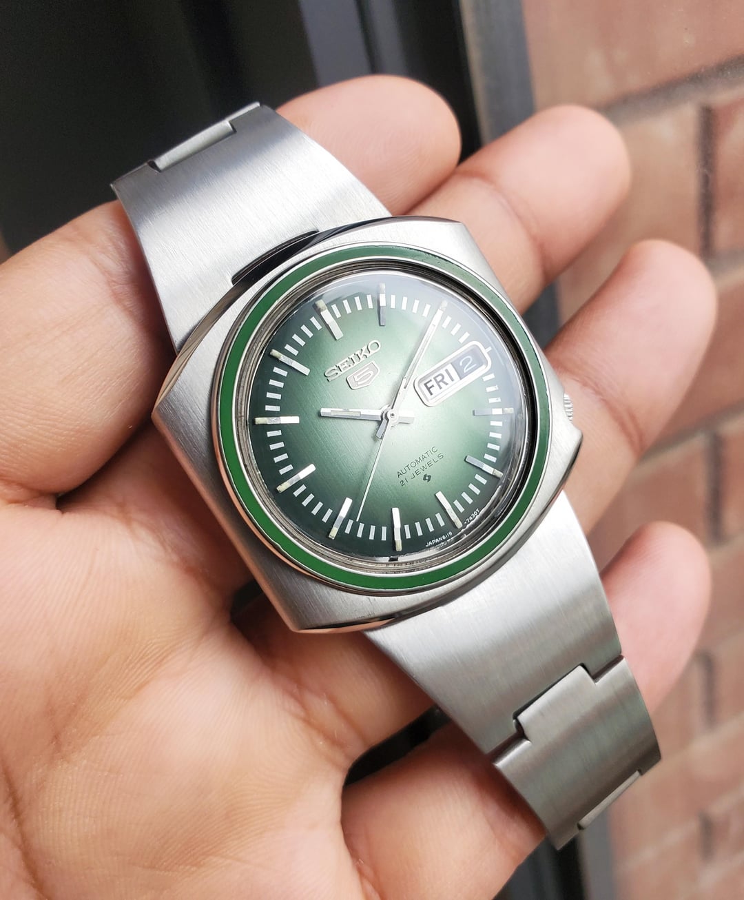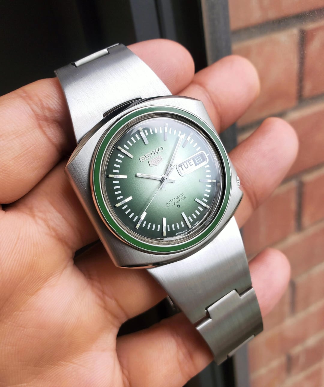 A very cool rare Seiko 5 vintage watch. Unique robust cushion case. Stunning Green brush finished sunburst dial, green bezel. Comes with the original Seiko signed lobster bracelet. Very solid build quality. Amazing condition at 52 year old, ready to be used as a daily driver. Pictures don't do justice to this watch. Looks better upfront. Case is polished keeping all the sharp brushed lines, edges and mirror finishing. Movement has been serviced. Good time keeping. A good collector's piece. Japan stamped on bottom of the dial. PRICE: $279 USD via Paypal, Zelle, Venmo, TransferWise/Wise, Cashapp, Wire, Crypto. FREE shipping worldwide. A great collectible and an investment piece. I have a good number of exchanges here for a safe transaction. Check my Instagram: [https://instagram.com/hour.lust](https://instagram.com/hour.lust) * Manufacturing Year: MAY 1973 * Reference model: 6119-7420 * Case size: 38 mm (w/crown) * Case Thickness: 11 mm * 6119 Automatic Movement Pics: [https://imgur.com/a/mLRgXqR](https://imgur.com/a/mLRgXqR) TS: [https://imgur.com/a/fnBiSE7](https://imgur.com/a/fnBiSE7)