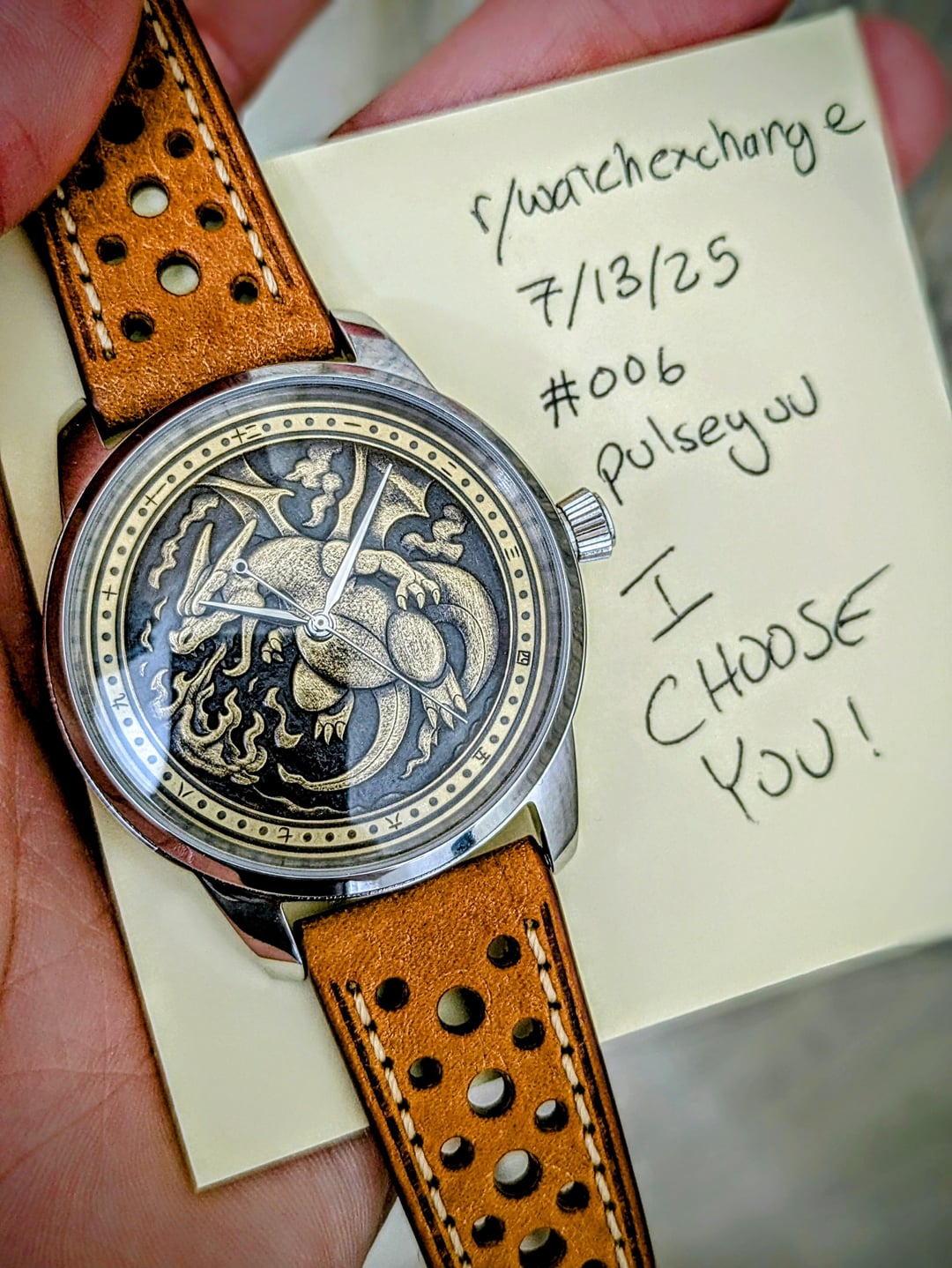 Good morning and happy Sunday. Something a little less serious today, the CCW "006." This dial was designed and made by me on my 50w fiber laser. It has 256 layers to create a 3d effect on the dial, cut out of a 0.5mm sheet of jeweler's bronze and then hand finished with Brass Black, Flitz Polish, and Renaissance Wax. The dial is 35mm which is a gorgeous size, a standard dial is 28.5mm so this dial is about 50% bigger. I have housed the dial in a beautiful 39mm dress watch case and it runs on a new NH38 automatic movement, an absolute workhorse. The watch features an open caseback with a gold adorned rotor. I have a brown or green leather strap available, as well as a brand new Strapcode fine mesh milanese bracelet (my personal favorite). *All of my watches are completely customizable so if you would like to change anything about the watch please shoot me a message and would be happy to create something custom to fit your needs, or customize this dial further.* **Specs** Case Size: 39mm stainless steel dress case w/ open caseback and 20mm lugs. Strap Option #1: Sleek 20mm brown leather strap with steel buckle. Strap Option #2: Very comfortable fine mesh Strapcode milanese bracelet. Dial: Custom designed, lasered, and hand finished 35mm dial featuring the "Tree of Life." 256 layers, for a video of this dial being made please see my IG linked below. Movement: NH38 Movement w/ 41+ hour power reserve, hacking, 24 Jewels, Open caseback with adorned rotor. 12.5mm Thickness Comes with a travel watch pouch for safekeeping :\] **Condition** Everything is brand new and ready to be shipped. Watch was custom-built by me to the highest quality. Message me if you have any questions. **Asking** $299 (leather strap) or $330 (milanese bracelet) shipped to CONUS. Will ship to other countries please contact me with location and I'll see what I can do. Payment via Venmo, Zelle, Cashapp, or Paypal+3%. [Other Custom Watches on my IG](https://www.instagram.com/cacustomwatches/)