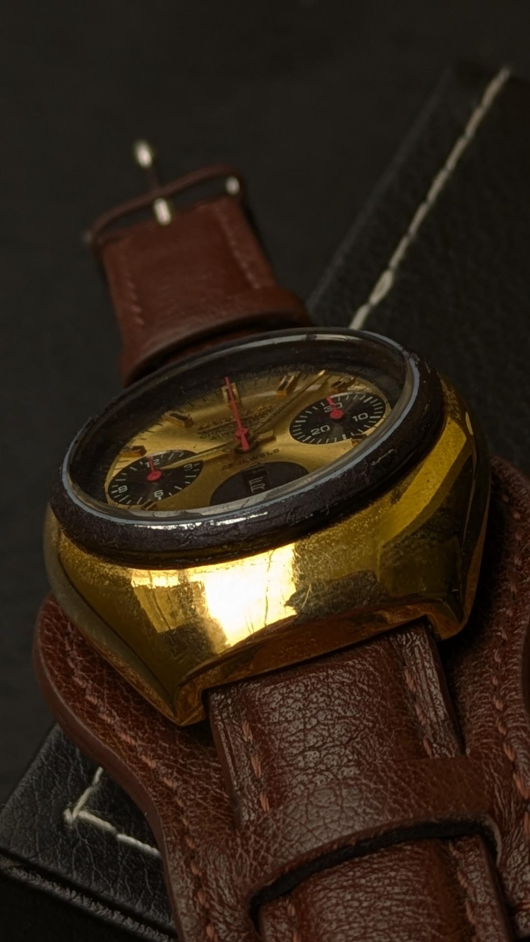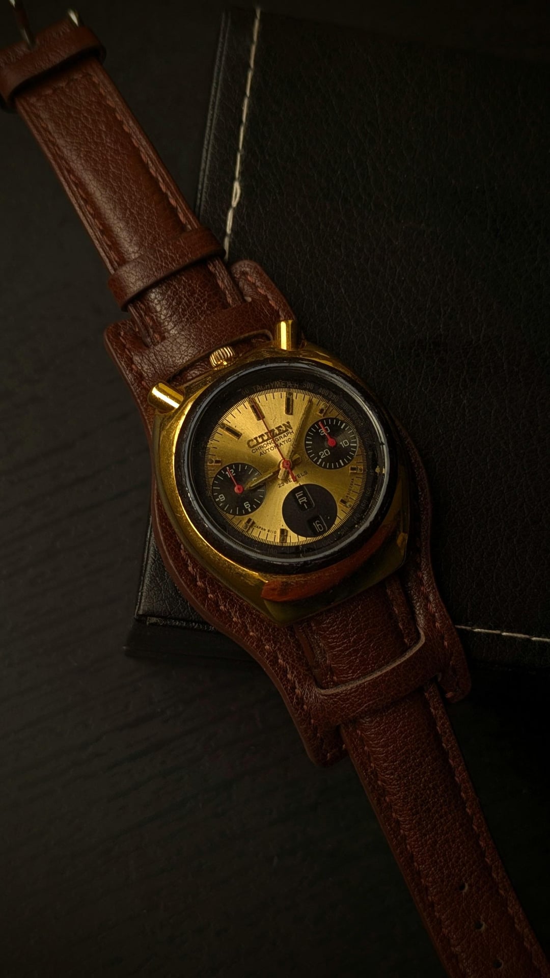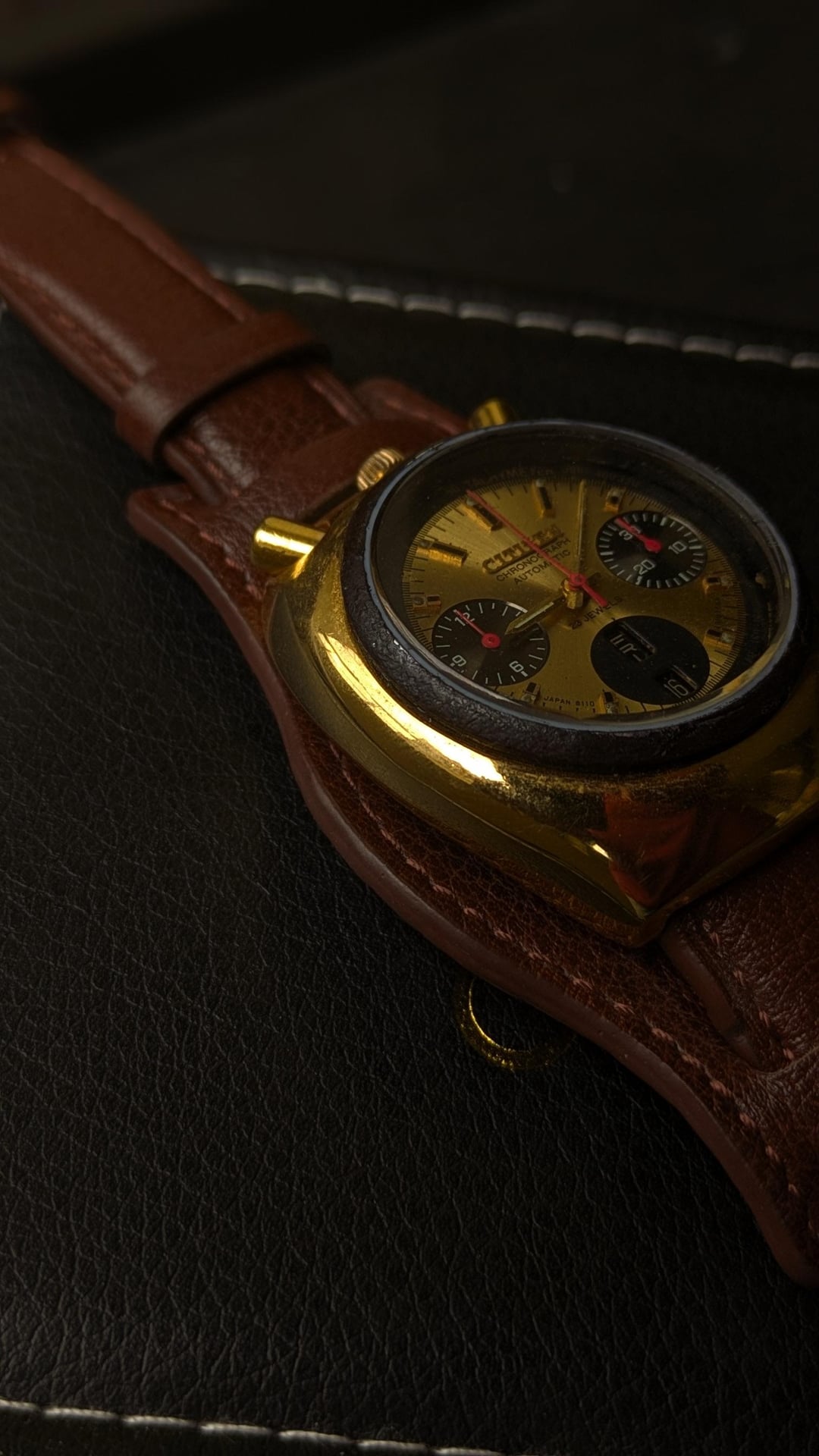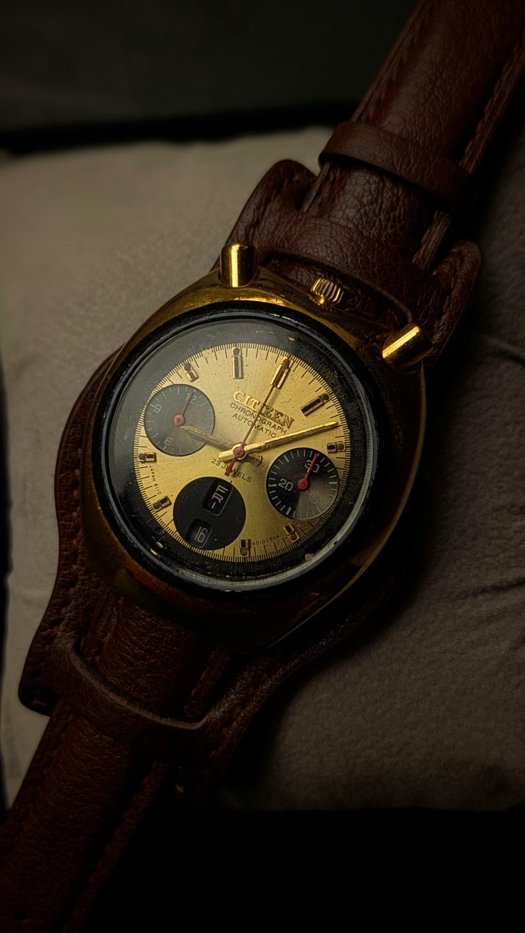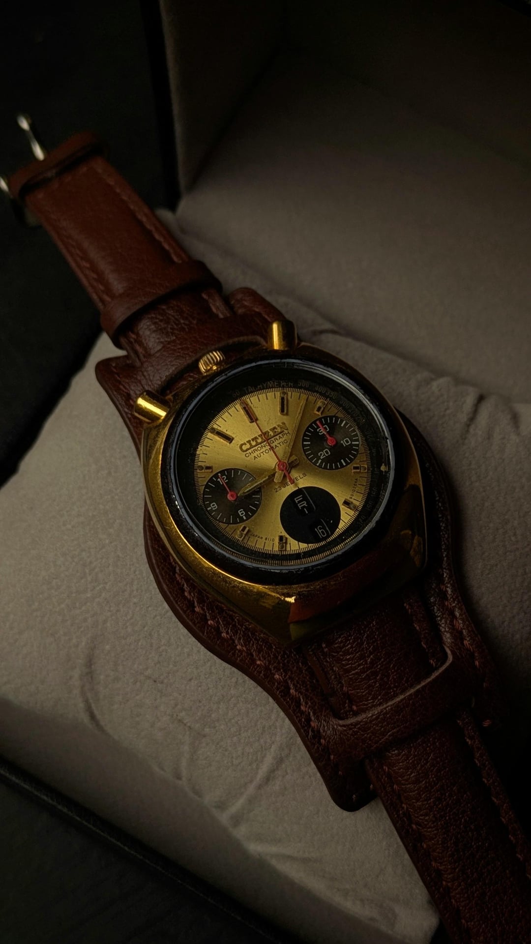 HELLO WATCHFAM , Selling a very rare Citizen Brad Pitt panda Bullhead watcha 1970's Chrono-Matic Automatic timepiece, characterized by its gold face and brown leather strap. THIS WATCH WAS FEATURED IN THE MOVIE "Once Upon A Time In Hollywood" The face features a date display at the bottom . Watch comes with an aftermarket strap . Two smaller dials are positioned on either side of the main face, adding to the watch's intricate design. The overall aesthetic of the watch exudes a sense of classic elegance, making it a stylish accessory for any occasion. Watch have an automatic movement of citizen working good for daily operations (not serviced) This extremely rare vintage Citizen Bullhead chronograph has some wear and tear on it. The case is in its original, unpolished state. Brand: citizen Model: brad pitt Movement automatic Case size: 40mm approx Function: flyback chronograph, day date Reference-4-901177k brad pitt edition 8110 Strap: aftermarket Video: https://imgur.com/a/1OiZ9NR Price: $699 Timestamp: https://imgur.com/a/rEkq3hG