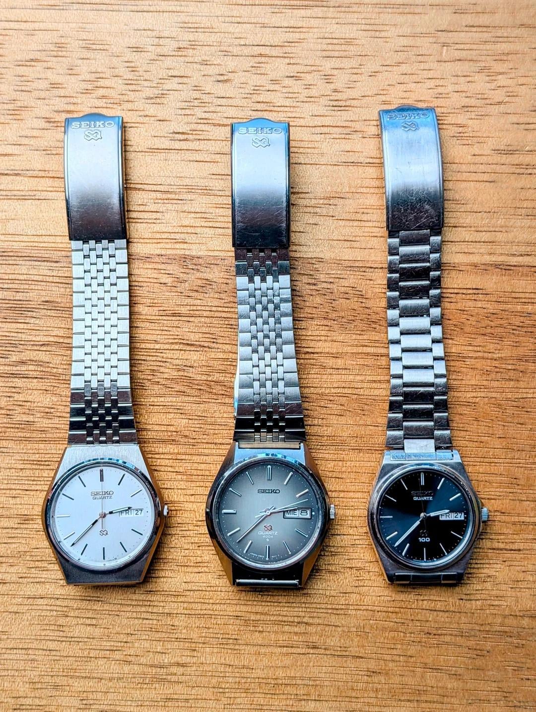 **01 Silver SQ, 8123-7249** * bracelet: \~8" * crystal: new seiko w/ screen protector * case: 34.7mm * movement: new VX43 * battery: new * condition: clean but some wear overall. some minute markers faded between 6 & 7. * **$69 USD shipped US**, PP gift or Venmo **02 Silver Burst SQ 4004, 0903-8019** * bracelet: \~7.25" * crystal: new seiko * case: 36mm * movement: cleaned & lubricated * battery: new * condition: clean but some wear overall * **$69 USD shipped US**, PP gift or Venmo **03 Dark Blue SQ, 100 8123-6150** * bracelet: \~8.25" * crystal: original seiko (no marks) * case: 33.5mm * movement: clean & original * battery: new * condition: clean but some wear overall * **$69 USD shipped US**, PP gift or Venmo shipping is included for the continental US only.