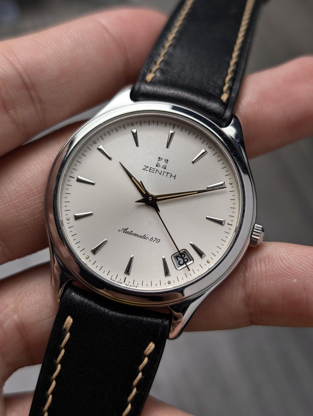 \[RESERVED\] **SPECS:** Manufacturer: Zenith Ref. number: 90/010040 Movement: Automatic (Zenit 670) Case Material: Stainless Steel Crystal: Sapphire Band: Genuine leather strap with Zenith buckle Box/paper: No **CONDITION:** Recently serviced and running at +-10s/day with an amplitude around 260. The watch is in good condition with some light scratches. Everything is original. **DIMENSIONS:** Case (w/out crown): 36 mm Lug to Lug: 41 mm Lug Width: 18 mm Thickness: 7 mm **PRICE:** I’m asking for 999 USD shipping included (CONUS). I accept Paypal FF or Paypal G&S + 4%, Zelle, and Venmo. Or local pickup in OC or LA (I might consider a trade if you are local). The watch will be shipped with UPS or USPS and fully insured. **Please check out my** [profile ](https://www.reddit.com/user/Friendly_Giraffe_421/submitted/)**for more interesting pieces. Thanks**!
