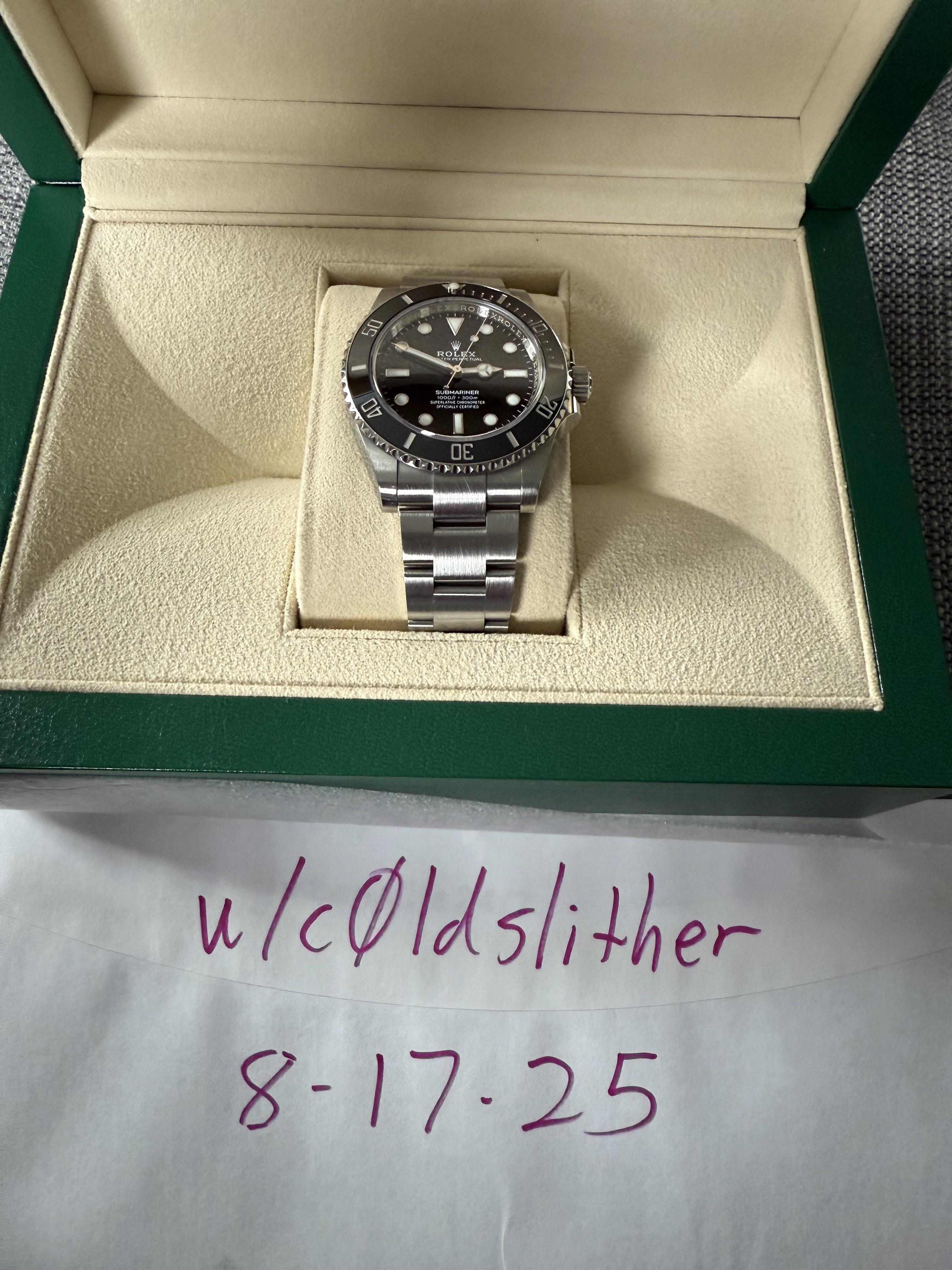 I have for sale my Rolex no-date Submariner (124060). Upgraded 41mm model. Watch was purchased from an AD and has a stamped/dated warranty card from 5/11/2022, so still under warranty. Watch is in overall 85% condition. There are surface scratches on the sides of the case, bracelet and clasp. Crystal and bezel are perfect. No dings or major issues, just a watch that has been worn and is ready to go anywhere at any time without worrying. From 3 feet away looks immaculate. Comes complete with all boxes, tags and card. Fully linked. Asking $11,250 including insured overnight shipping in the CONUS. Timestamp: https://imgur.com/gallery/KJ4gjcY#9ed0Wee Album: https://imgur.com/a/KJ4gjcY Note I have been selling on major watch forums for over 20 years as “outtatime”. Feel free to ask any questions or for references!