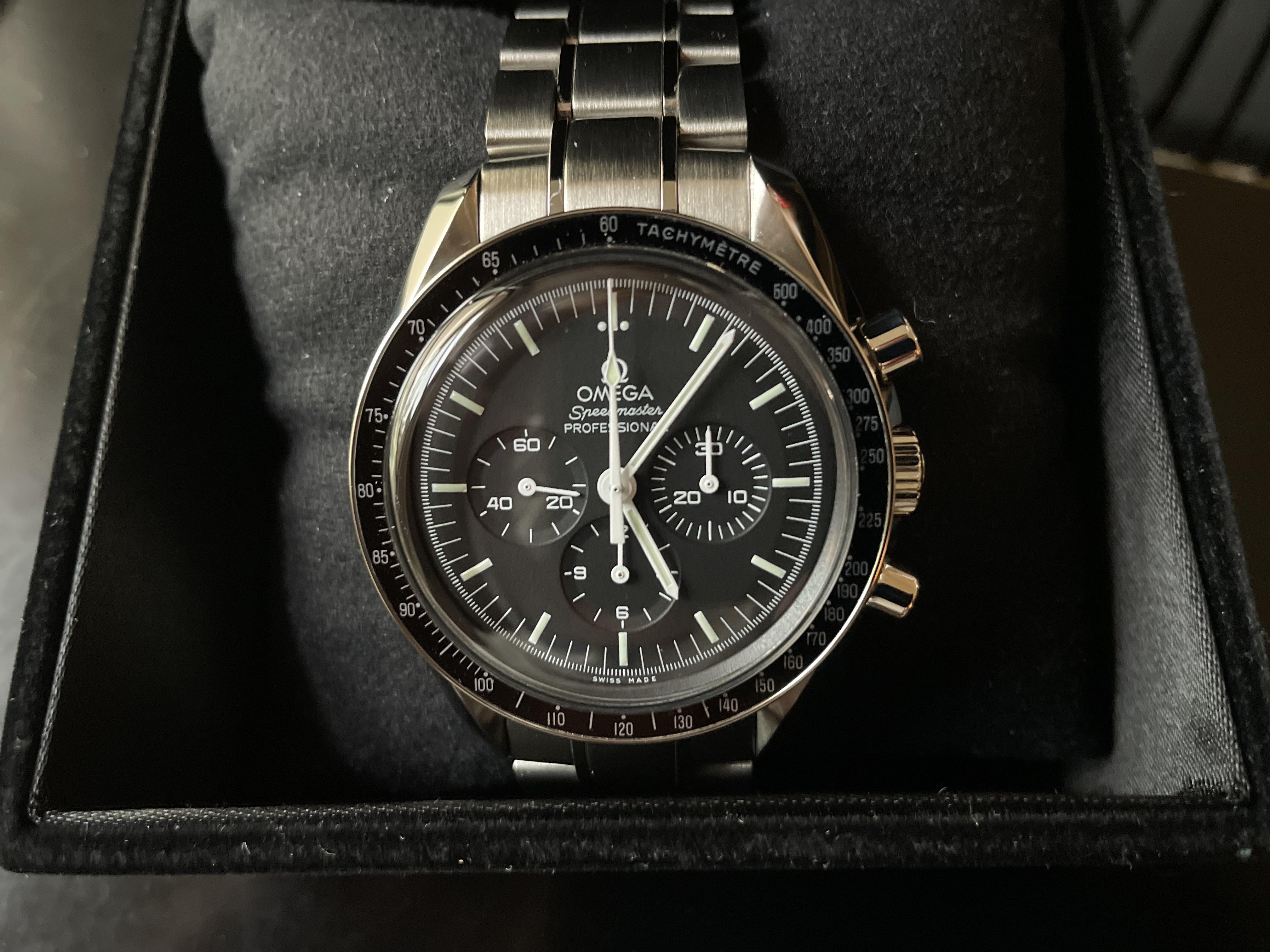 [WTS] Omega Speedmaster Professional 311.30.42.30.01.005 (price drop) Specs- Case: * Material: Stainless steel * Diameter: 42mm * Thickness: 13mm (14mm including the Seahorse medallion) * Lug-to-lug: 48mm * Crystal: Hesalite (plexiglass) * Bezel: Black with tachymeter scale * Water Resistance: 50 meters / 5 bar Dial: * Color: Black * Markers: Index * Subdials: Small seconds, 30-minute recorder, and 12-hour recorder * Luminescence: Luminous hands and hour markers Movement: * Type: Manual winding * Caliber: Omega 1861 * Power Reserve: 48 hours * Jewels: 18 Other Features: * Chronograph: Yes * Bracelet: Stainless steel bracelet with a fold-over clasp and push-button release * Weight: 81.7 grams Scope- Watch, pictogram card, original bill of sale, extra links, hang tag, manual Condition- Please see pics. Watch is from 2017. I see some marks on the clasp and caseback. Polished lug at 7pm has a tiny mark. Crystal looks good to me. Keeping excellent time. Asking $3800, including shipping in CONUS. Payment- Zelle, Venmo, other. Please see my feedback as pmnealhsd on Reddit (trying to get my name out of it), and as Scappamento on WUS. Thanks very much for looking. Please feel free to reach out to me at [email protected]. Pictures https://imgur.com/a/6o093CU Timestamp https://imgur.com/a/VWLFQPp