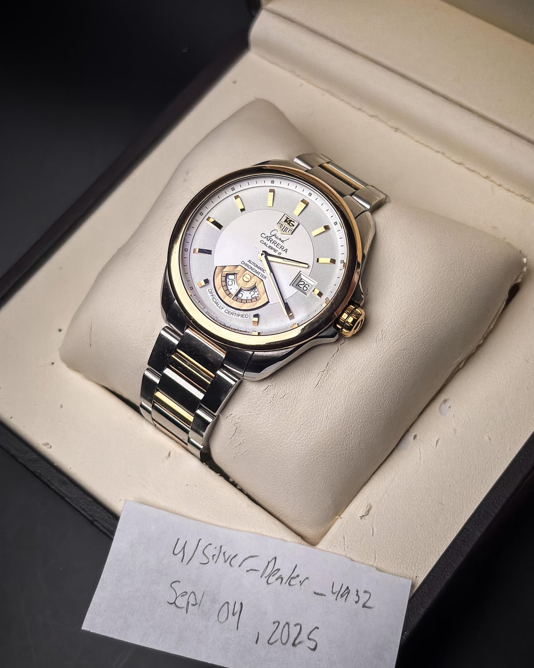 Condition: Excellent overall. Sapphire crystal is clean. Silver dial with gold-tone accents presents beautifully, with crisp and functional rotating disc seconds at 6 o’clock. Bezel shows light surface wear on polished gold-tone edge. Case has only minor hairlines from careful wear, no deep marks. Bracelet is near full length, includes two extra links (no pins), minimal stretch and light scuffing on clasp/center links. Runs smoothly and is COSC certified. Box & Papers: Watch with TAG Heuer presentation box and two extra links (no pins). No papers. Price: $1599 shipped via Zelle/wire. +$25 Venmo, +3.5% PayPal G&S. No trades. Shipping: Ships same or next business day. Timestamp: In photo set. ⸻ Overview: Up for sale is a TAG Heuer Grand Carrera Calibre 6 Ref. WAV515B — a 40mm stainless steel and gold-tone two-tone case with silver dial, gold hands/indices, and TAG’s signature rotating disc small seconds at 6 o’clock. Powered by the automatic Calibre 6 (COSC certified), with sapphire crystal and display caseback. A refined two-tone Carrera with strong wrist presence and premium finishing.